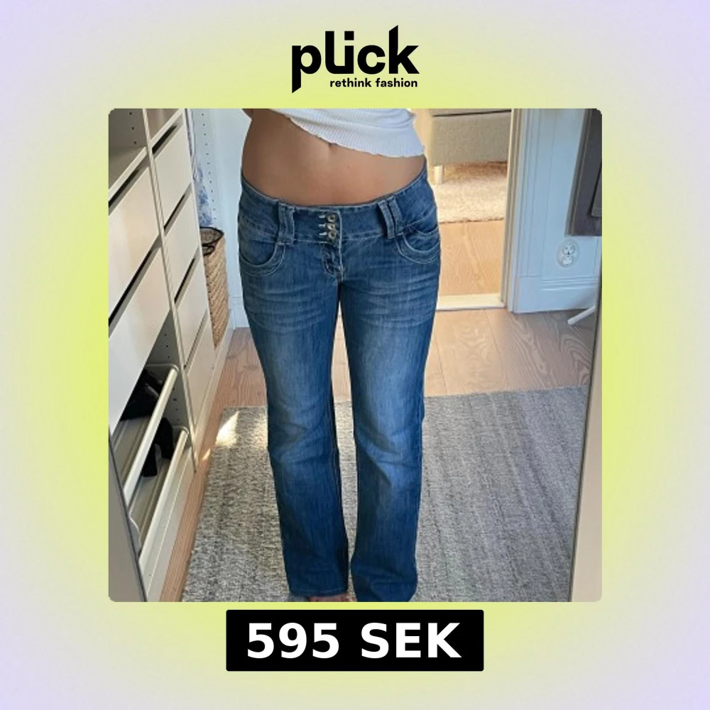 Blå jeans som är bootcut & low waist. Toppenskick! Midjemått: 38 cm, Innerbenslängd: 80 cm 💕