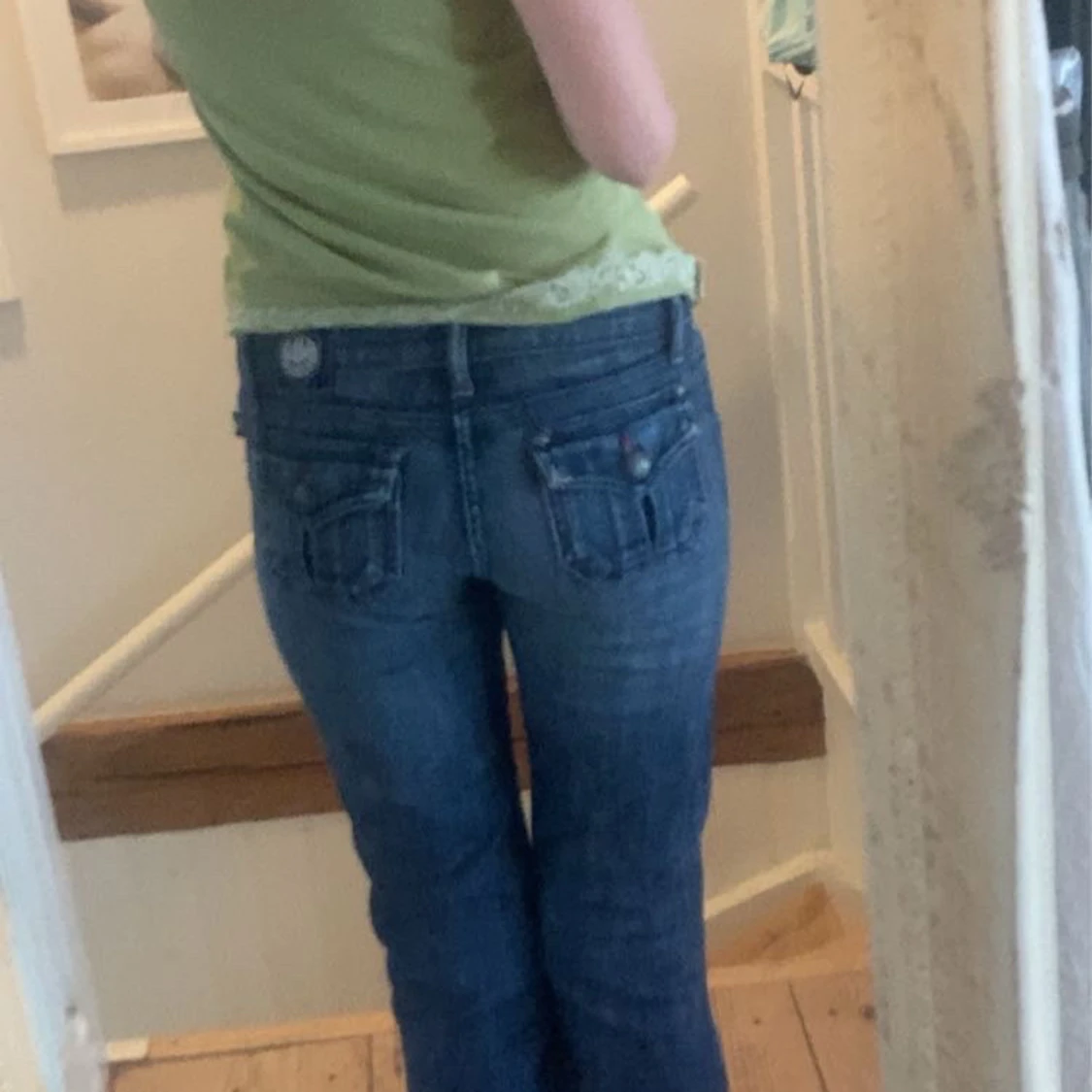 Säljer mina skit snygga mörkblå jeans från rock & republic. Jeansen är lågmidjade och är lite utsvängda men det syns inte då dom är för långa för mig. Jag är 1,63. Storlek 26/XS