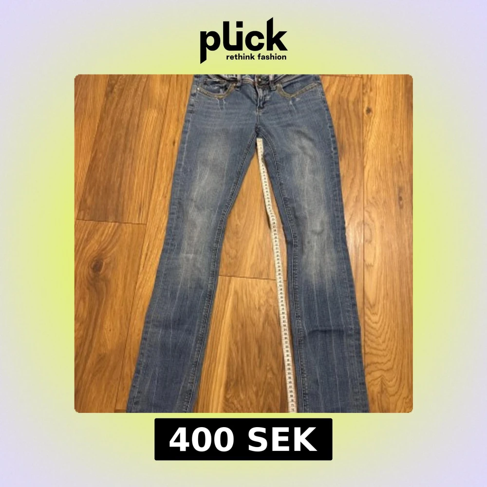 Säljer ett par blå jeans med snyggt slitna detaljer och coola guld-broderier samt paljetter på bakfickorna. Jeansen har låg midja, klassisk femficksmodell och raka ben. Perfekta för dig som vill sticka ut lite extra med detaljer på fickorna.