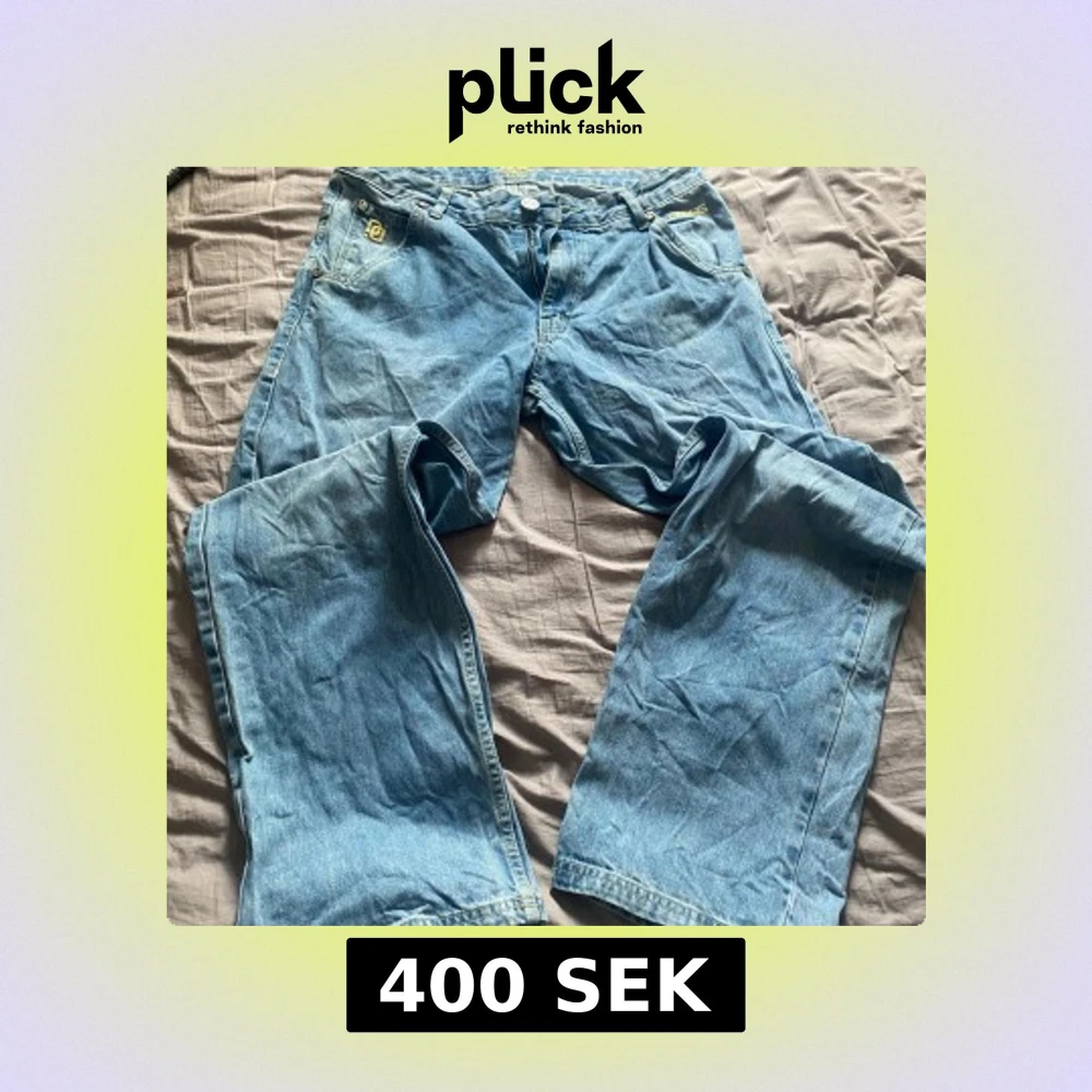 Säljer ett par blå jeans från DNGRS i loose fit-modell. Byxorna har breda ben, klassisk femficksdesign och snygga gula broderier samt logga på bakfickan och framtill. Perfekta för dig som gillar en avslappnad och baggy stil.