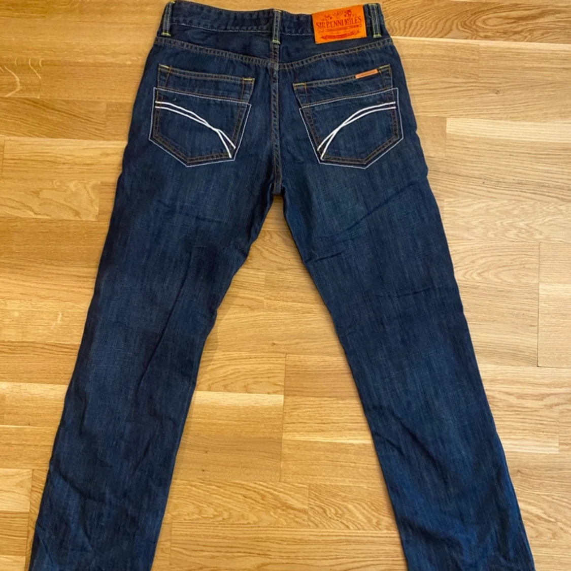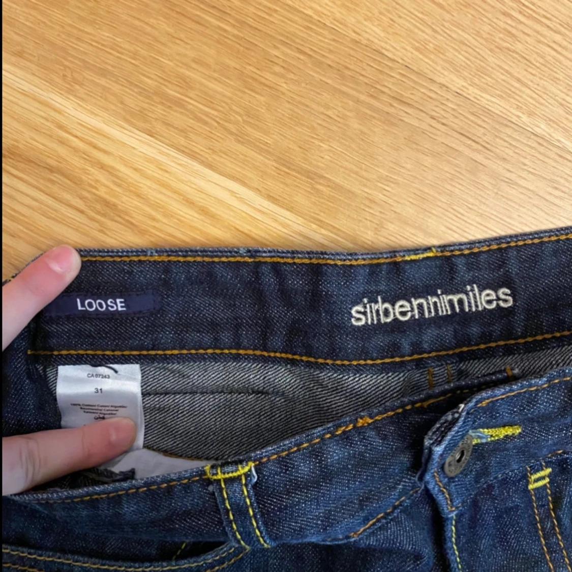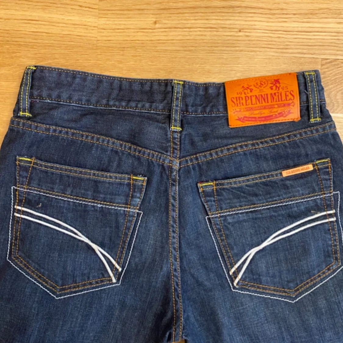 Säljer ett par blå jeans från Sir Benni Miles med loose fit. Jeansen har snygga kontrastsömmar, klassiska fem fickor och unika vita detaljer på bakfickorna. Märkespatch i orange baktill och gylf med knapp. Perfekta för en avslappnad streetstil.