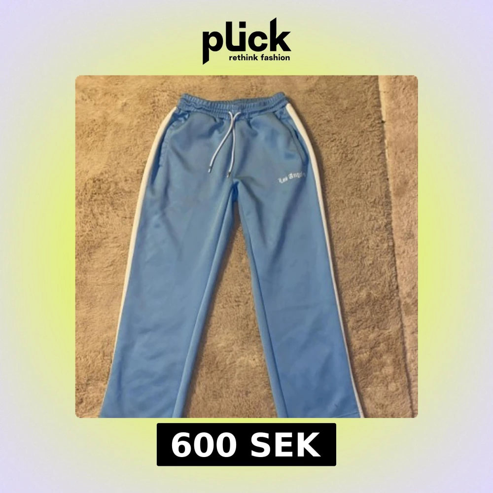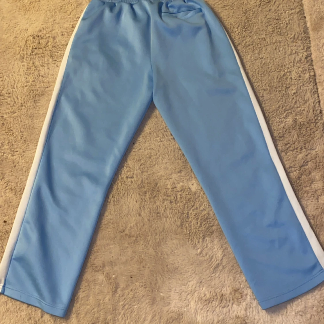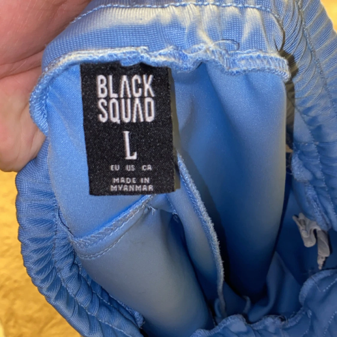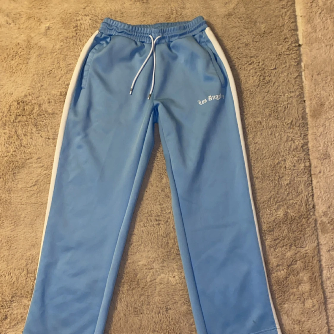 Snygga ljusblå mjukisbyxor från Black Squad i storlek L. Byxorna har vita sidoränder, snörning i midjan och texten 'Los Angeles' broderad på vänster ben. Perfekta för chill eller träning, med mjukt syntetmaterial och normal passform. Pris kan diskuteras