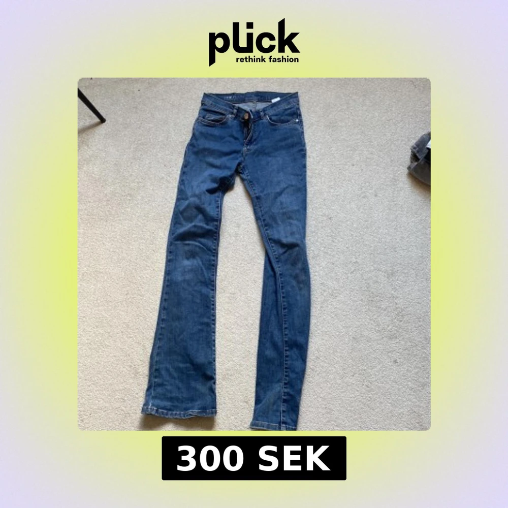 Säljer ett par blå jeans med låg midja och flare-ben. Jeansen har klassisk femficksdesign och slitna detaljer vid bensluten för en cool, avslappnad look. Perfekta för dig som gillar retrovibbar och vill ha ett par jeans med lite edge.