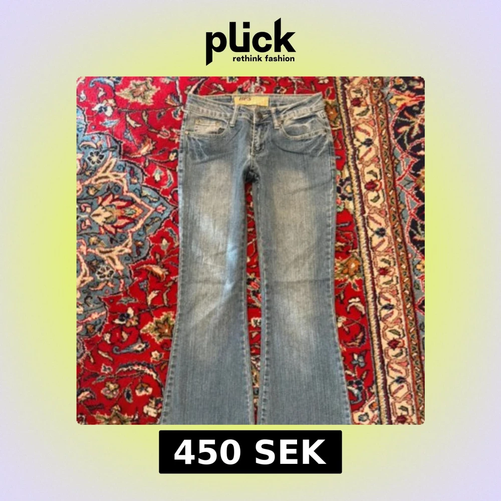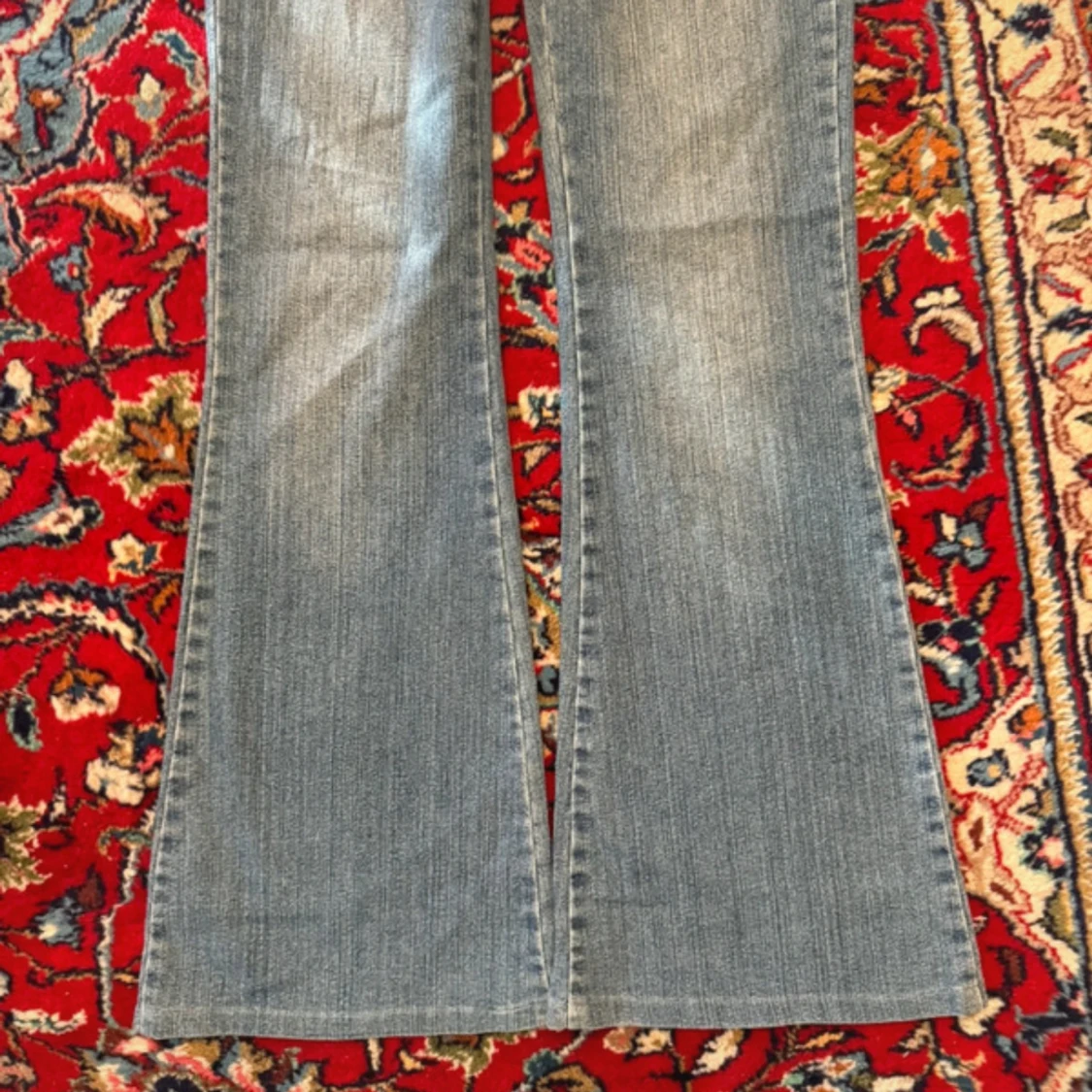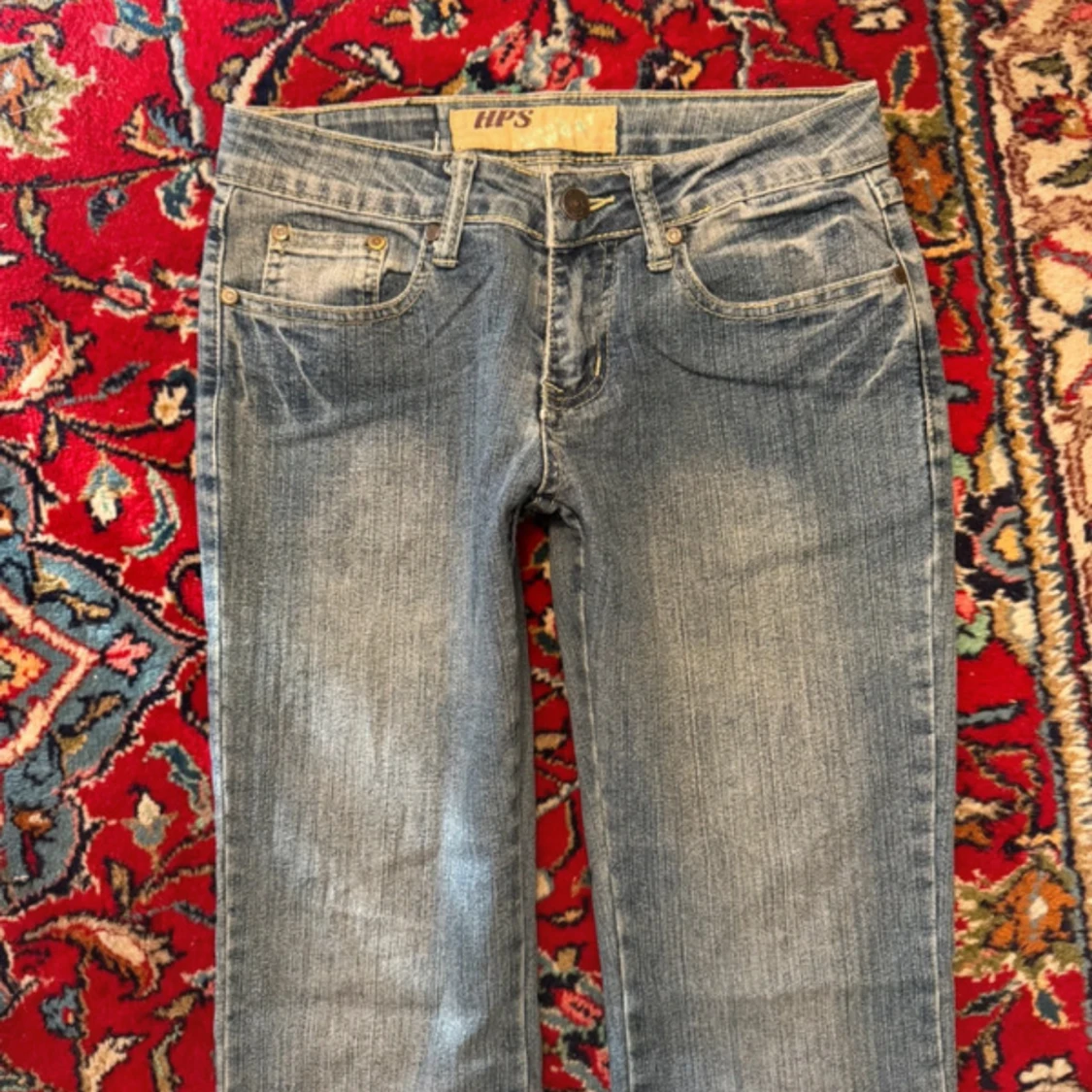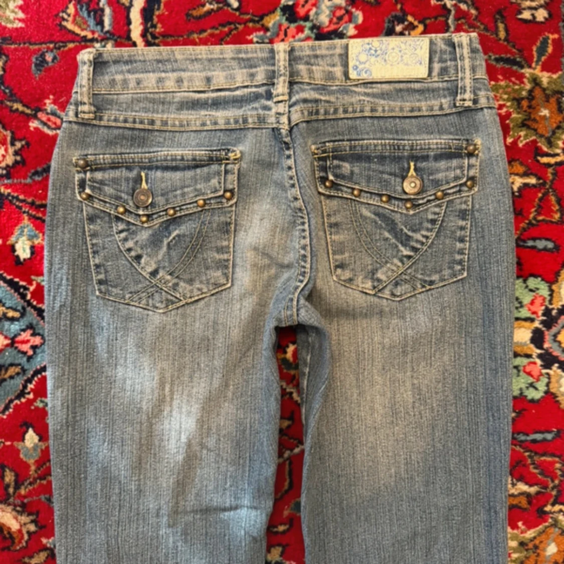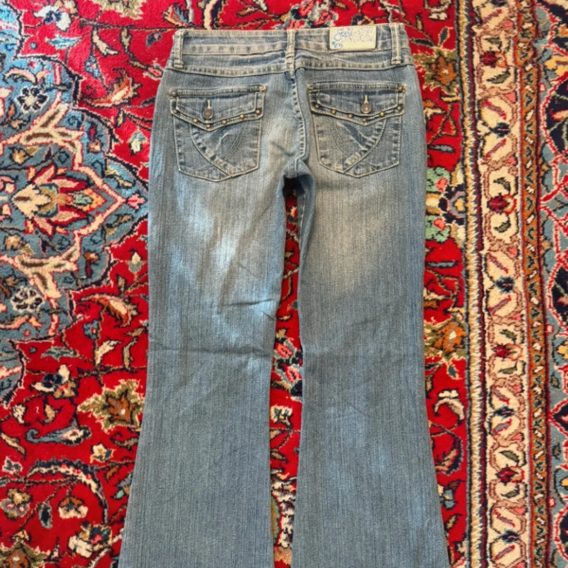 Snygga blå bootcut jeans från HIPS med slitningar och coola nitar på bakfickorna. Midja:34 Stuss:38 Gren:19 Lårbredd:21 Innerbenslängd:76 Benvidd:27