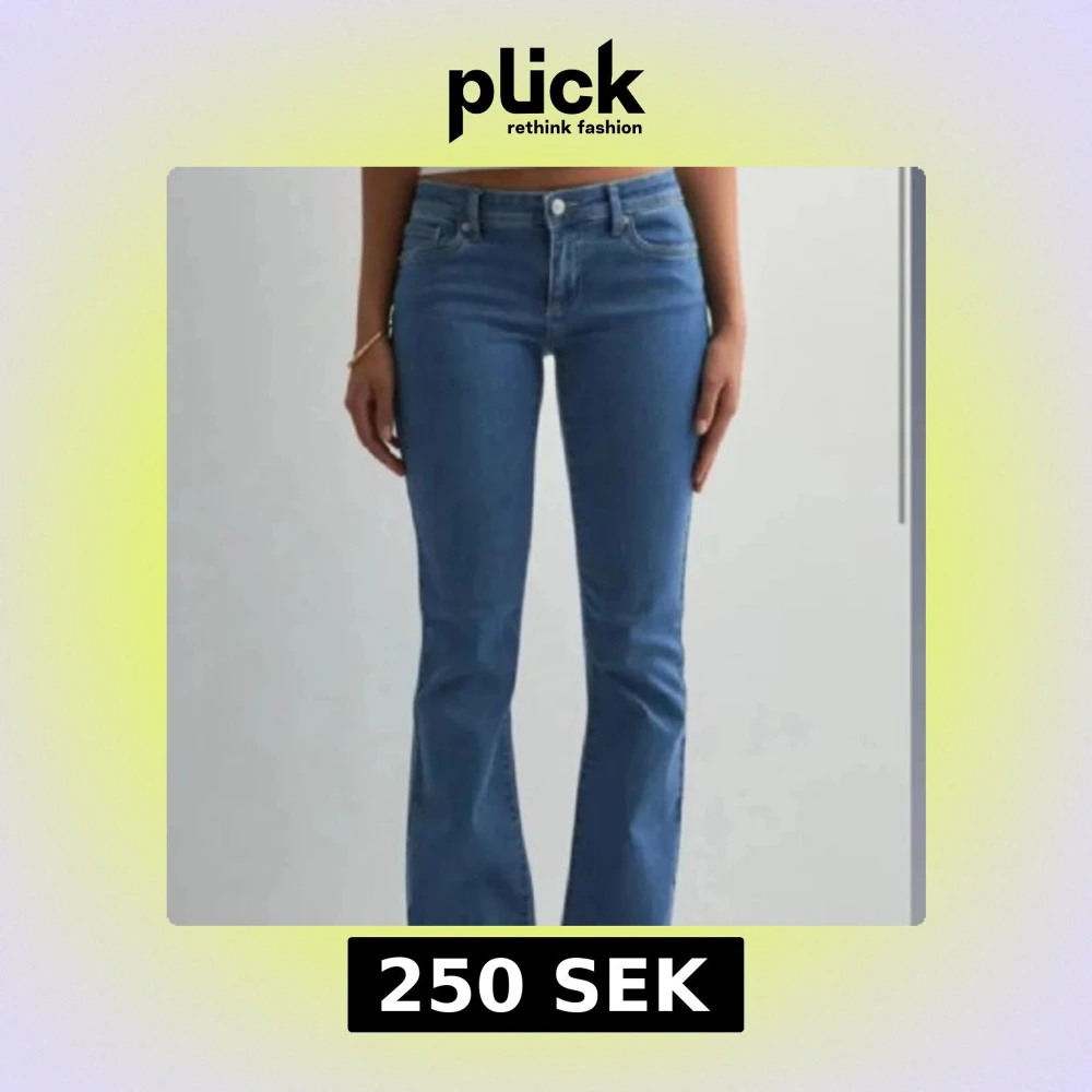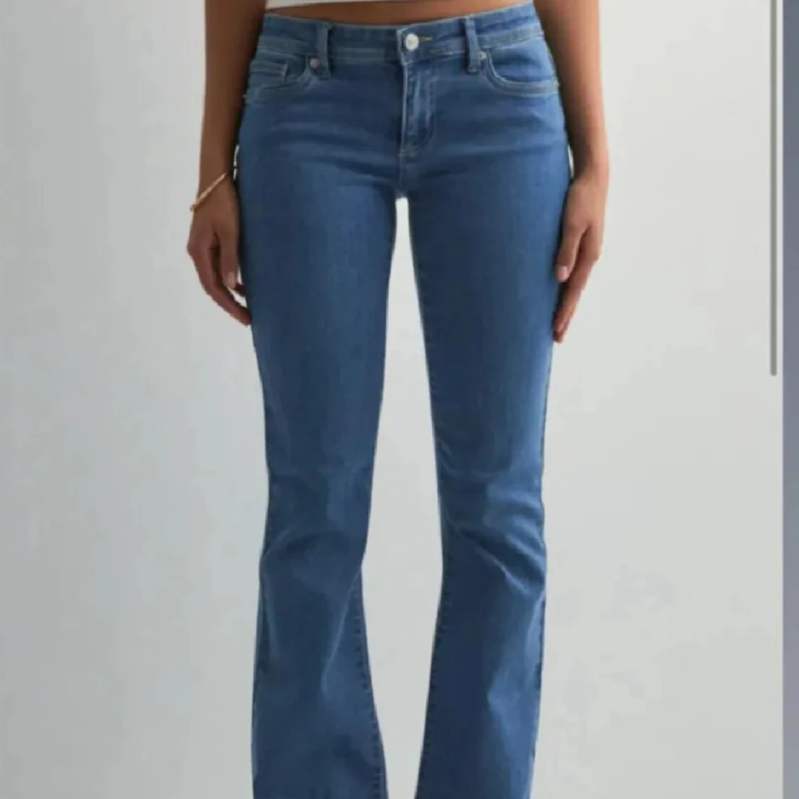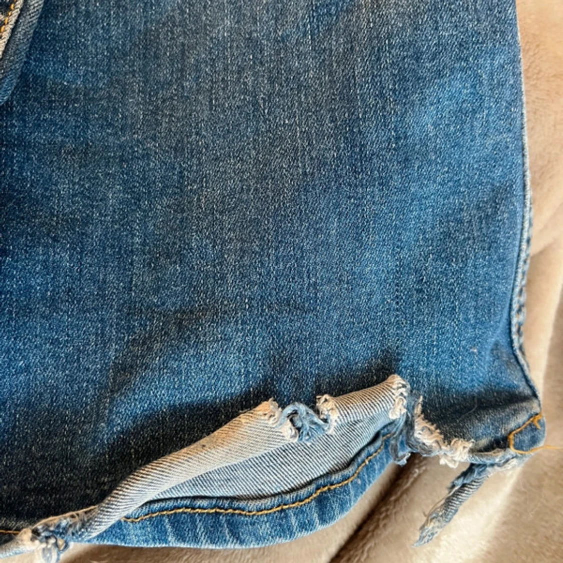 Så snygga blåa low waist jeans! De är slitna vid låret som som syns på bild två, men även slitningar längst ner vid benen på bild tre. Storlek xs/34