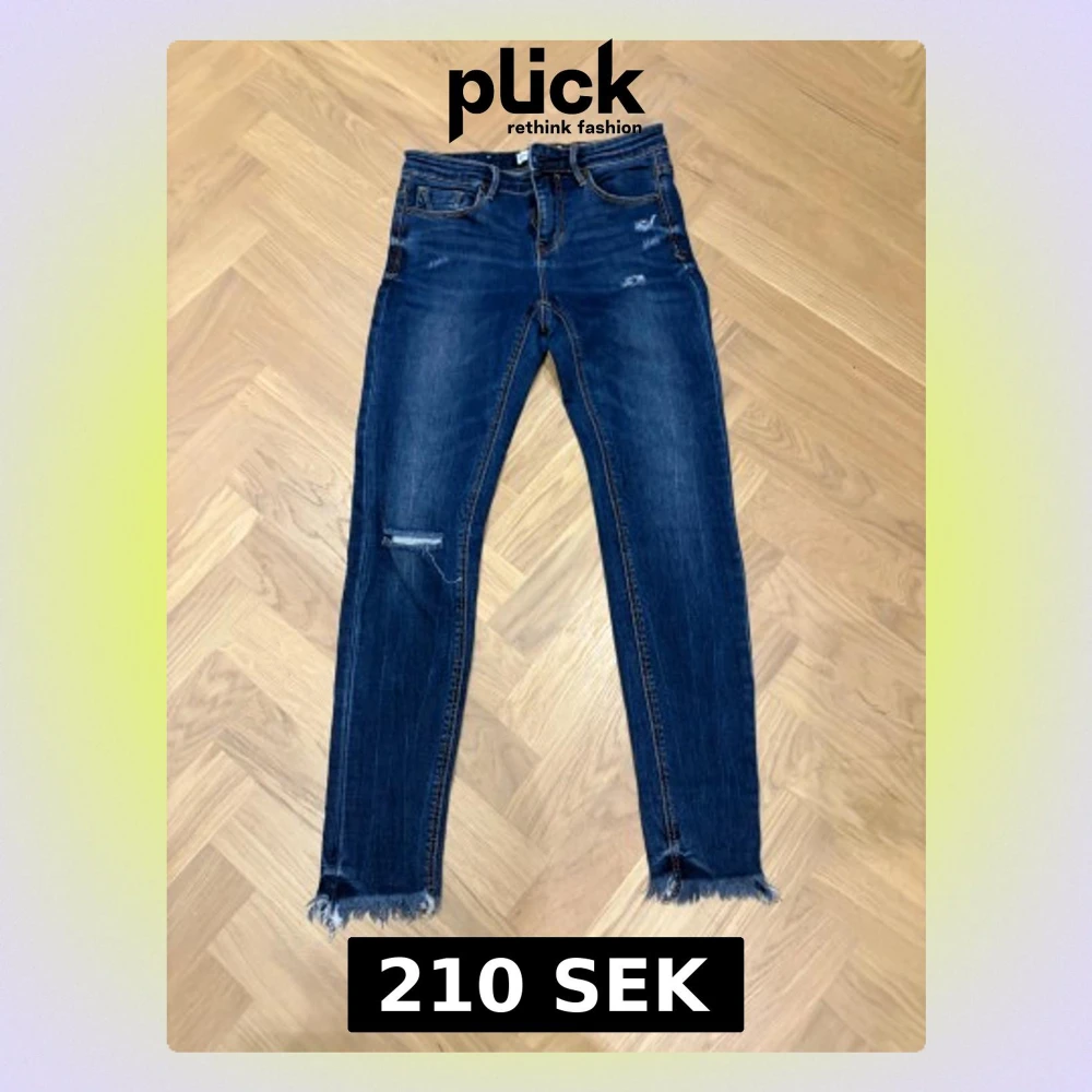 Snygga blå jeans från Stradivarius i low waist-modell, storlek 36. De har slitningar och hål på ena benet samt fransade benslut för en cool vibe. Klassisk femficksdesign och kontrastsömmar. Perfekta för dig som gillar en avslappnad och trendig stil.