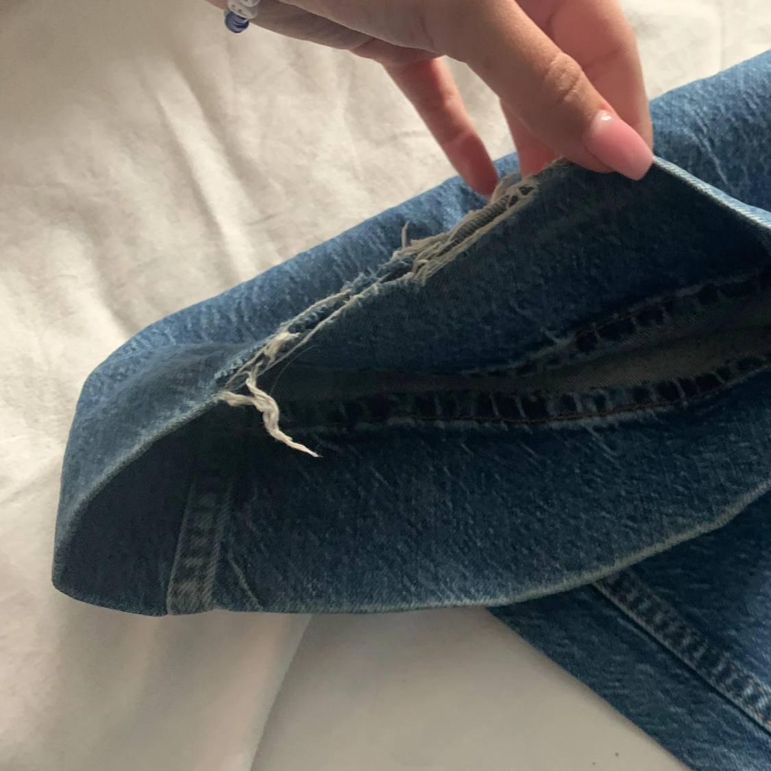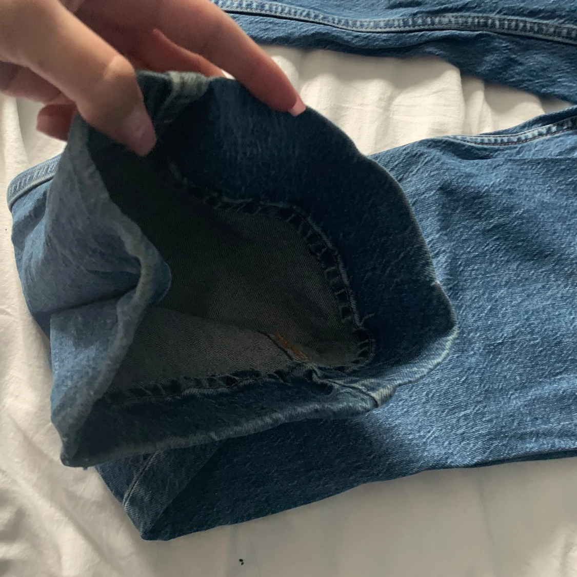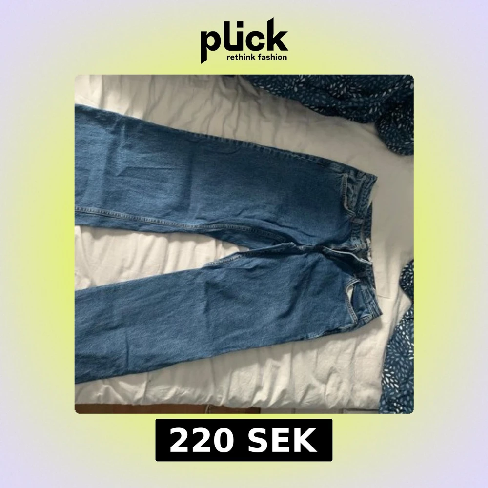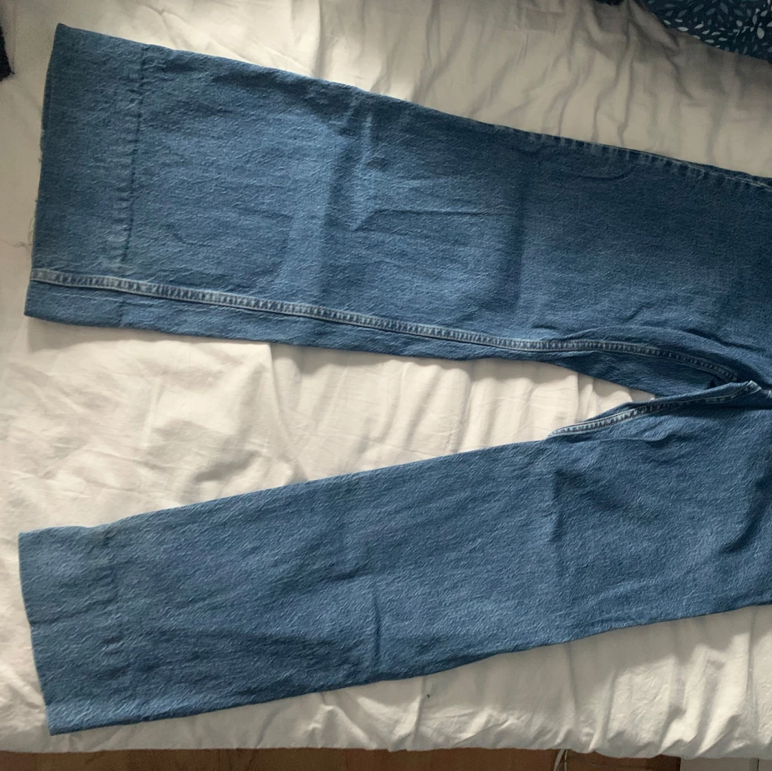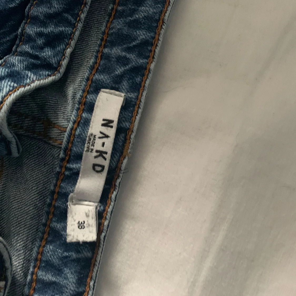 Trendiga jeans från NAKD💙💙 uppsydda 7cm och perfekt längd för 160-165cm🥰 finns en del slitningar nere vid fötterna men det är inget man tänker på 😇