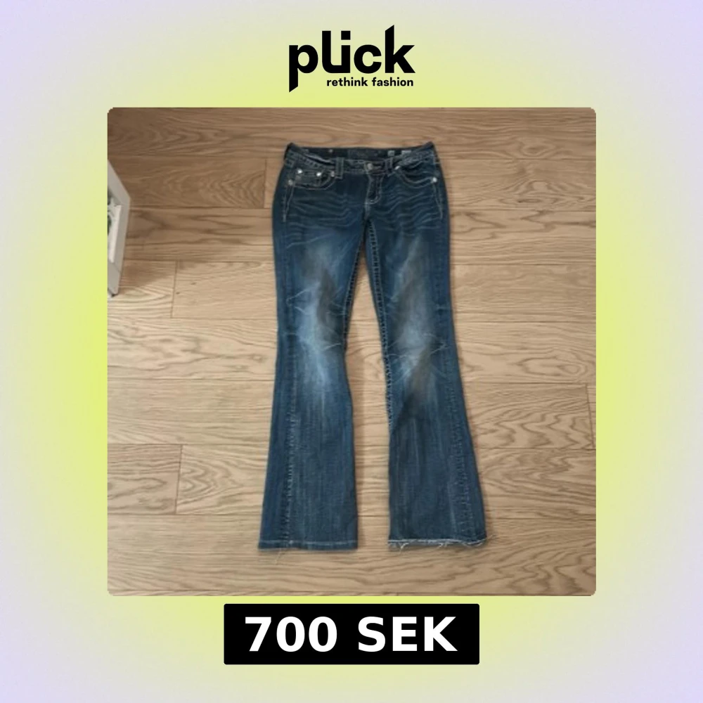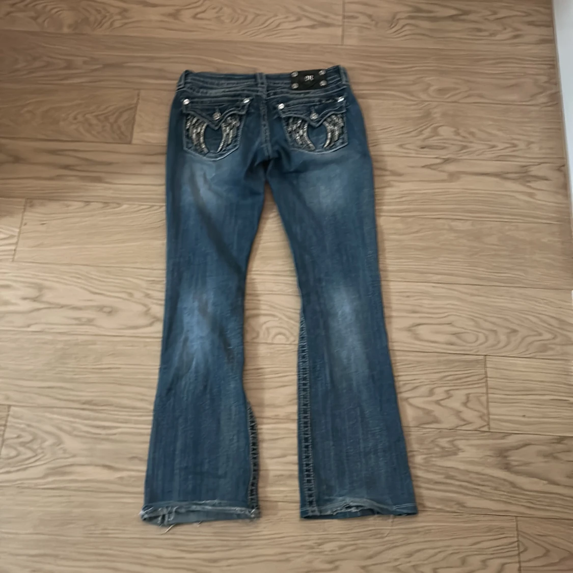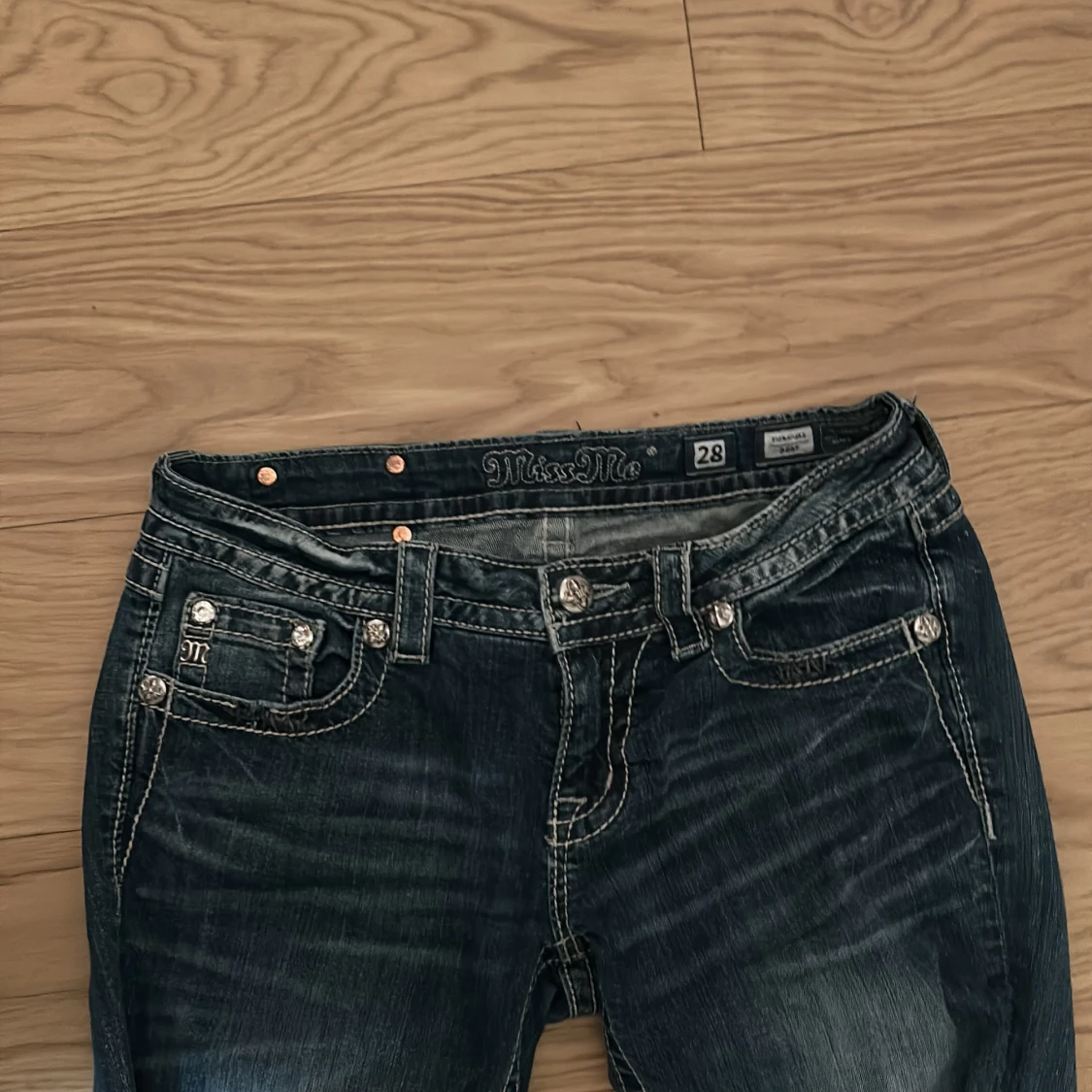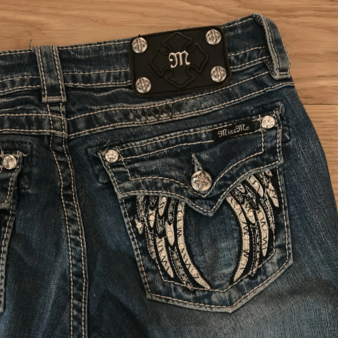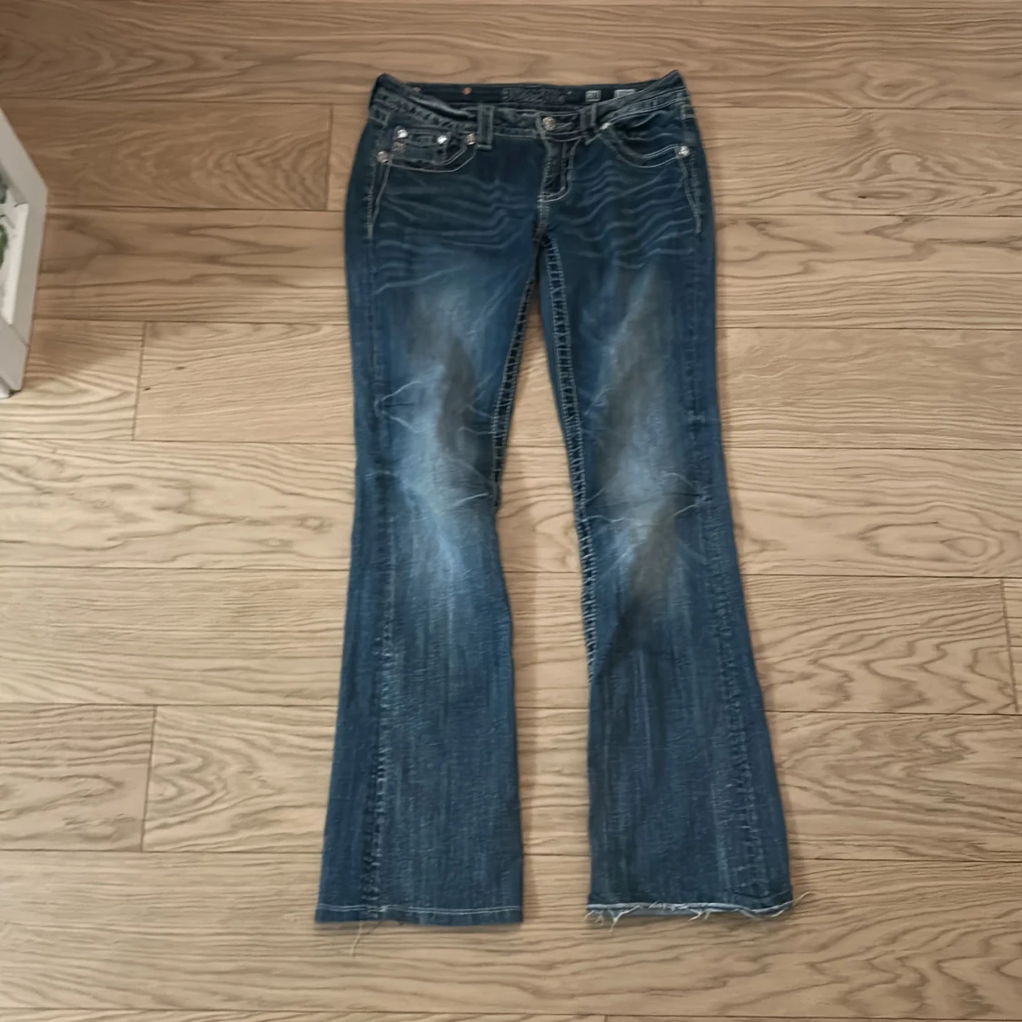 Säljer ett par blå jeans från Miss Me med snygga broderade detaljer och nitar på bakfickorna. Jeansen har bootcut-modell och klassisk femficksdesign. Märkeslogga på bakre linningen och slitningar framtill för en cool look.