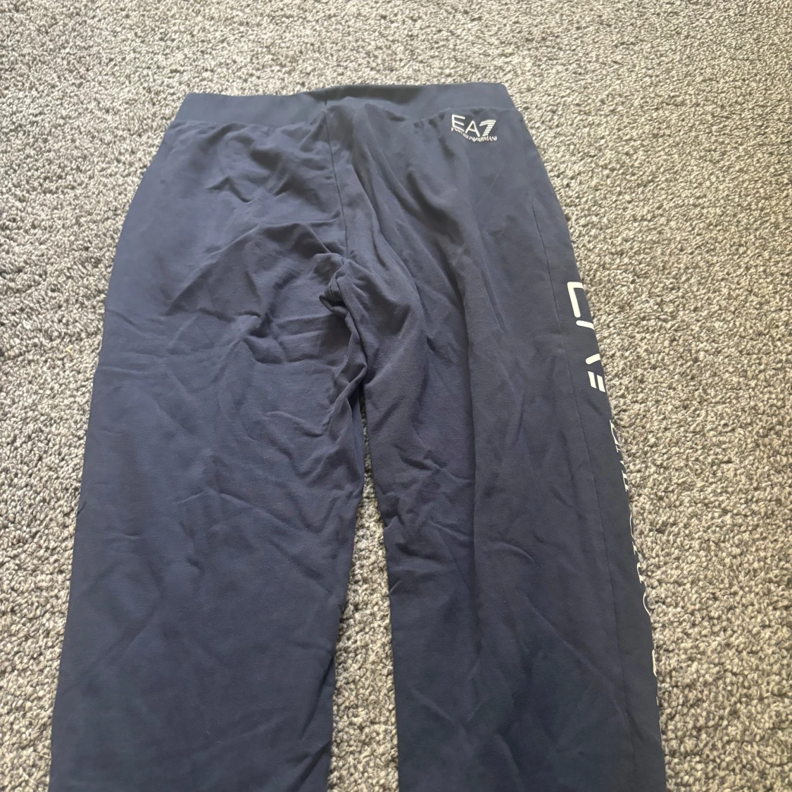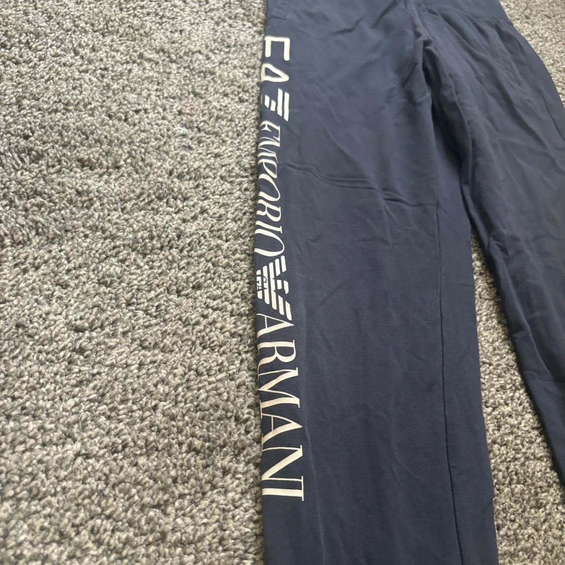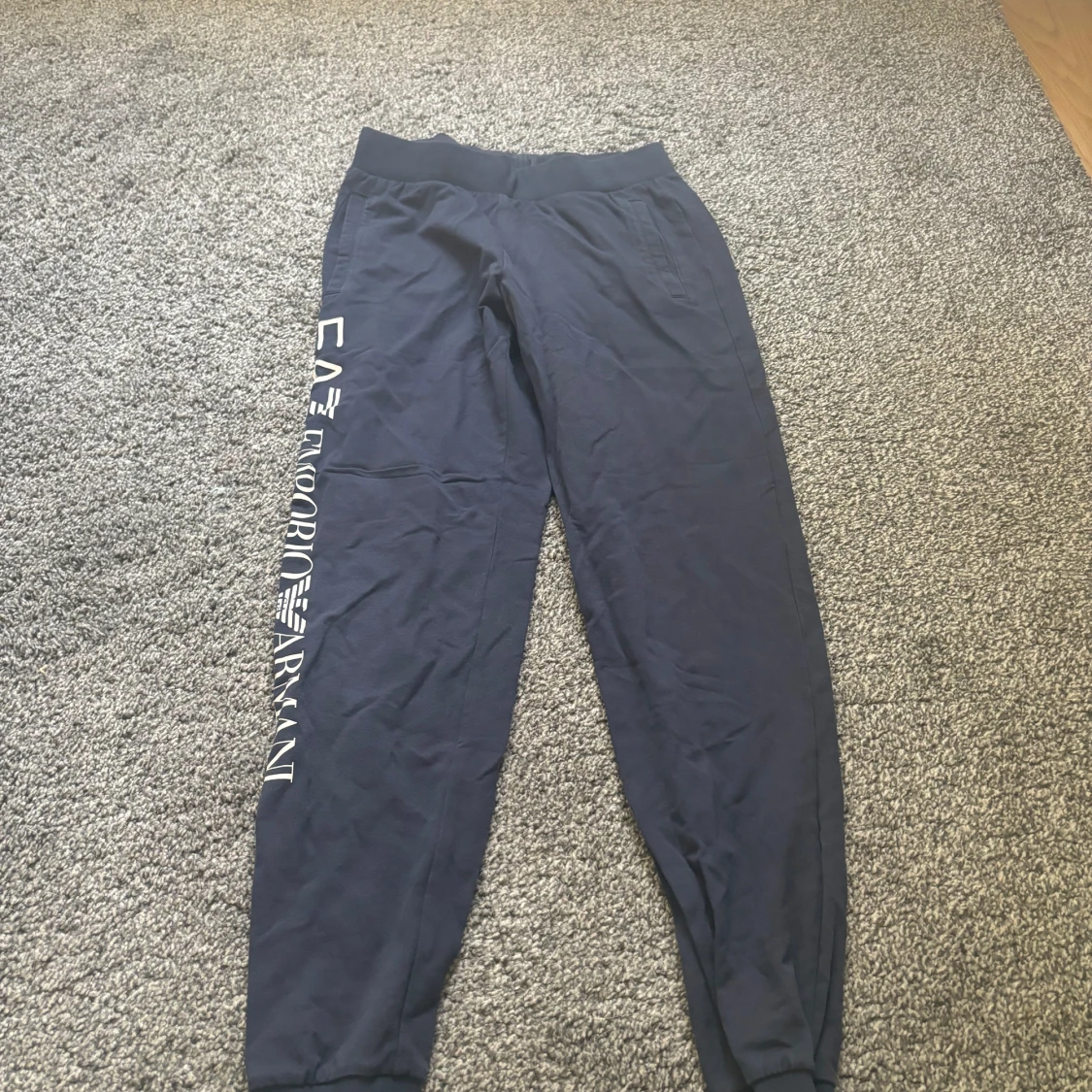 Säljer ett par snygga blå mjukisbyxor från Emporio Armani. De har en elastisk midja och loggan tryckt längs benet. Perfekta för en avslappnad stil eller träning. Byxorna är i bra skick och superbekväma!