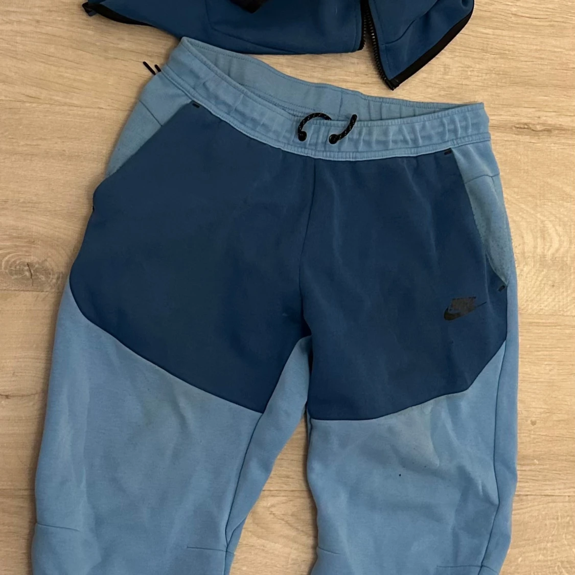 Snygga blå mjukisbyxor från Nike med dragsko i midjan och två stora fickor framtill. Byxorna har en sportig look med mörkare blå partier upptill och ljusare blå nedtill. Perfekta för en avslappnad stil eller träning.