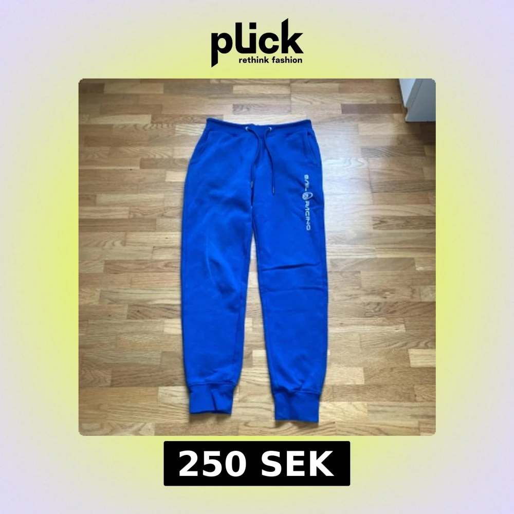 Blå mjukisbyxor från Sail Racing med vit logga längs benet. Byxorna har snörning i midjan, muddar vid bensluten och fickor fram samt en bakficka. Sköna och sportiga, perfekta för chill eller träning.