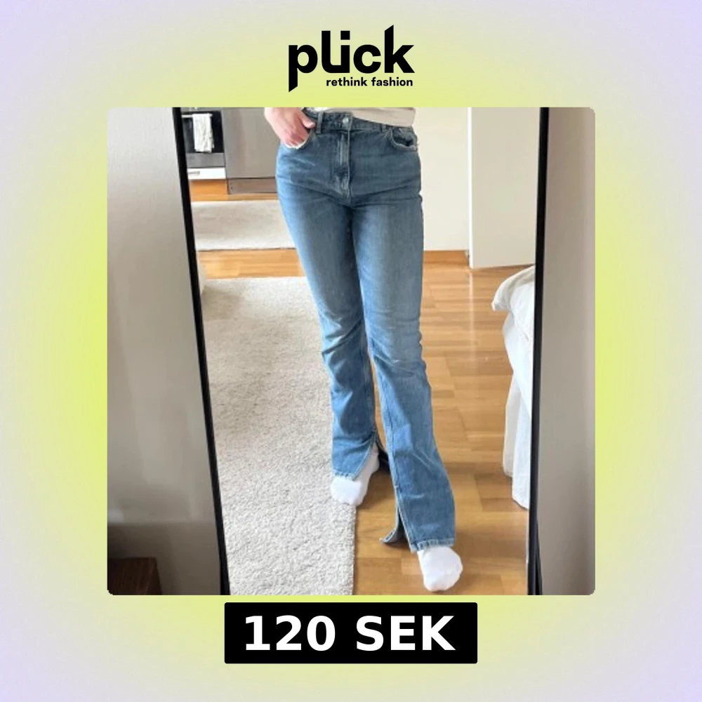 Säljer ett par klassiska blå jeans från rak-passform och hög midja. Jeansen har fem fickor, dragkedja och knapp framtill. Perfekta till sneakers eller boots för en avslappnad look.