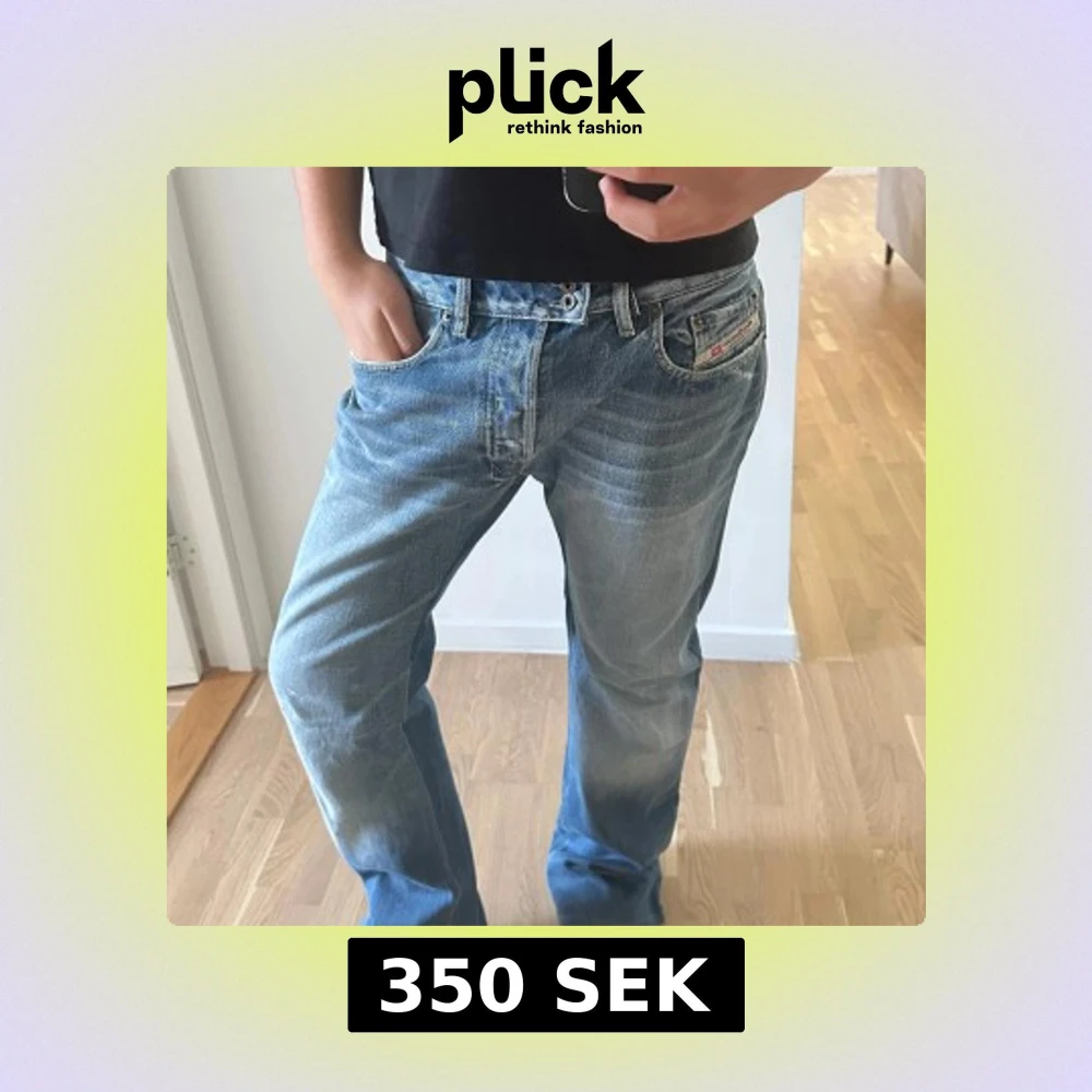 Säljer ett par klassiska blå jeans från Diesel med raka ben och snyggt slitna detaljer. Jeansen har fem fickor, normal passform och tydliga tvättade partier framtill. Perfekta för dig som gillar en avslappnad och tidlös look.