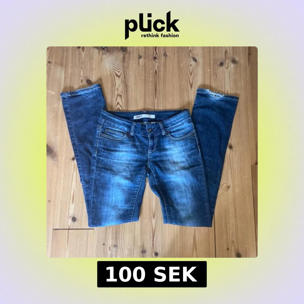 Säljer ett par blå skinny jeans från ONLY med snygga slitningar och klassisk femficksdesign. Jeansen har låg midja och är tillverkade i stretchigt denim för en tight passform. Perfekta för dig som gillar en smal siluett och cool tvätt.