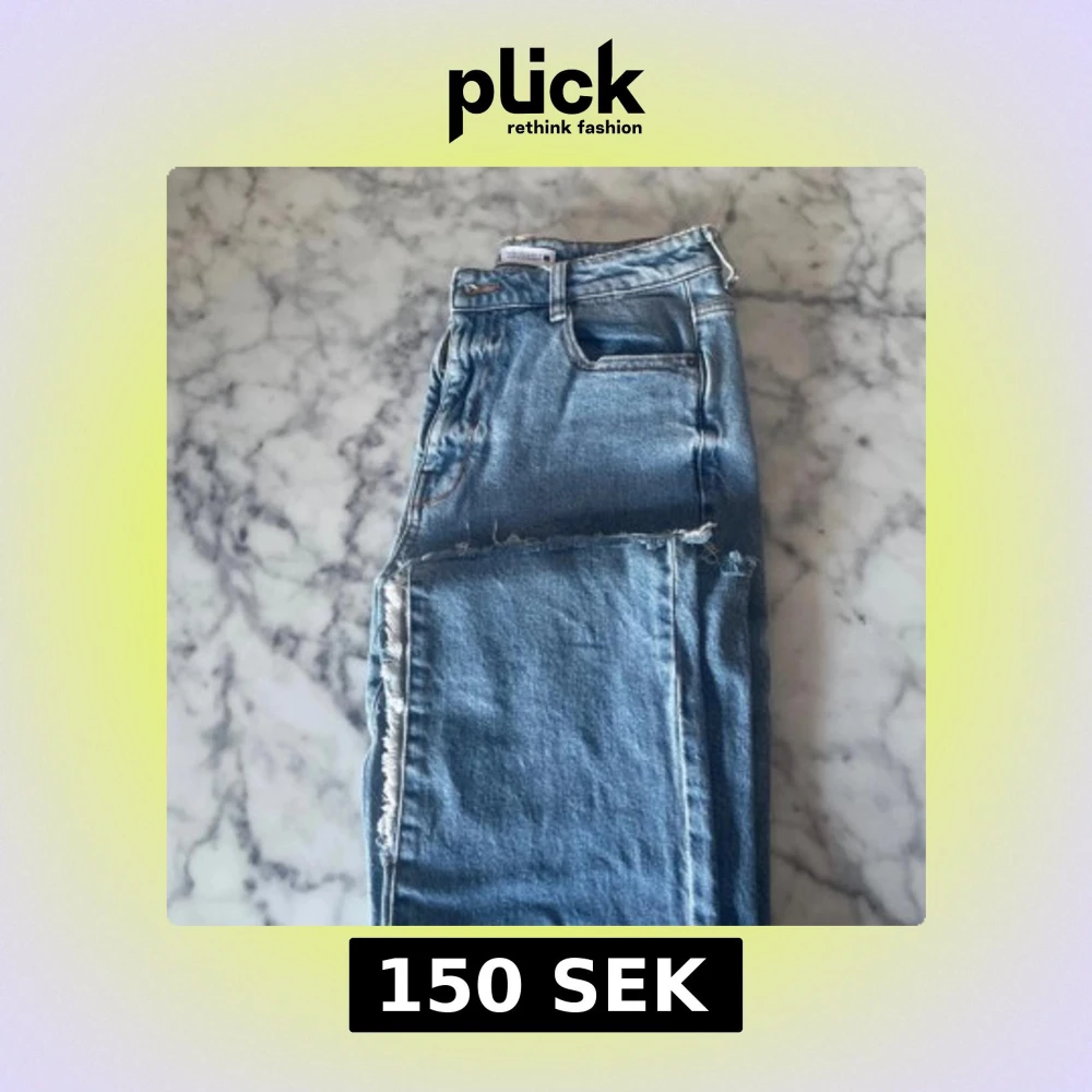 Säljer ett par blå jeans med slitna detaljer längs benen. Hög midja och dragkedja. Använda ett fåtal gånger.