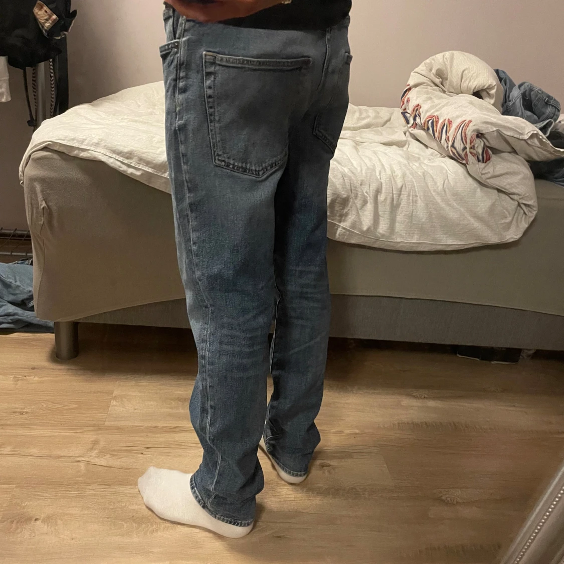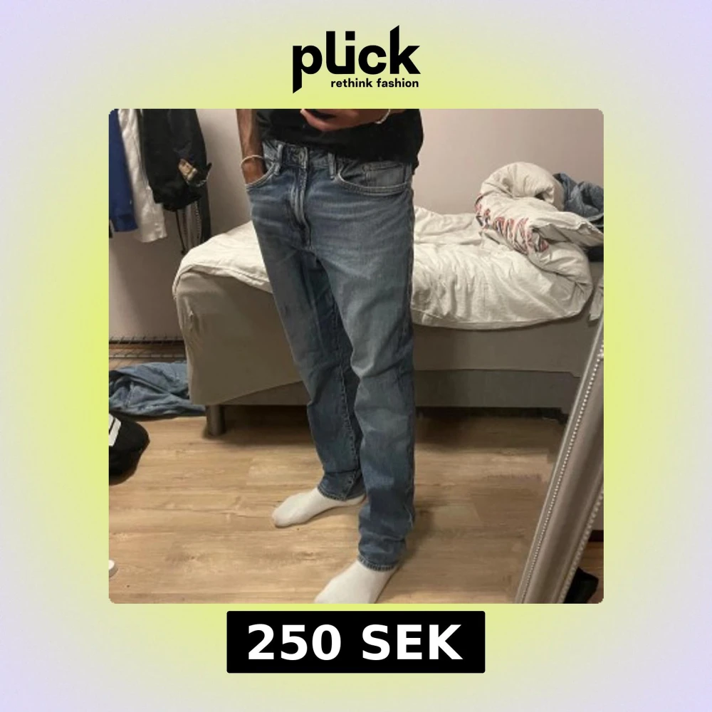 Säljer ett par klassiska blå jeans från H&M i regular fit. Jeansen har raka ben, fem fickor och snygga kontrastsömmar. Perfekta för dig som gillar en enkel och tidlös look. Tillverkade i bomull för skön känsla hela dagen.
