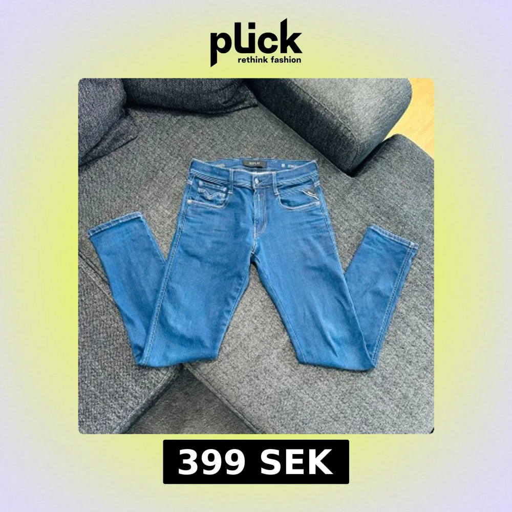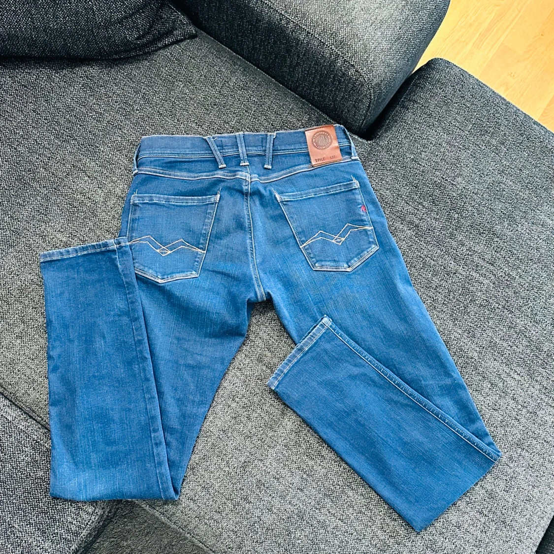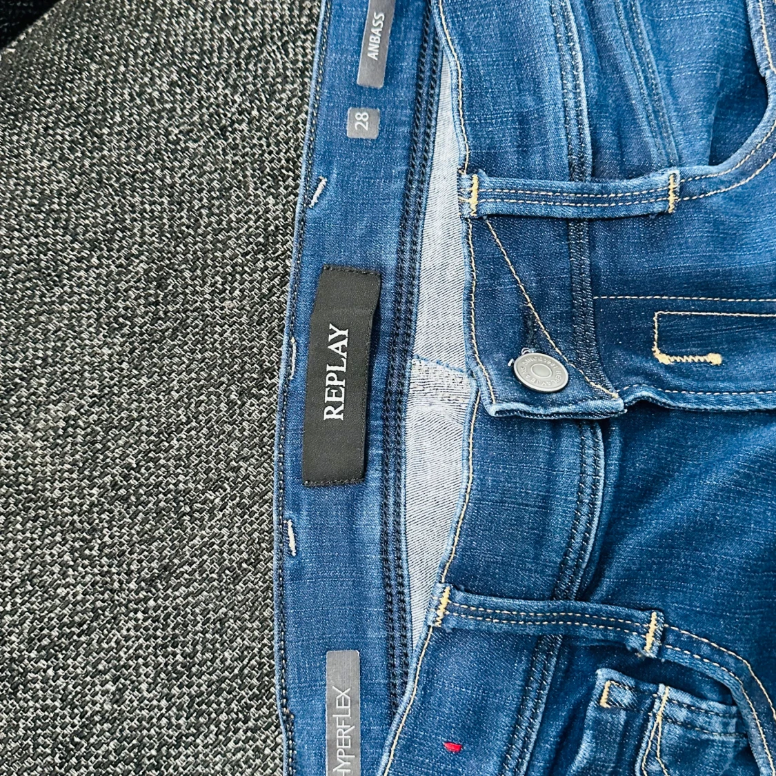 Säljer ett par blå Replay Anbass jeans i modellen Hyperflex. Jeansen har klassisk femficksdesign, normal passform och raka ben. Perfekta för dig som vill ha bekväma och stilrena jeans till vardags.