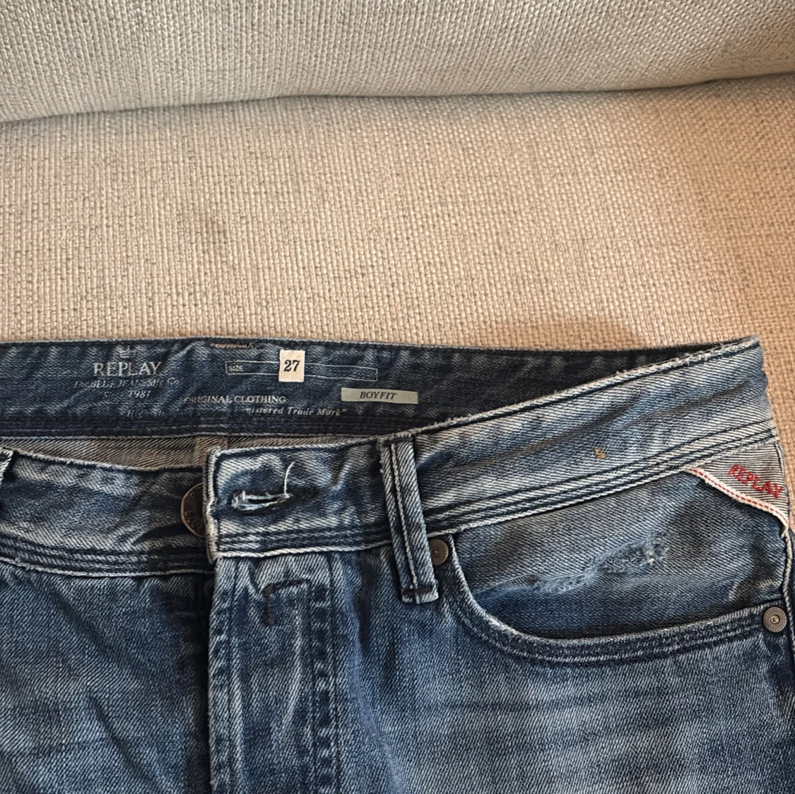 Säljer ett par blå Replay Boyfit jeans i klassisk tvätt med snygga slitningar och detaljer. Jeansen har raka ben, fem fickor och tydliga Replay loggor. Kontakta om du är intresserad.