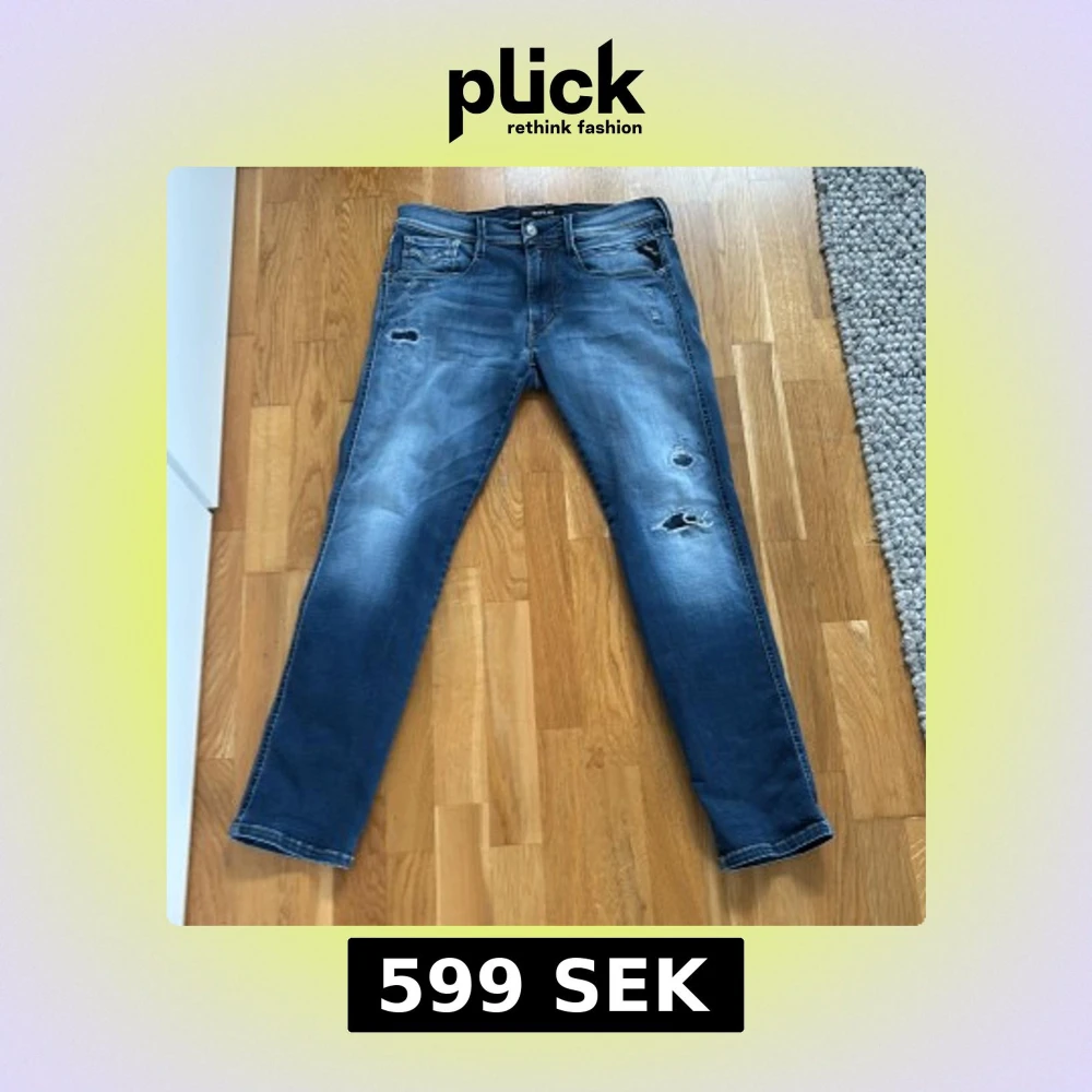 Säljer ett par blå Replay Hyperflex jeans med snygga slitningar och lätt tvättad look. Klassisk femficksmodell. Perfekta för dig som gillar en avslappnad men trendig stil.