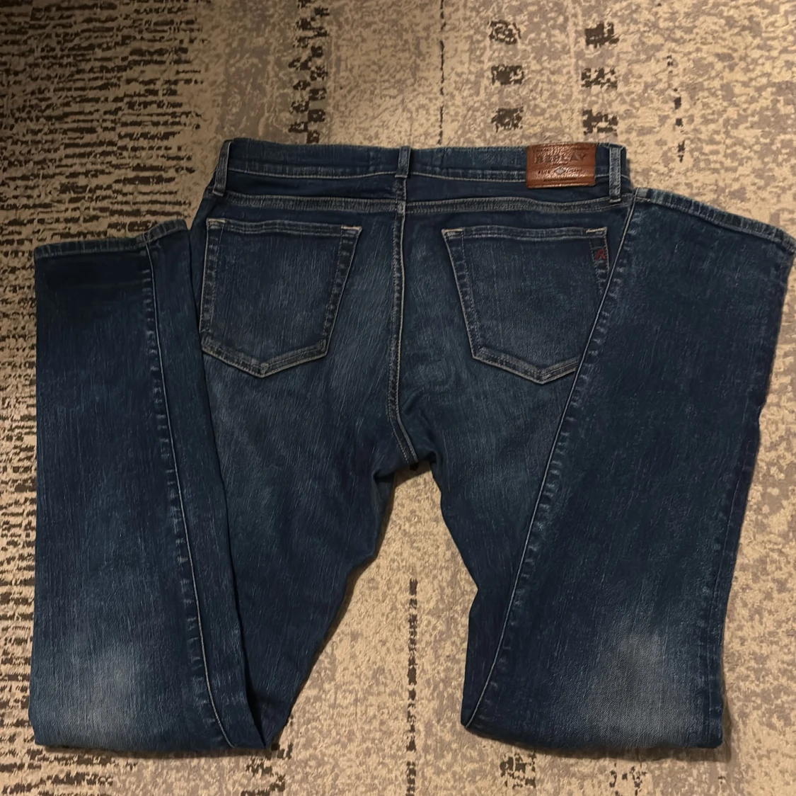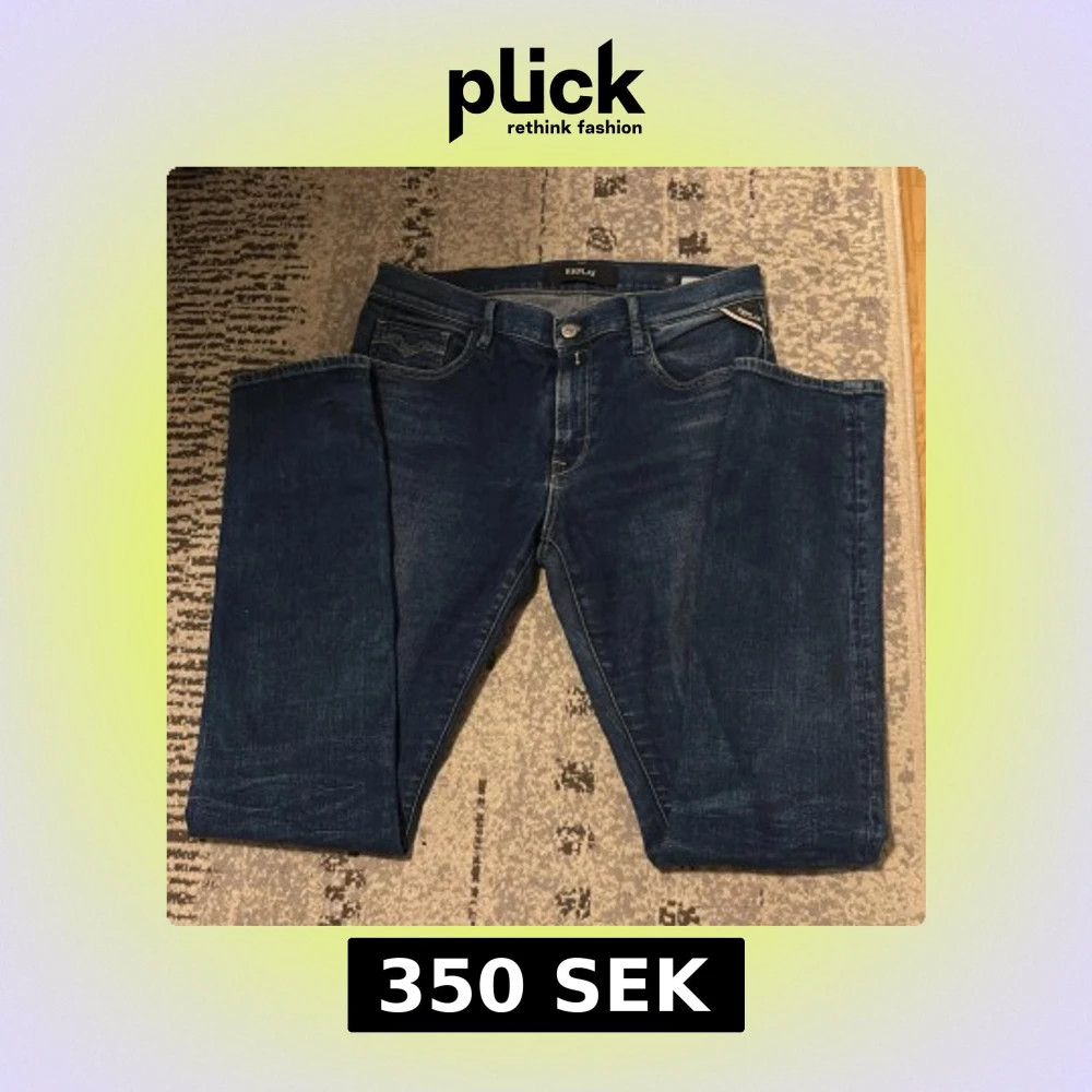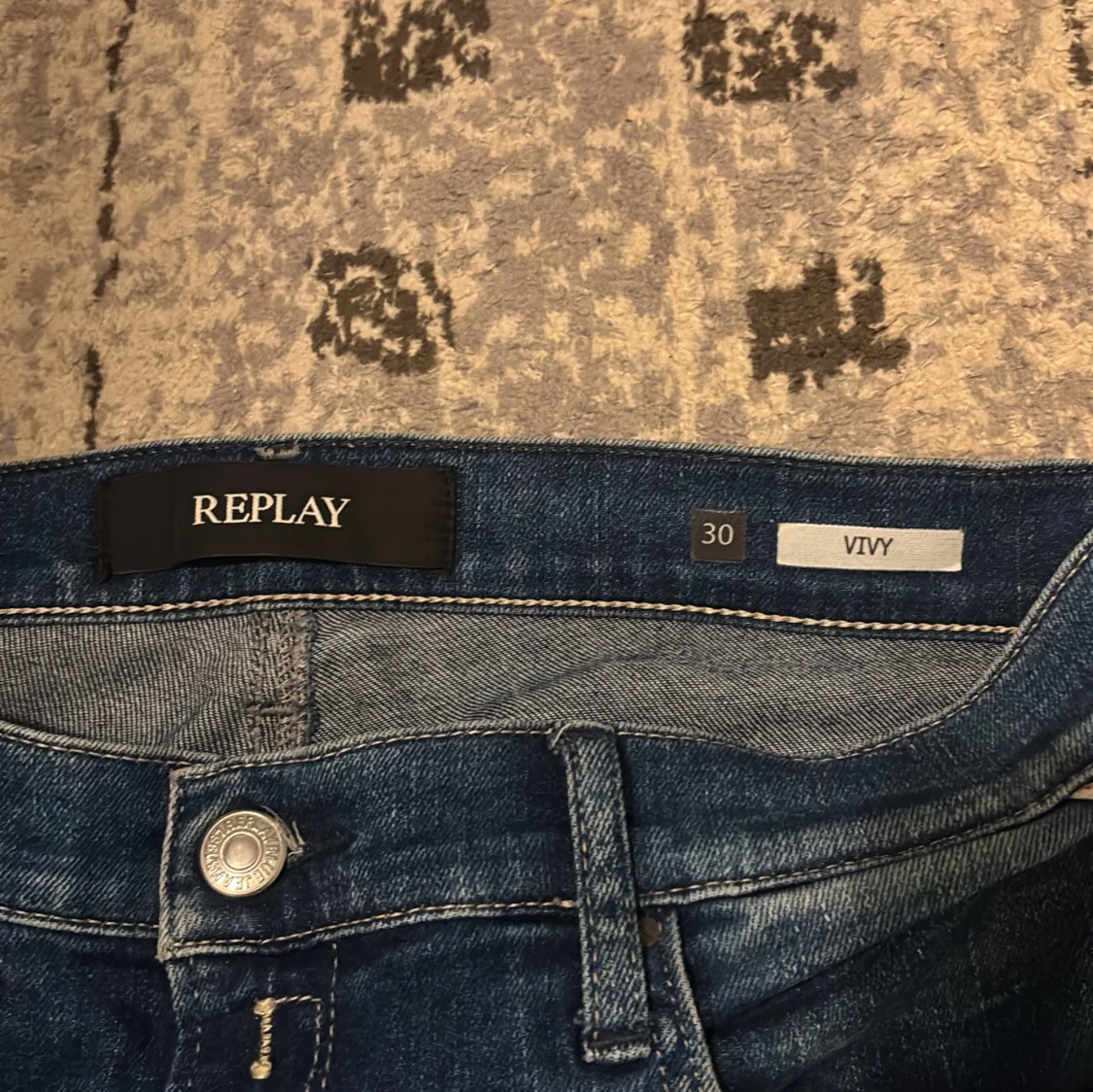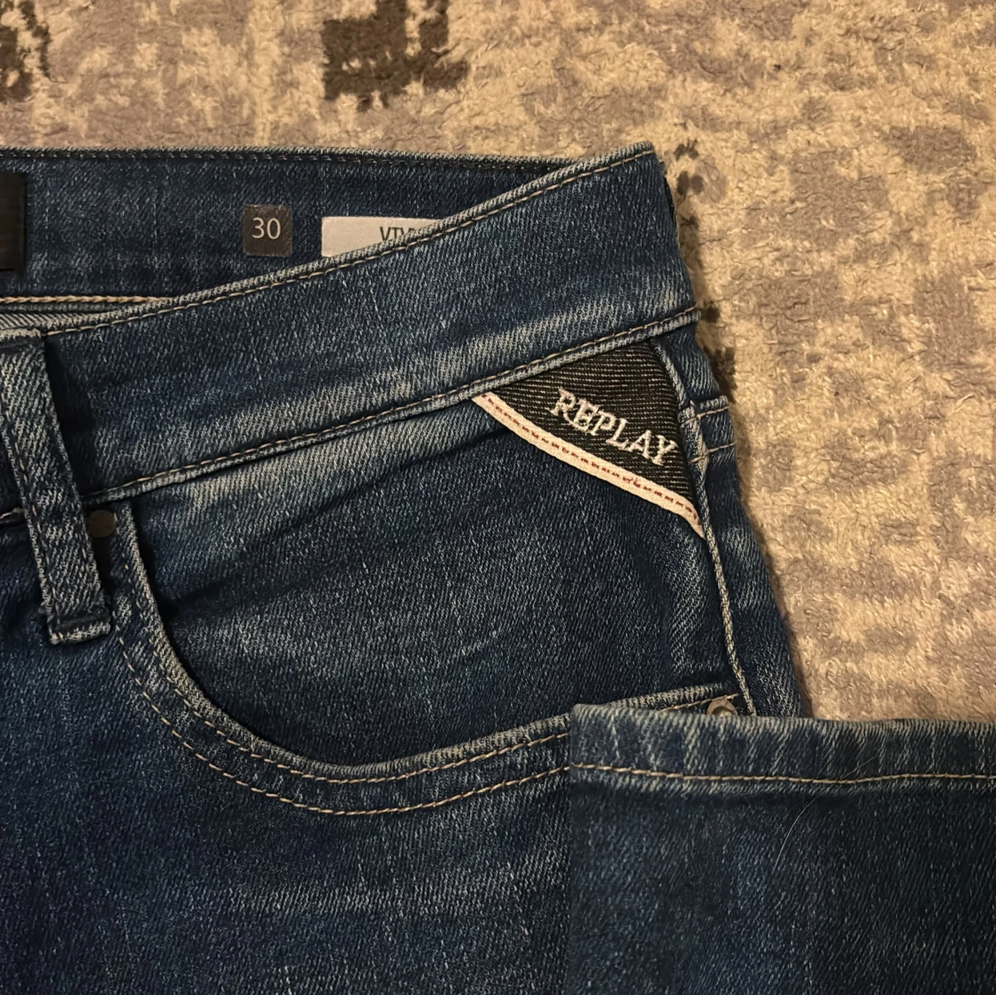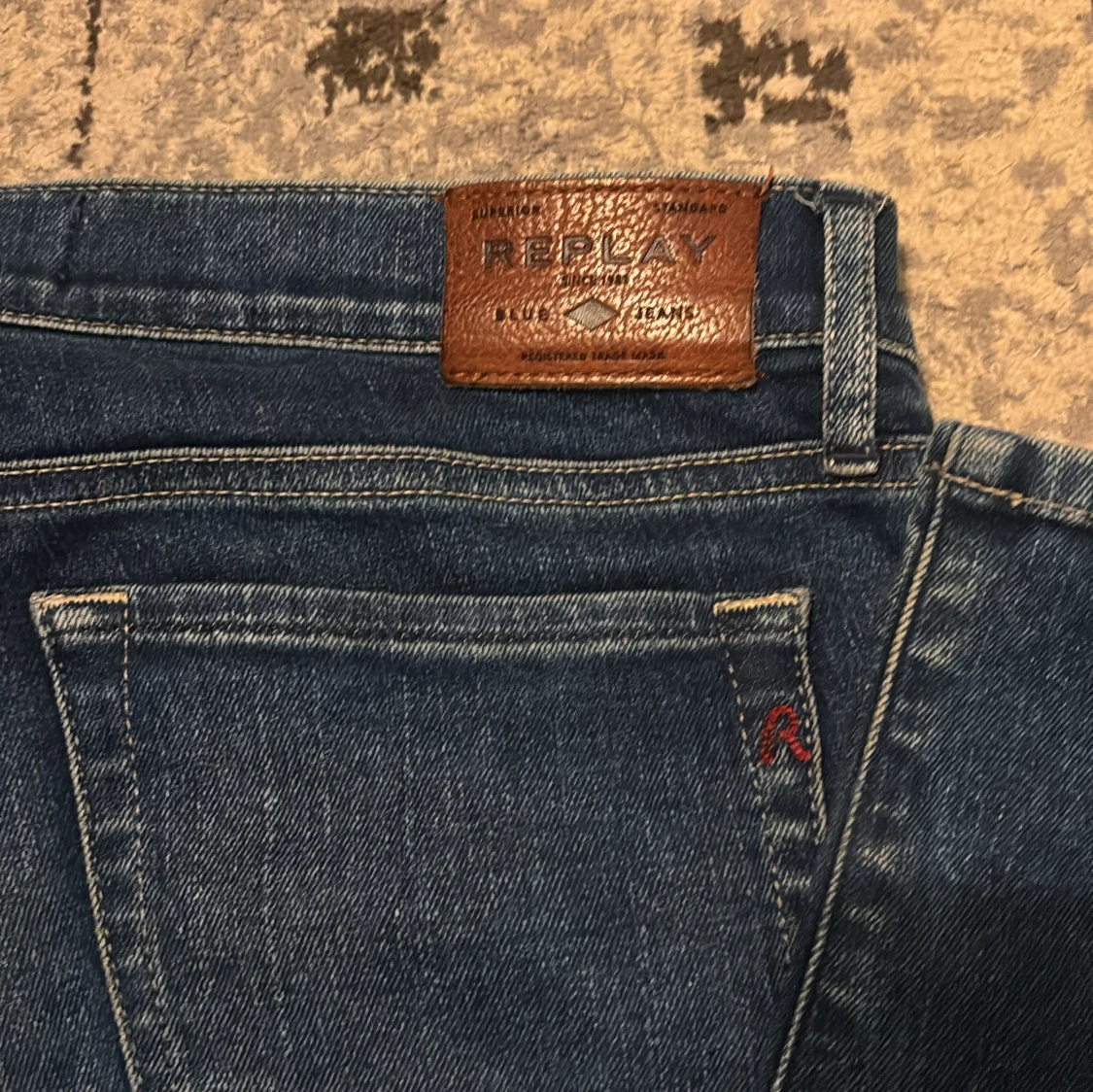 Snygga blå jeans från Replay i klassisk femficksmodell. Jeansen har raka ben, normal passform och tydliga Replay-detaljer på fickorna. Materialet är slitstarkt denim i bomull och färgen är mörkblå med lätt tvättade partier för en cool look.
