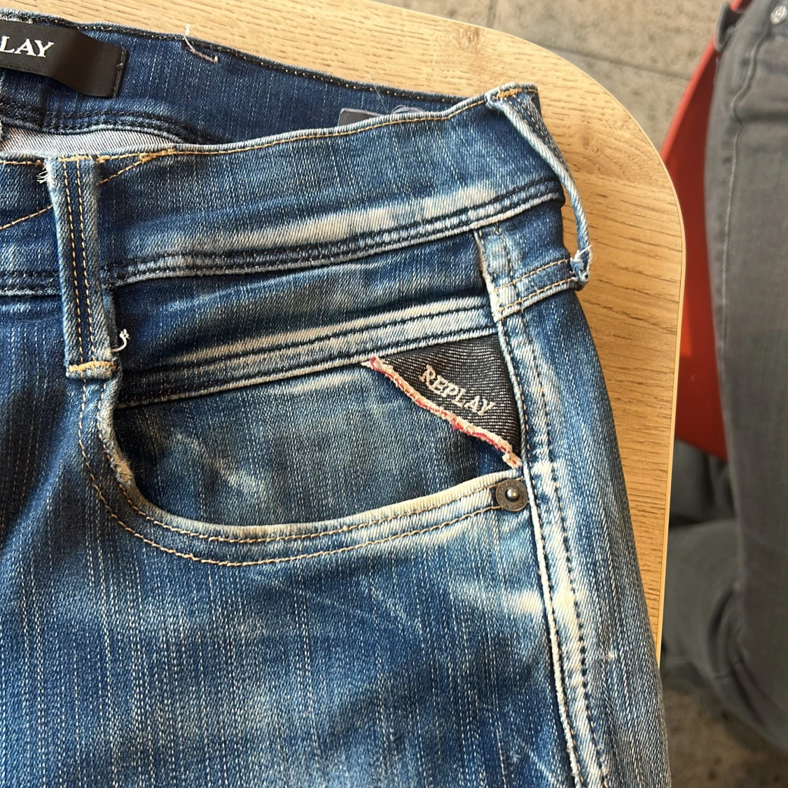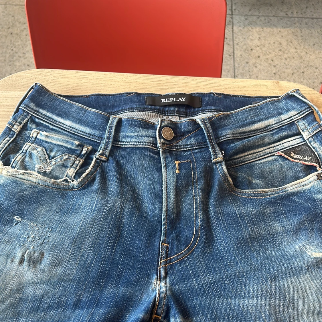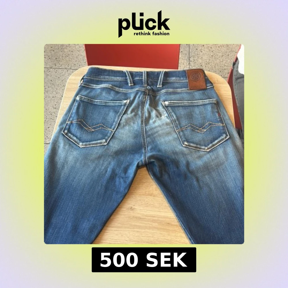Snygga blå jeans från Replay med slitna detaljer och tydliga kontrastsömmar. Klassisk femficksmodell med läderpatch bak i midjan och broderade bakfickor. Jeansen har en tvättad look och logotypdetalj vid myntfickan. Perfekta för en avslappnad streetstil.