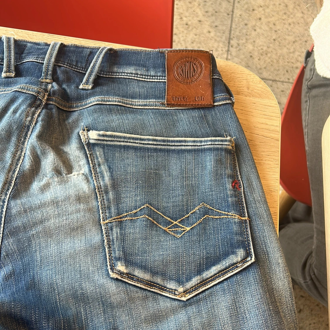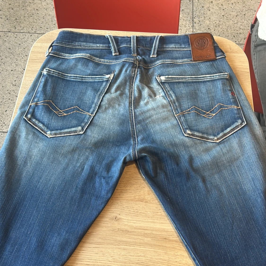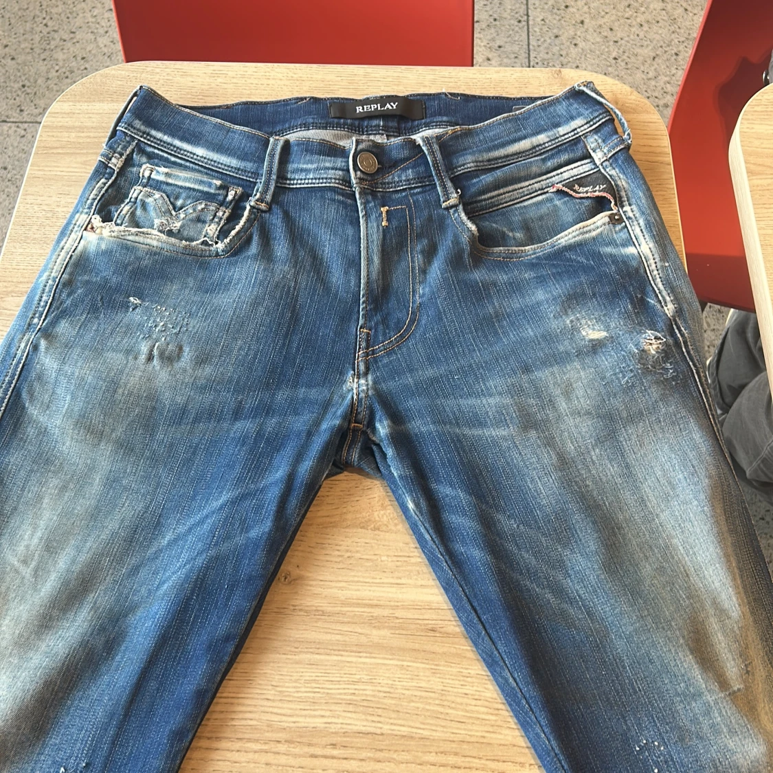 Snygga blå jeans från Replay med slitna detaljer och tydliga kontrastsömmar. Klassisk femficksmodell med läderpatch bak i midjan och broderade bakfickor. Jeansen har en tvättad look och logotypdetalj vid myntfickan. Perfekta för en avslappnad streetstil.