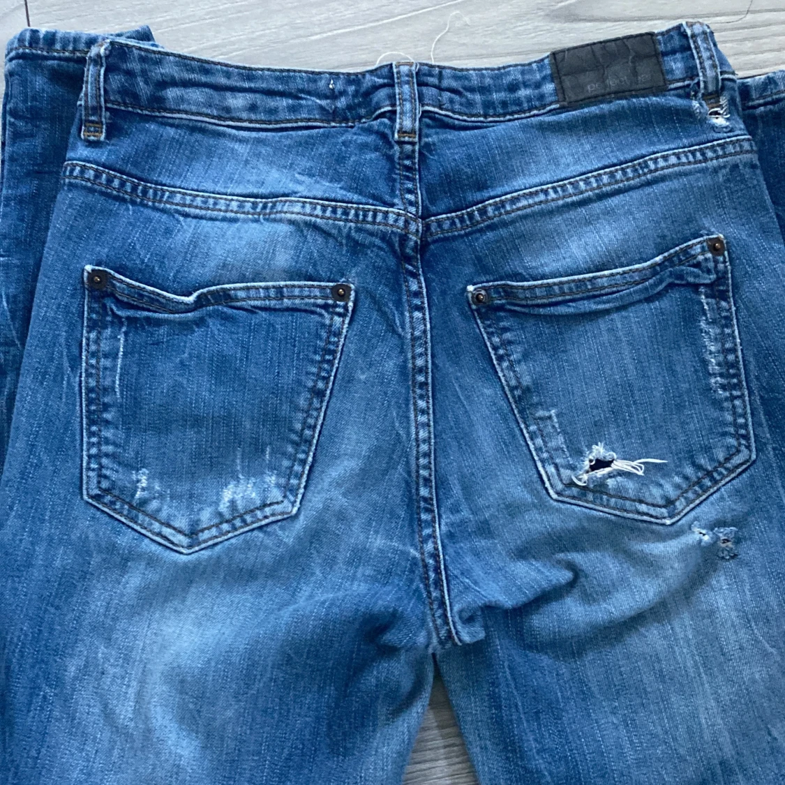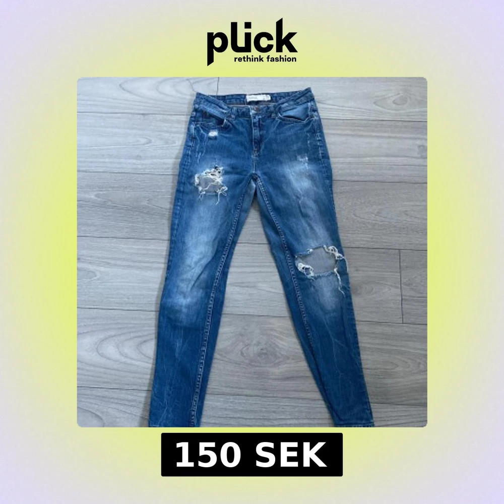 Snygga blå skinny jeans från Gina tricot i storlek 34. Jeansen har slitna detaljer och stora hål vid knäna.
