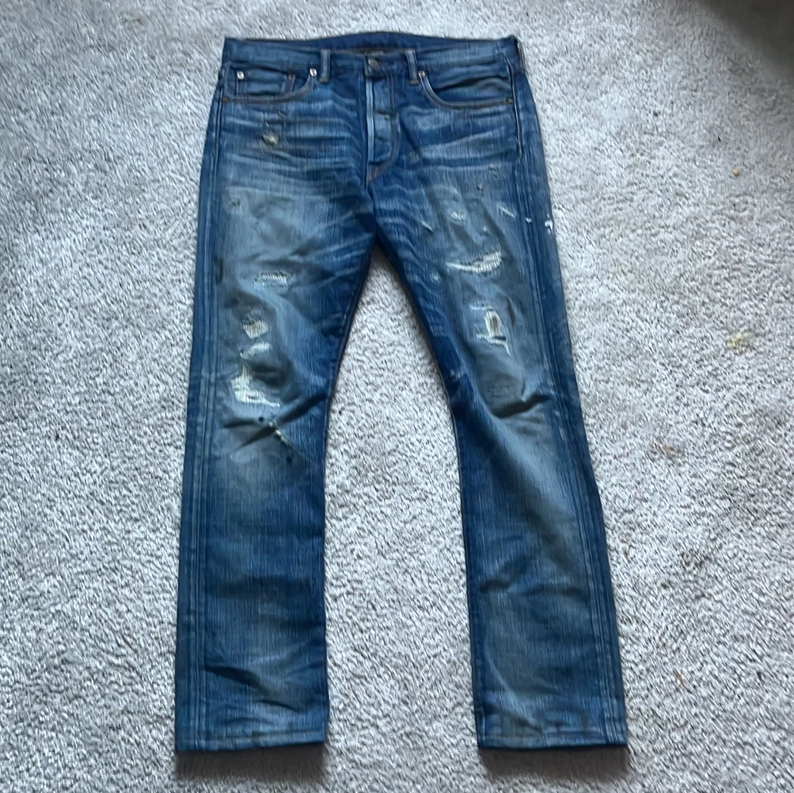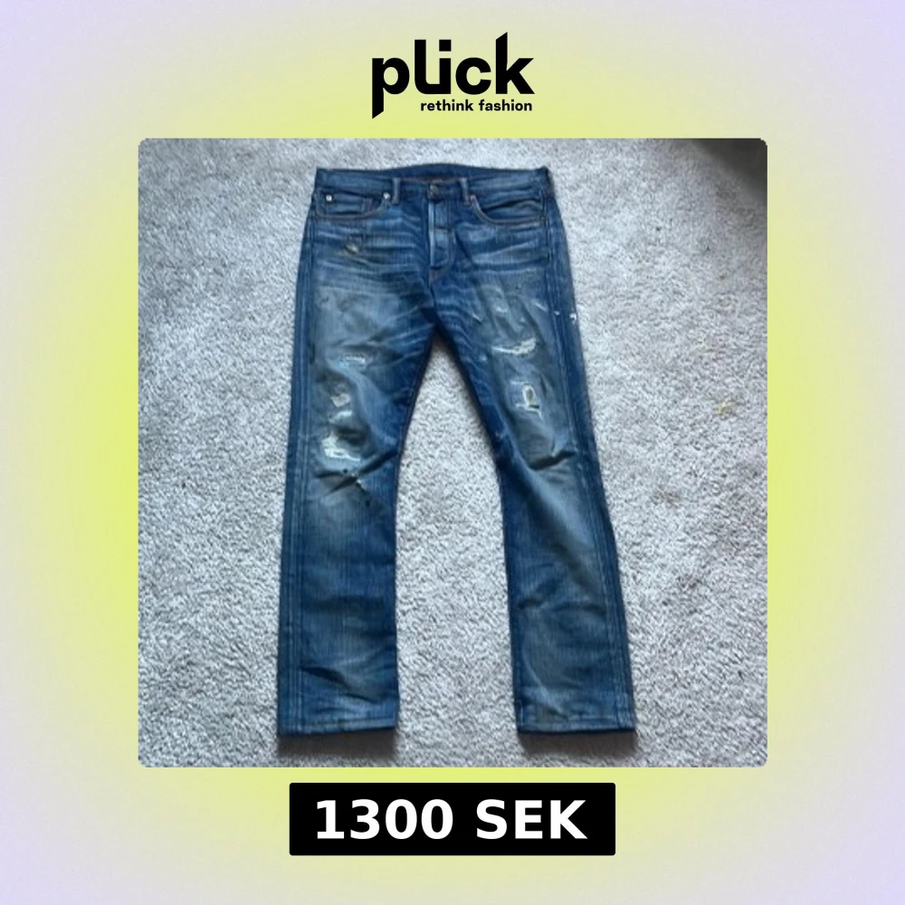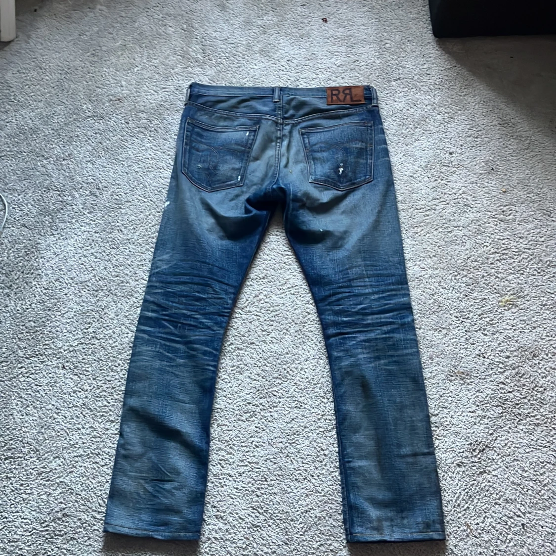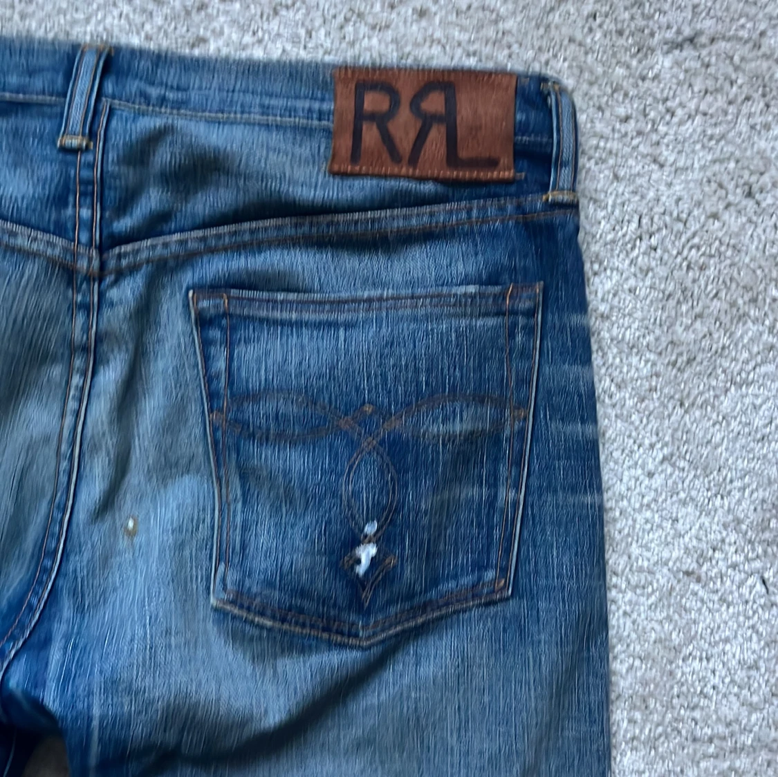 Säljer ett par blå jeans från RRL med snygga slitningar och distressed detaljer framtill. Klassisk femficksmodell med läderpatch bak i midjan. Jeansen är raka i modellen och tillverkade i 100% bomull. Perfekta för dig som gillar en rå och avslappnad look. Priset kan diskuteras vid snabbt köp och fråga gärna frågor🙂