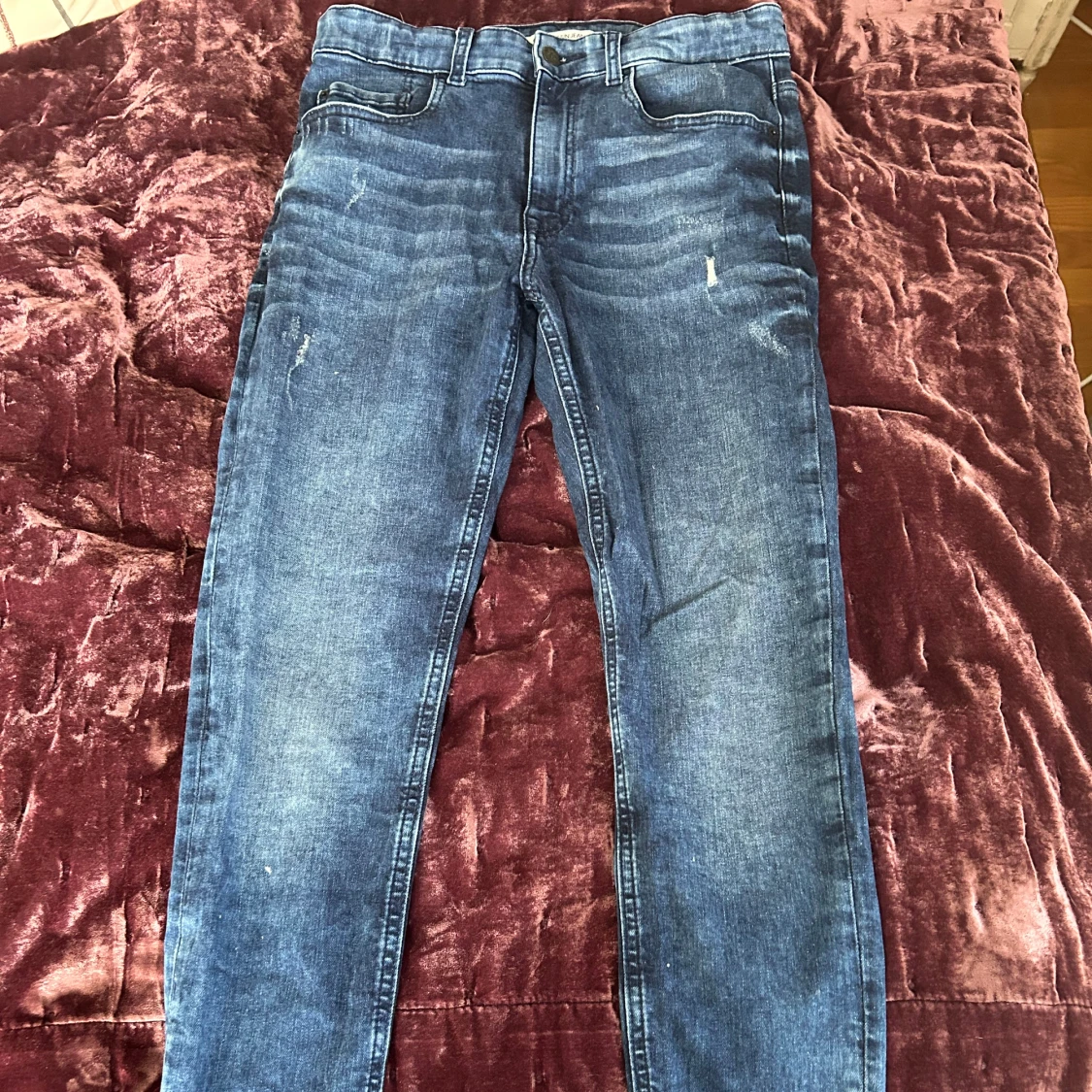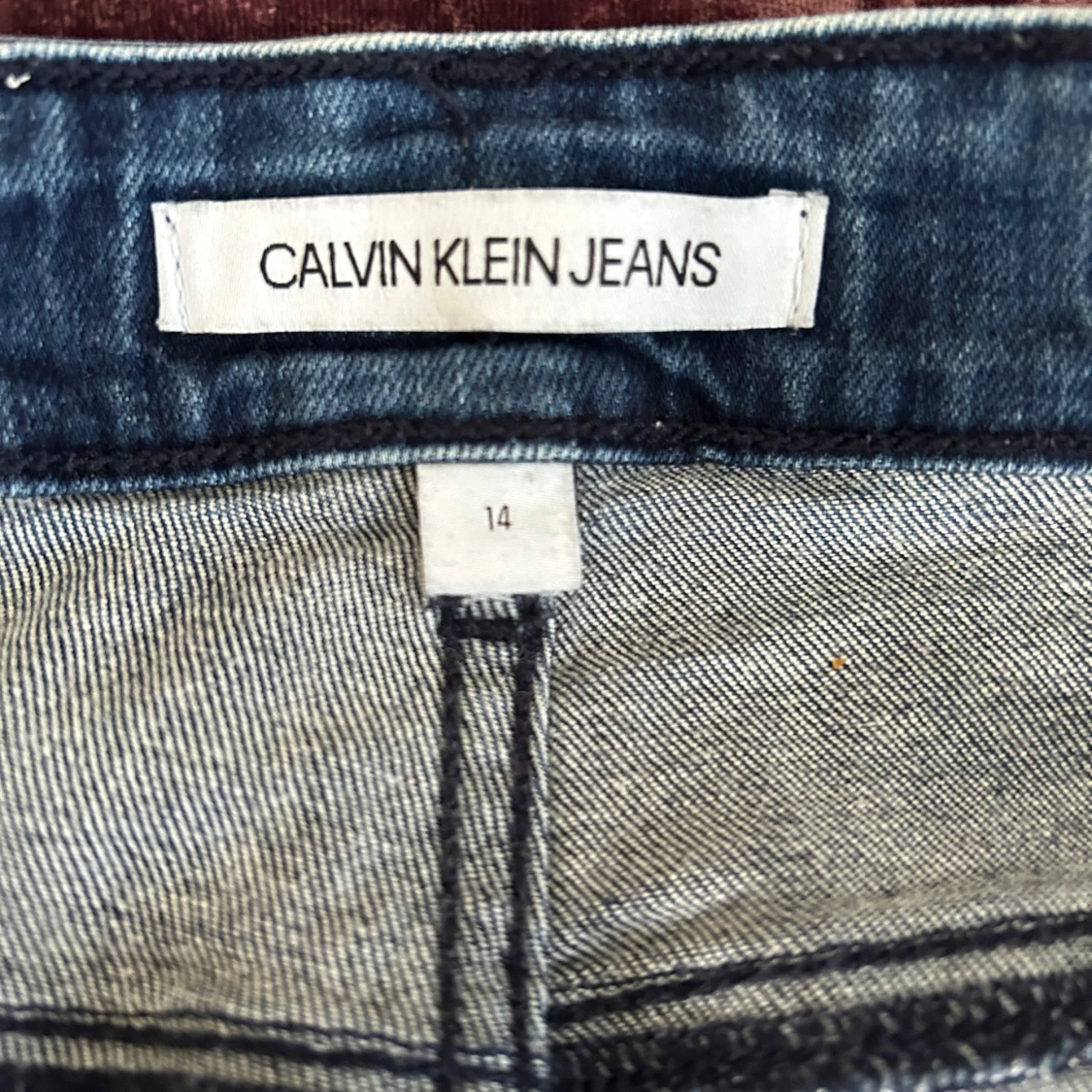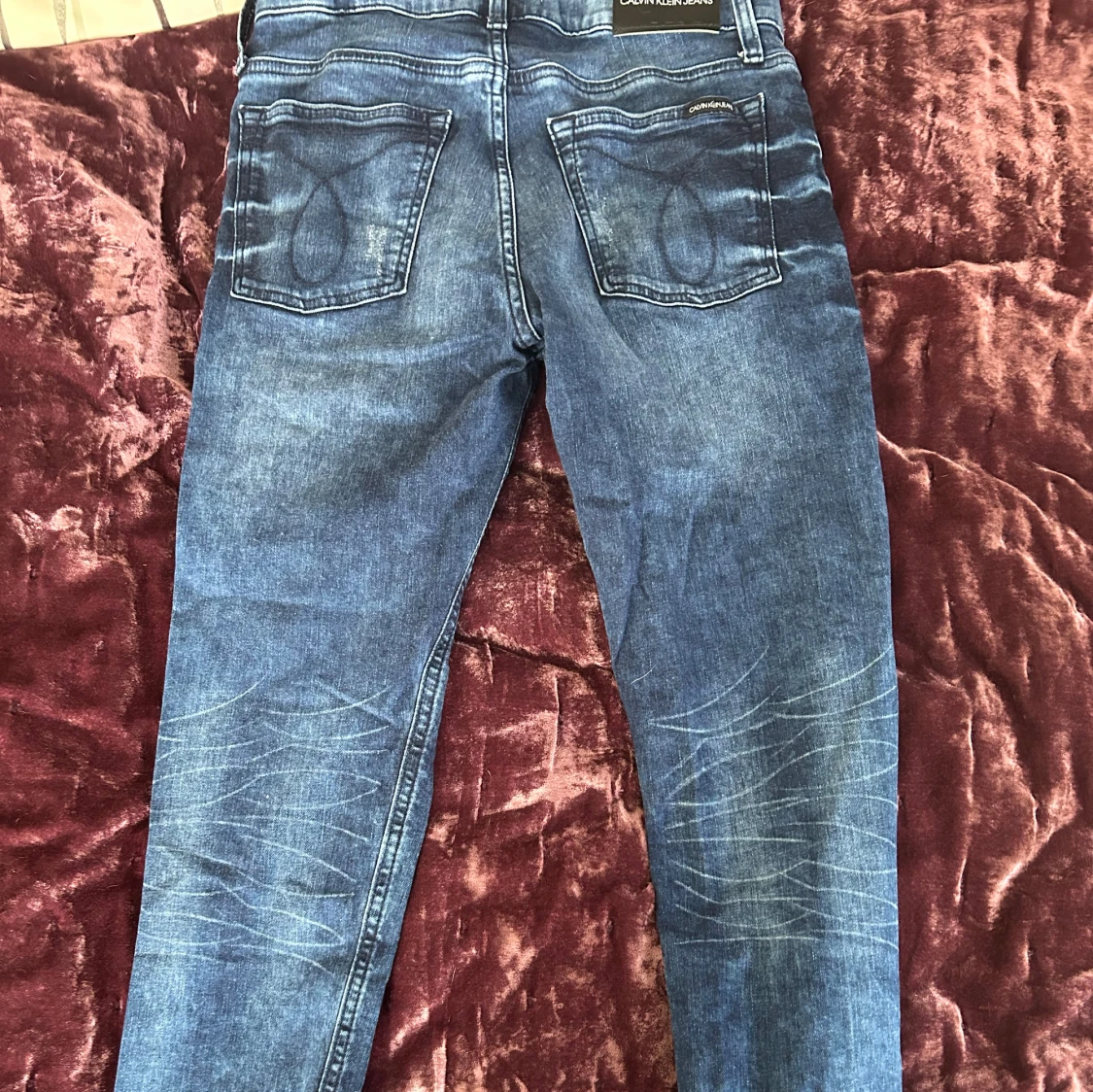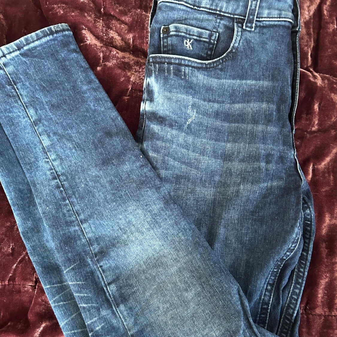 Snygga blå skinny jeans från Calvin Klein med klassisk femficksdesign och diskret CK-logo på myntfickan. Jeansen har slitningar och ljusare partier för en cool, använd look. Perfekta till sneakers. 98cm och 72cm i längd