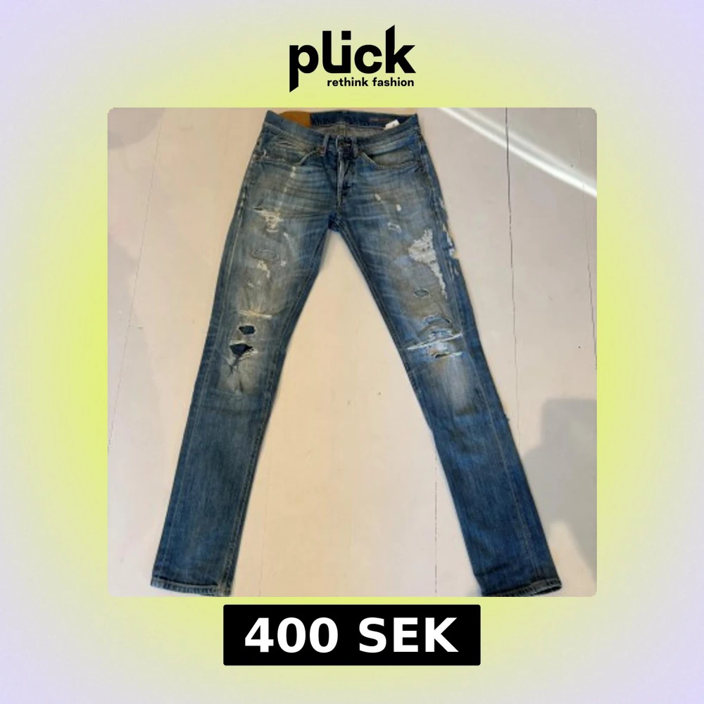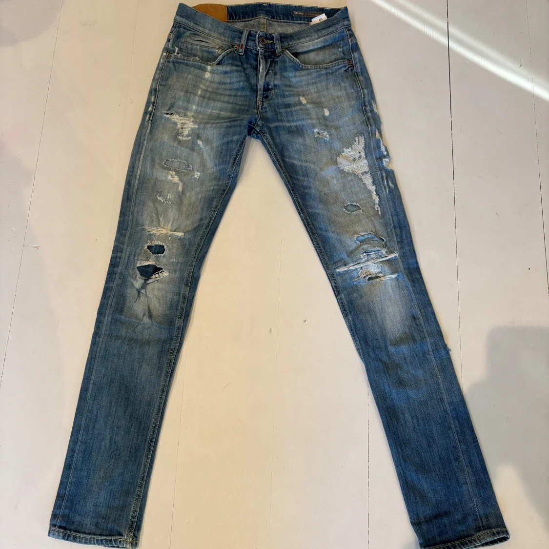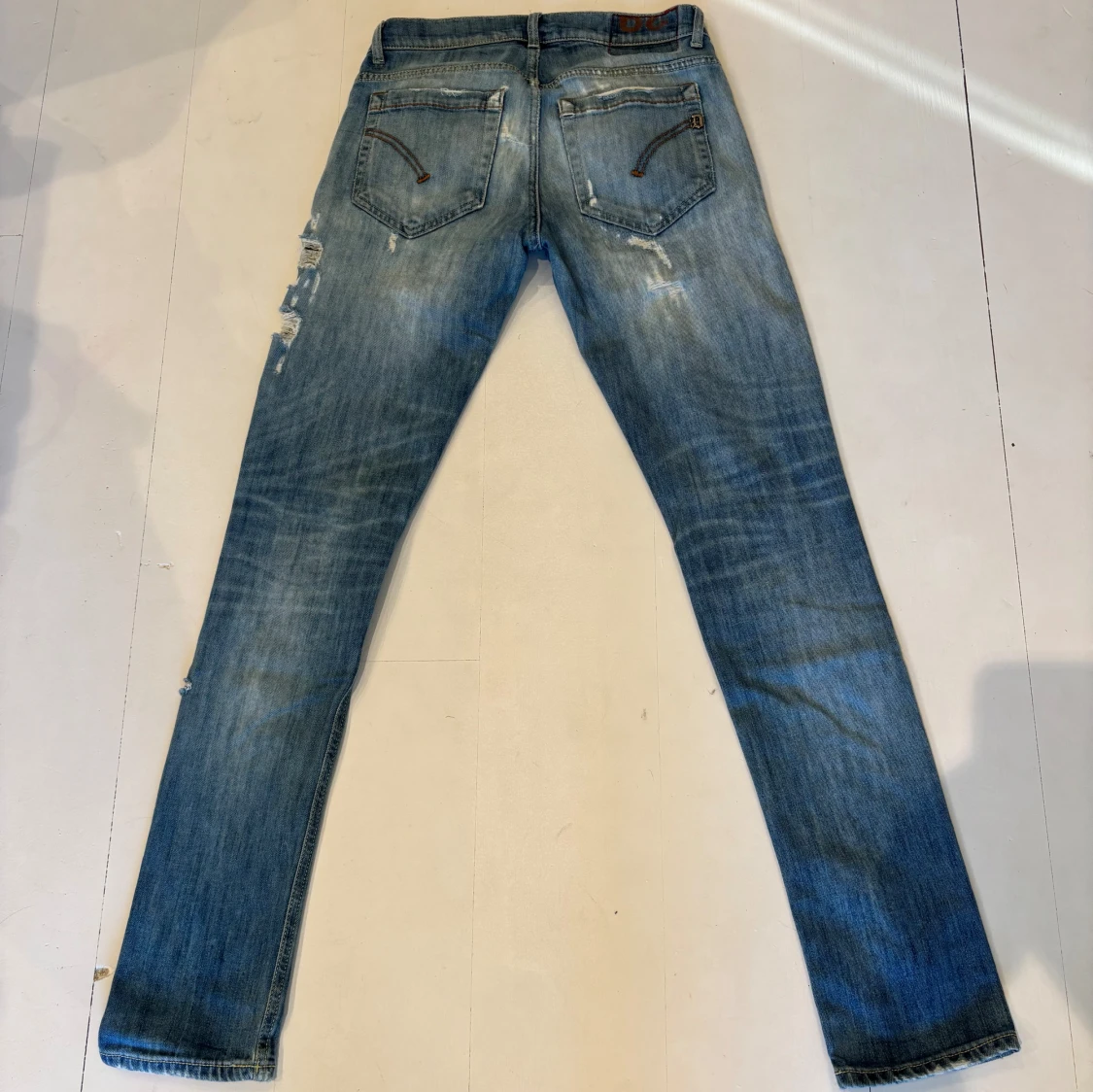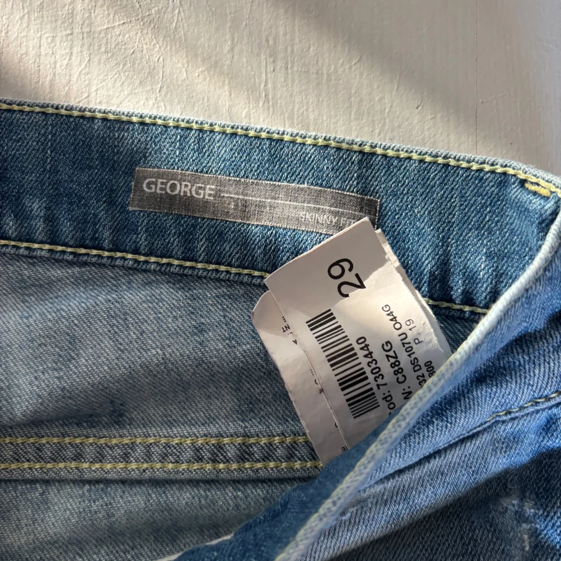 Säljer ett par blå skinny jeans från George i storlek 29. Jeansen har slitna detaljer och hål på benen för en cool, avslappnad look. Klassisk femficksmodell med dragkedja och knapp. Perfekta för dig som gillar en smal passform och streetstil.