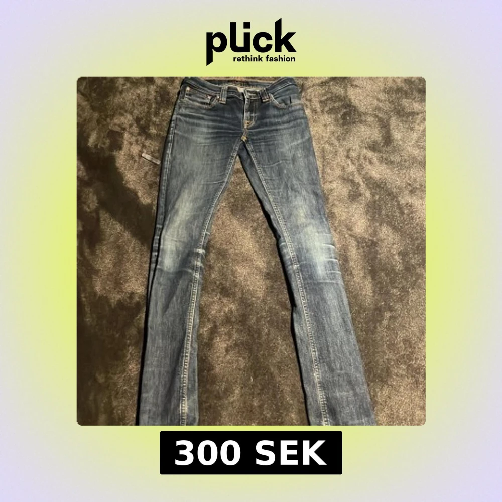 Säljer ett par blå skinny jeans från Nudie Jeans med snygga slitningar och kontrastsömmar. Modellen har klassisk femficksdesign, orange detaljer och en läderpatch bak. Perfekt passform för dig som gillar smalare jeans.