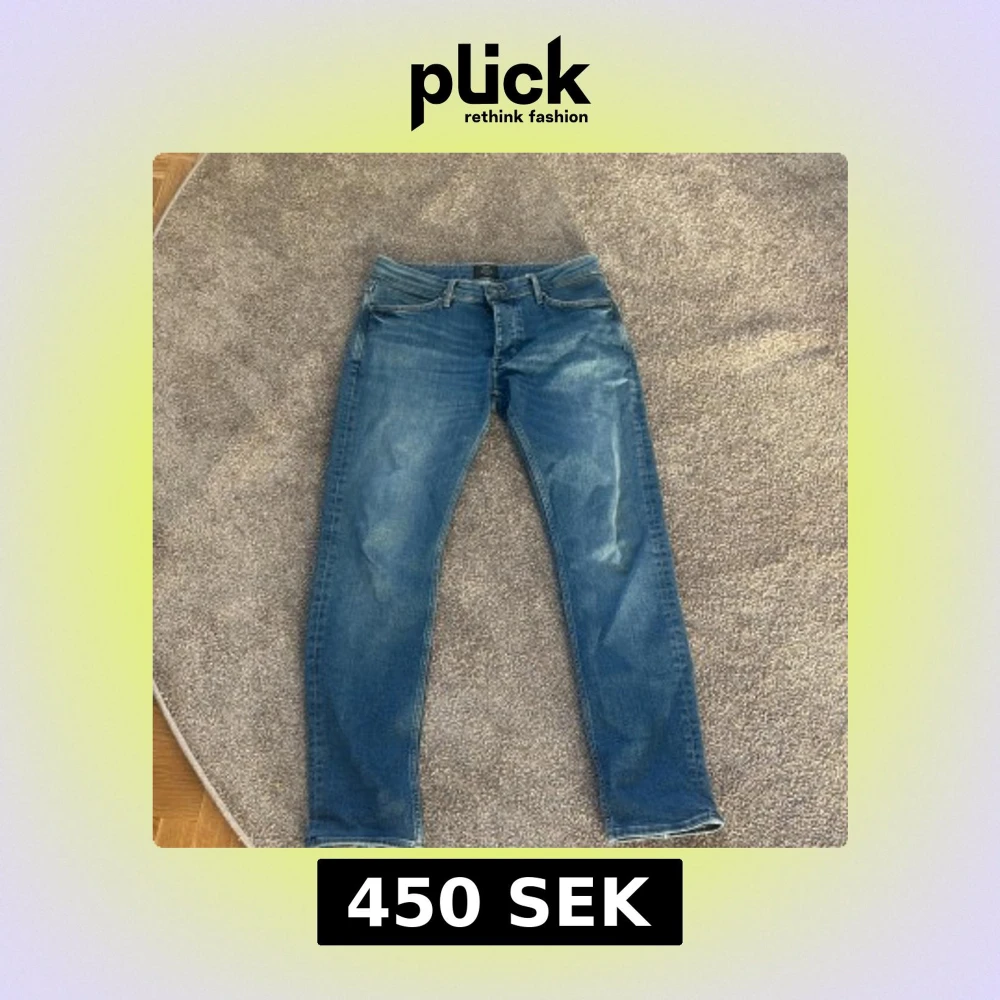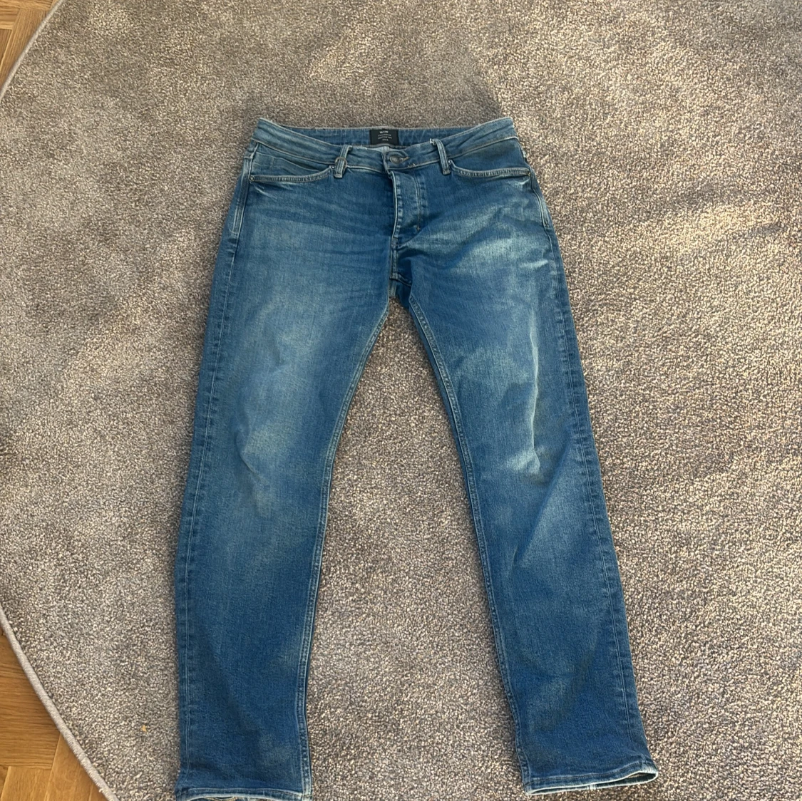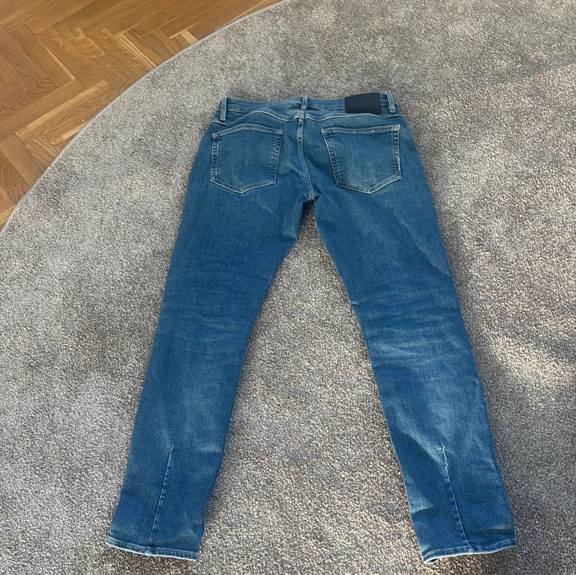 Säljer ett par blå skinny jeans med klassisk femficksdesign och snygga slitningar på låren. Jeansen har normal midja och smal passform hela vägen ner. Perfekta till sneakers eller boots och funkar året runt. Storlek 31-32