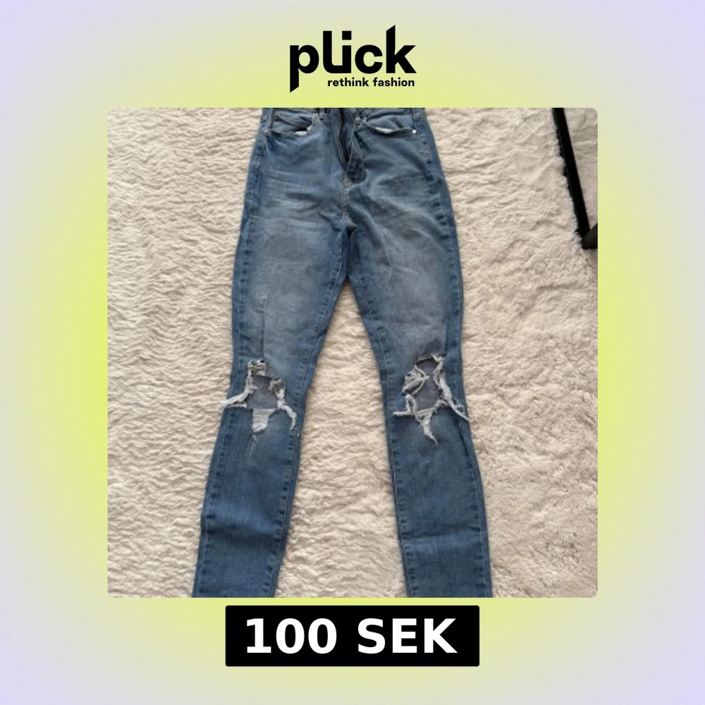 Säljer ett par blå skinny jeans med rejält slitna och trasiga knän. Jeansen har klassisk femficksdesign och är i stretchigt denim som sitter tight hela vägen ner. Perfekta för dig som gillar en edgy och avslappnad stil.