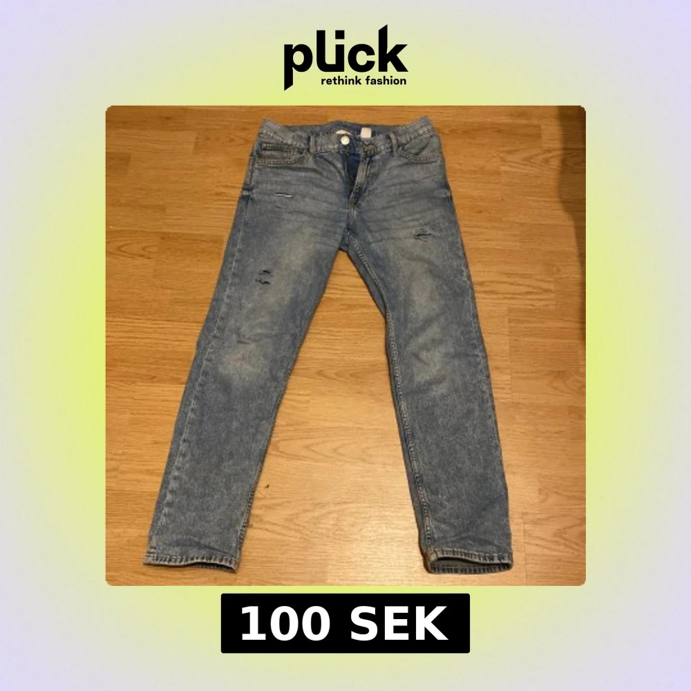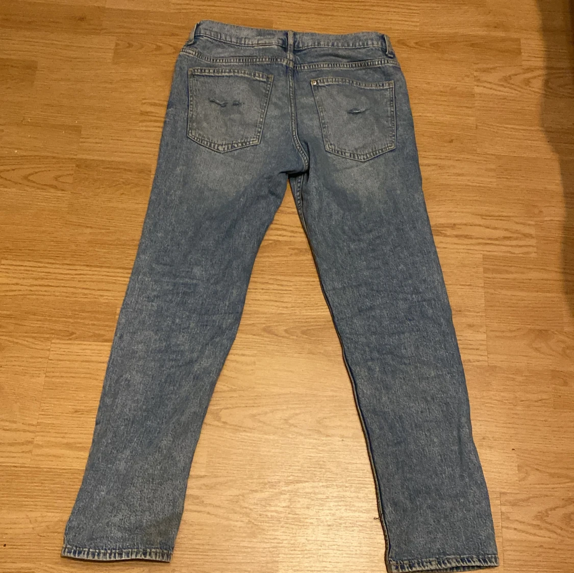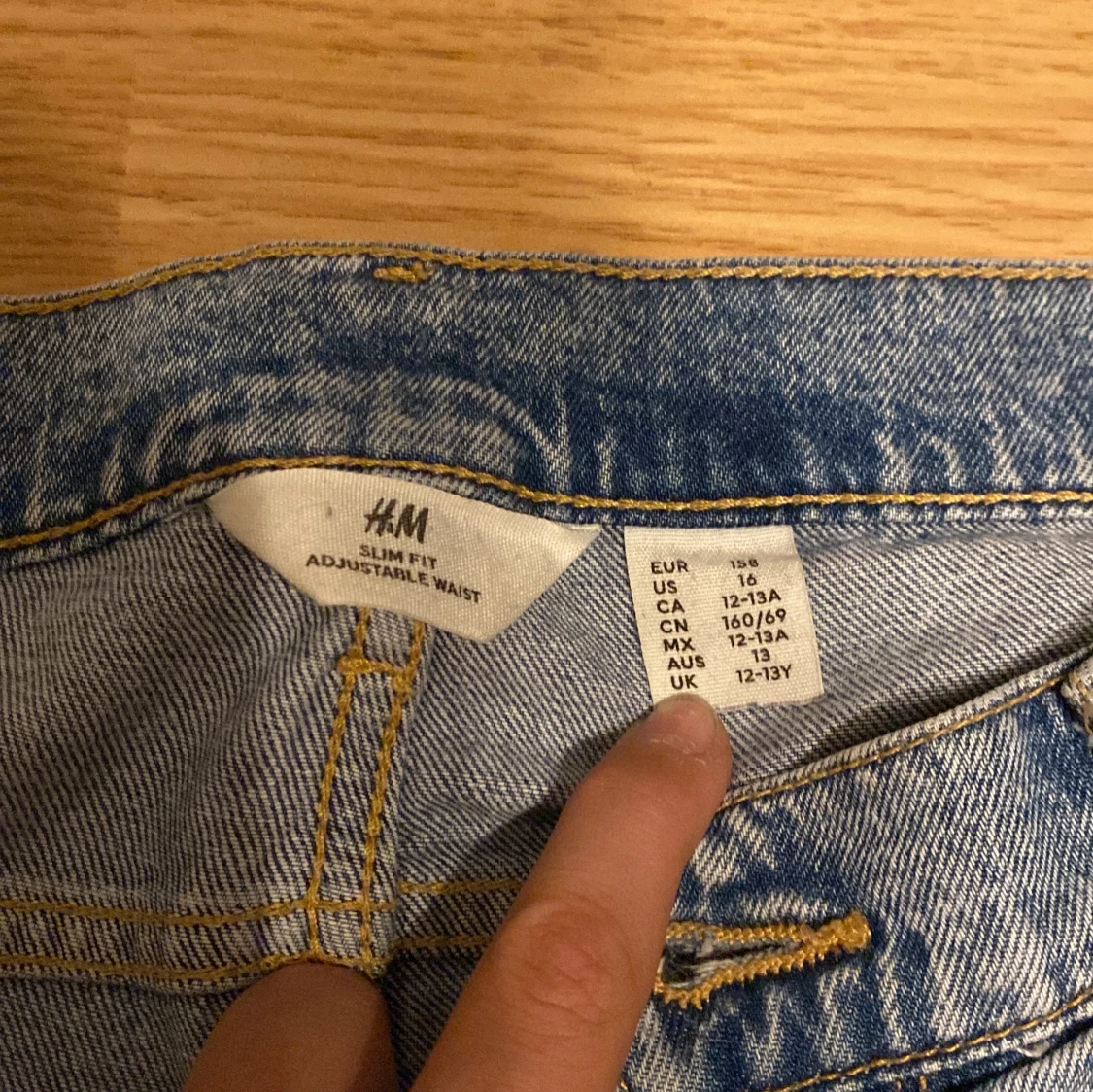 Säljer ett par blå slim fit jeans från H&M med justerbar midja. Jeansen har slitna detaljer framtill och klassisk femficksdesign. Perfekta för dig som gillar en smalare passform och enkel stil.