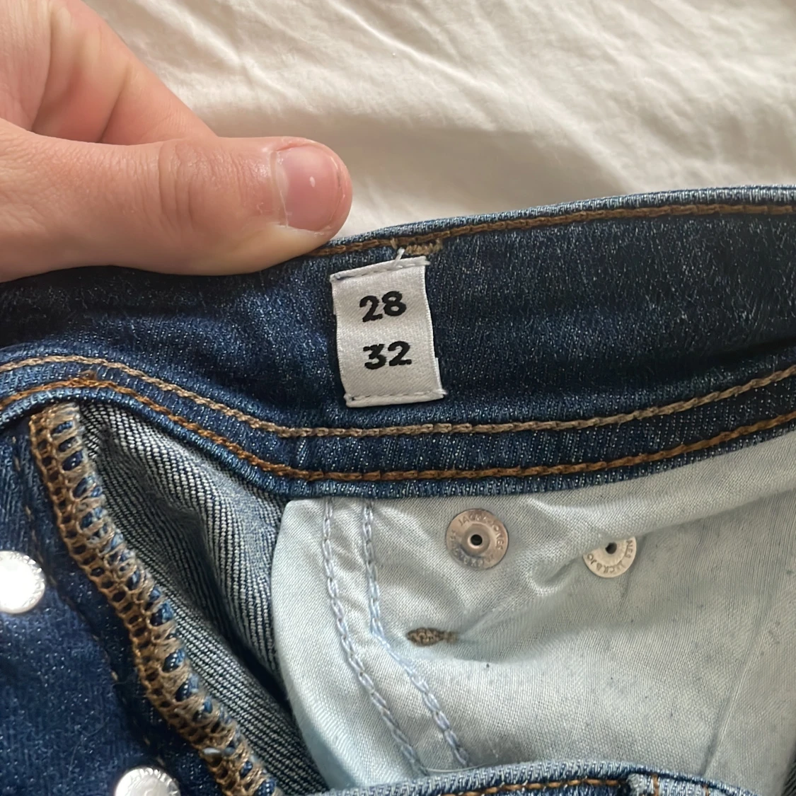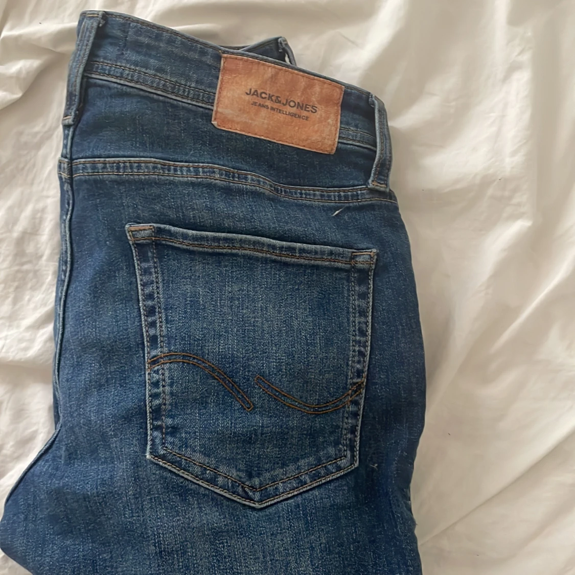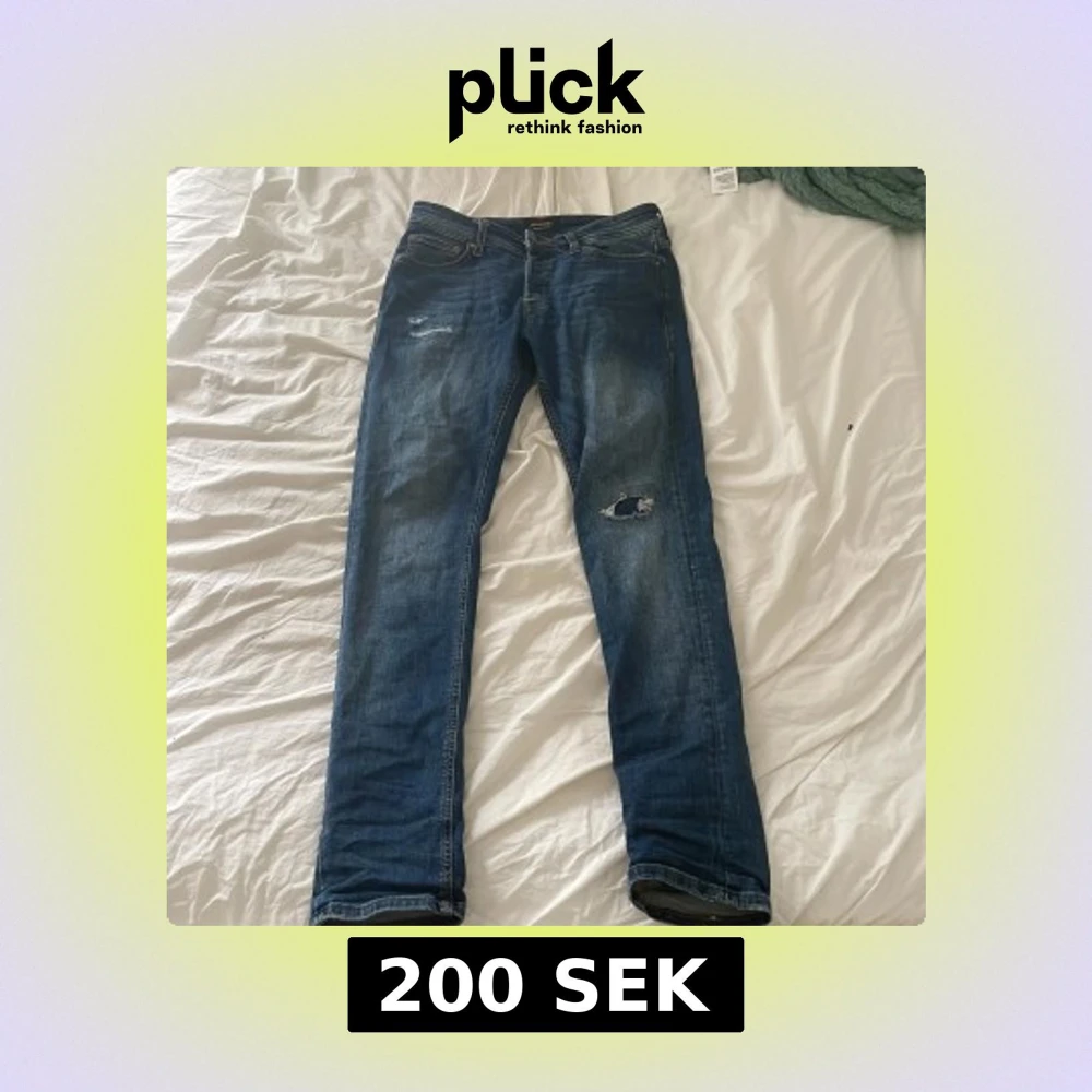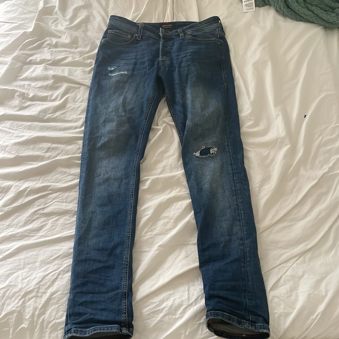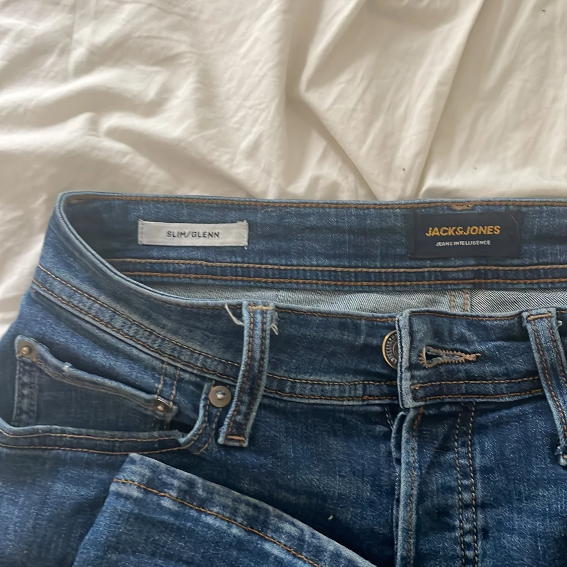 Säljer ett par blå slim fit jeans från Jack & Jones, modell Glenn. Jeansen har slitna detaljer på låret och vid fickan, klassisk femficksdesign och knappgylf. Perfekta för dig som gillar en smalare passform och tidlös denimstil.