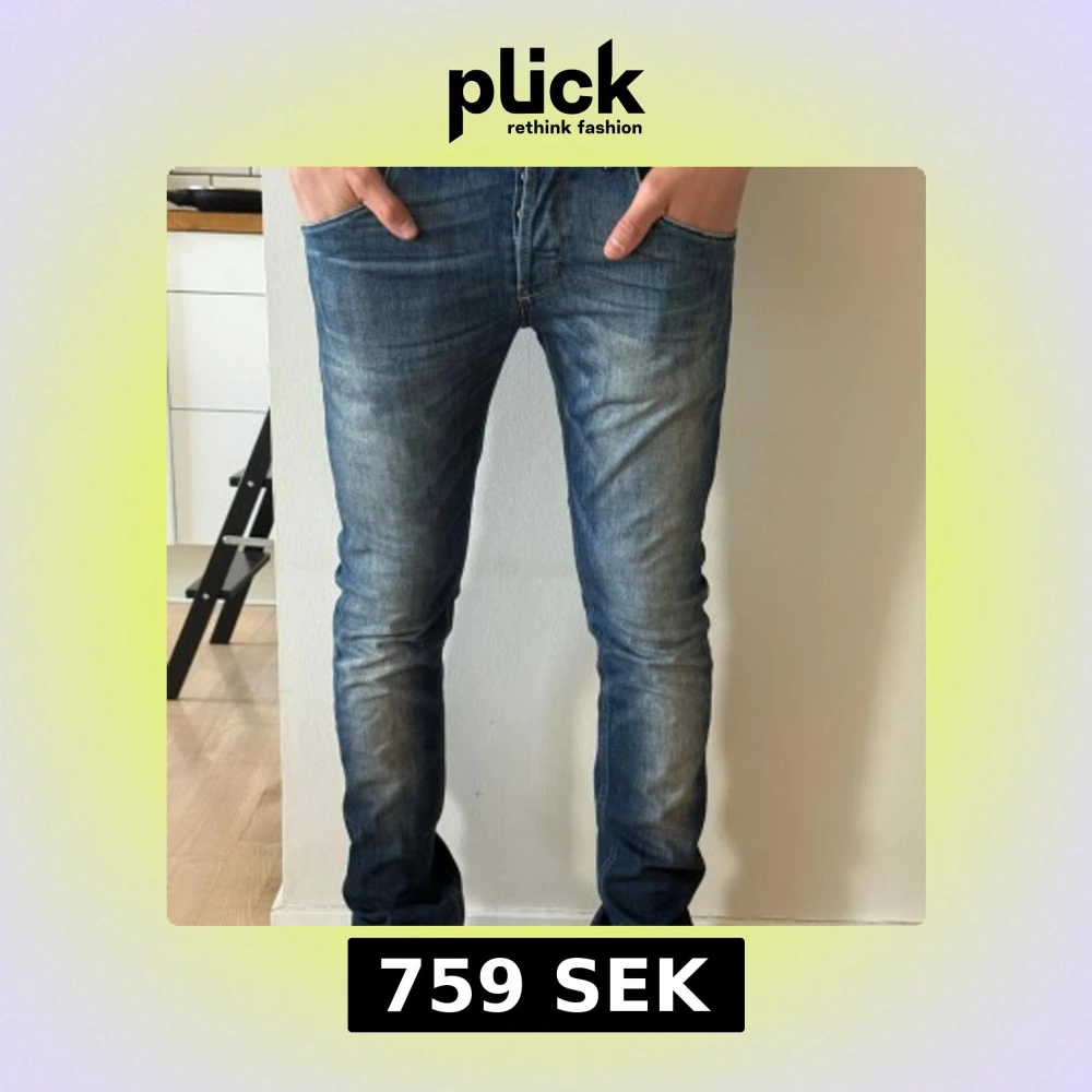 Snygga blå jeans med slim fit passform och klassisk femficksdesign. Jeansen har en lätt tvättad look med subtila slitningar och normal midja. Perfekta för en stilren vardagsoutfit. Dm för frågor!