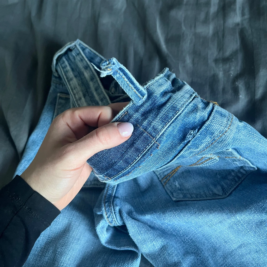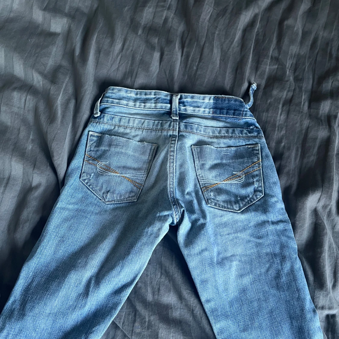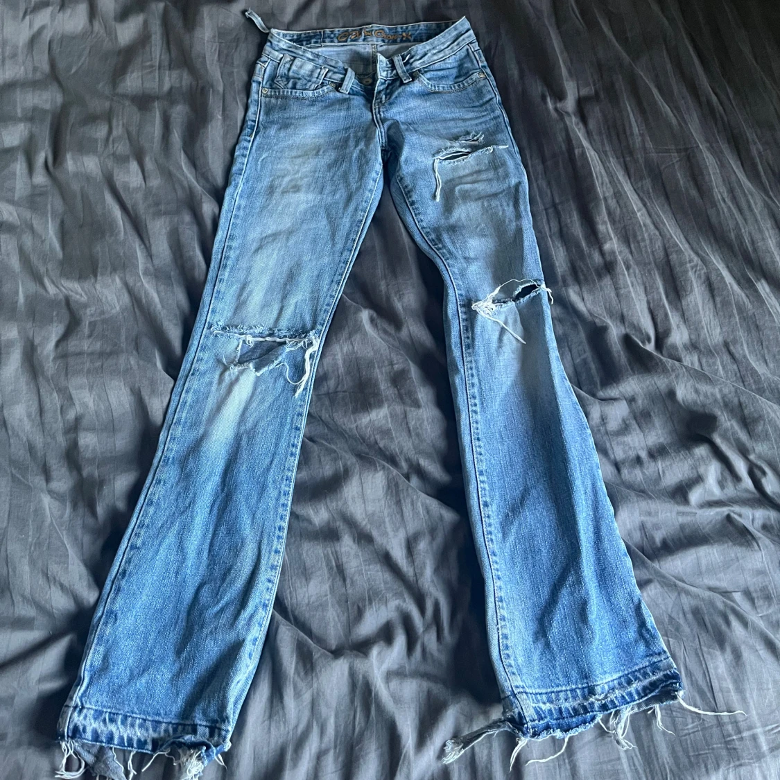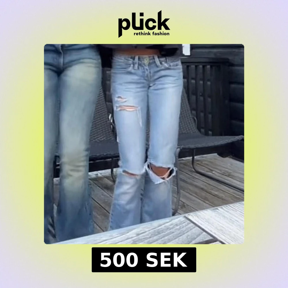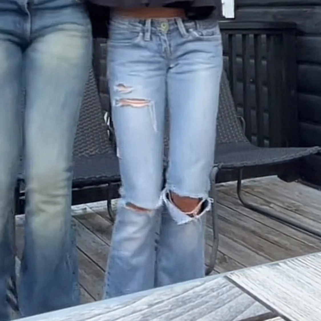 Säljer ett par ljusblå bootcut jeans med slitningar och stora hål vid knäna. De är verkligen mina favorit jeans men de passar tyvärr inte längre. Lågmidjade o skitsnygga!! En skärpögla har släppt men de är inget man tänker på o går lätt o lösa om man vill