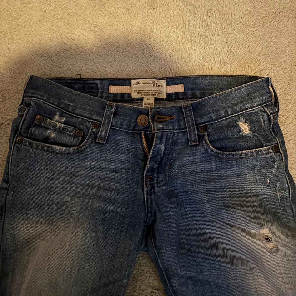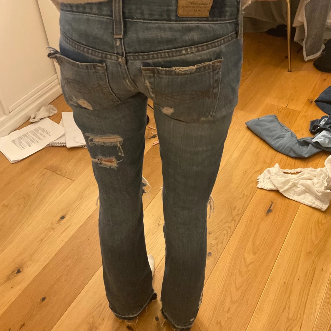 Säljer ett par blå jeans från Abercrombie & Fitch med slitningar och hål på knäna och bakfickorna. Jeansen är lowwaist och är bootcut/raka i benen💕77 cm i innerbenen och 37 i midjan tvärs över