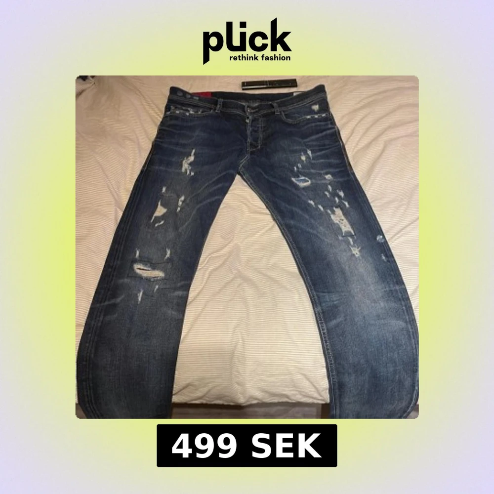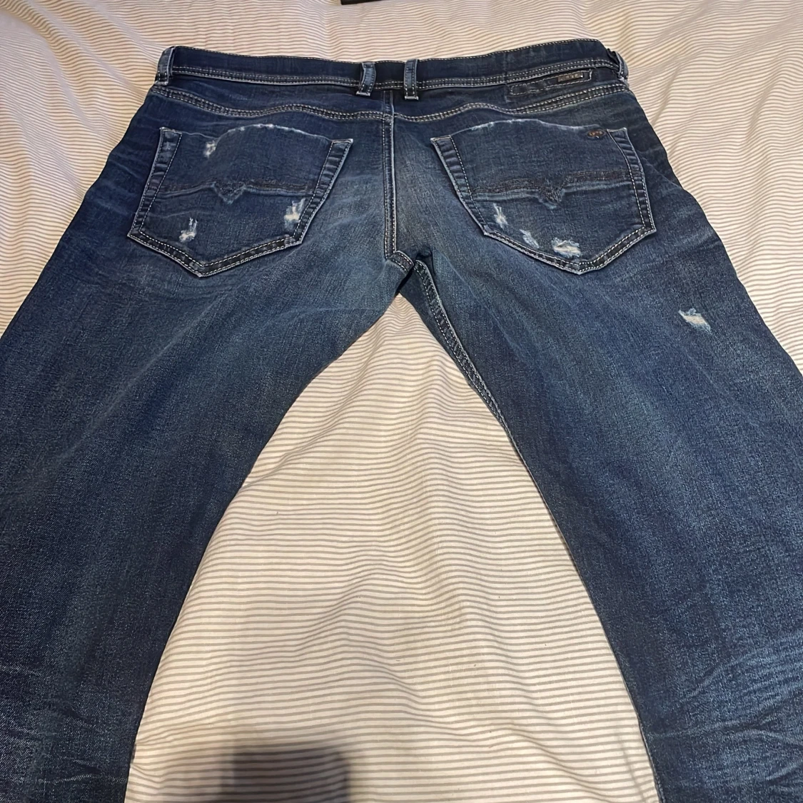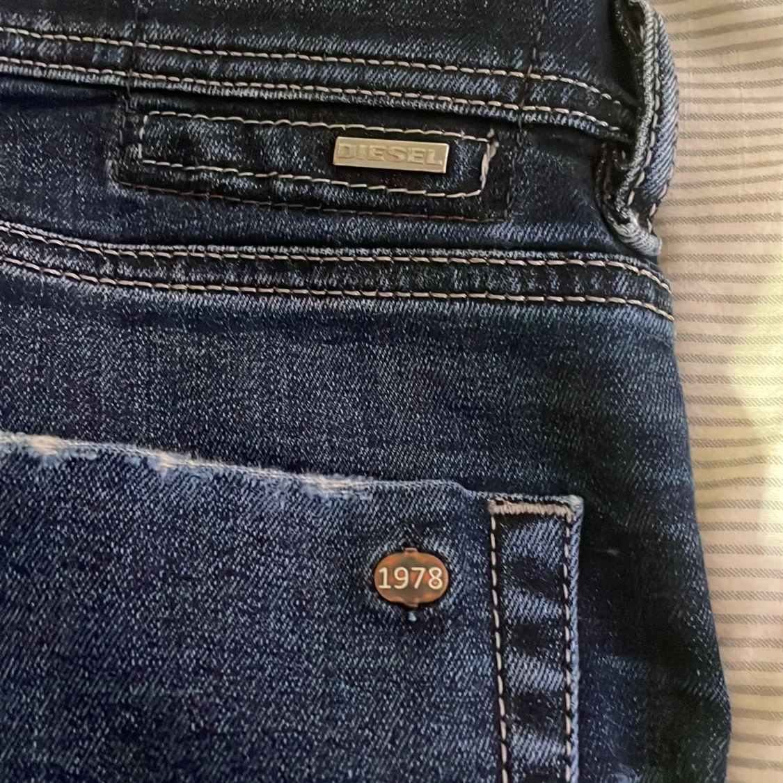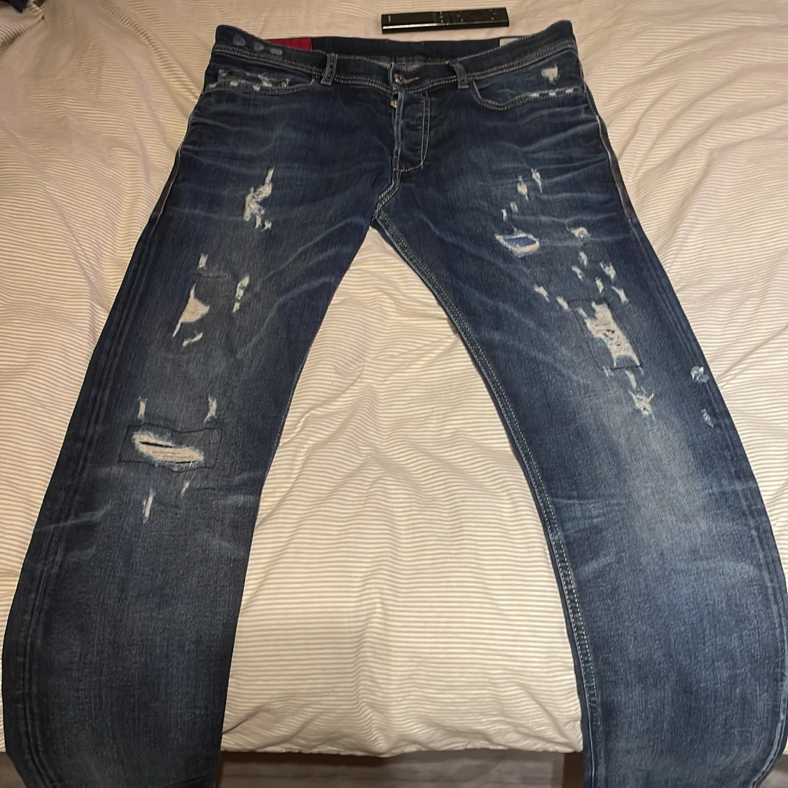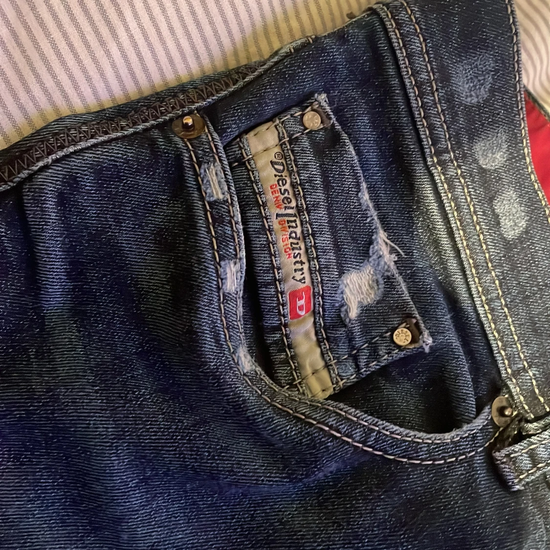 Säljer ett par blå jeans från Diesel med coola slitningar och distressed detaljer framtill och baktill. Klassisk femficksmodell med snygga kontrastsömmar och metallpatch med Diesel-logga. Jeansen har en rak passform och är gjorda i robust denim.