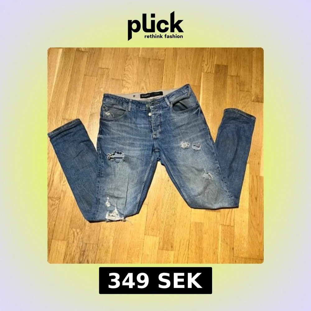 Säljer ett par blå jeans från Gabba i modell REY, storlek 32/34. Jeansen har flera slitningar och hål på benen för en riktigt cool och avslappnad look. Klassisk femficksmodell med knappgylf och läderpatch bak i midjan.