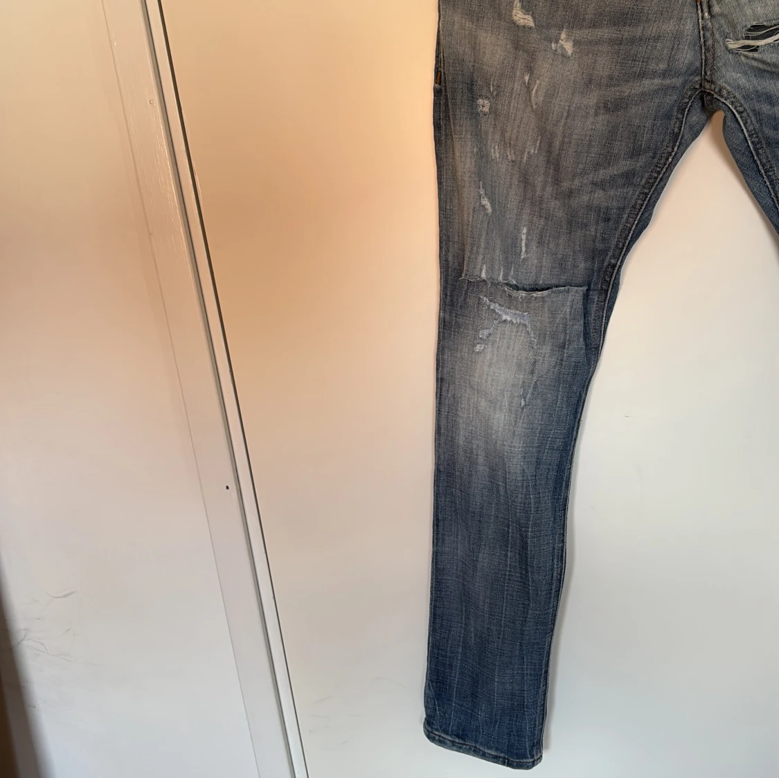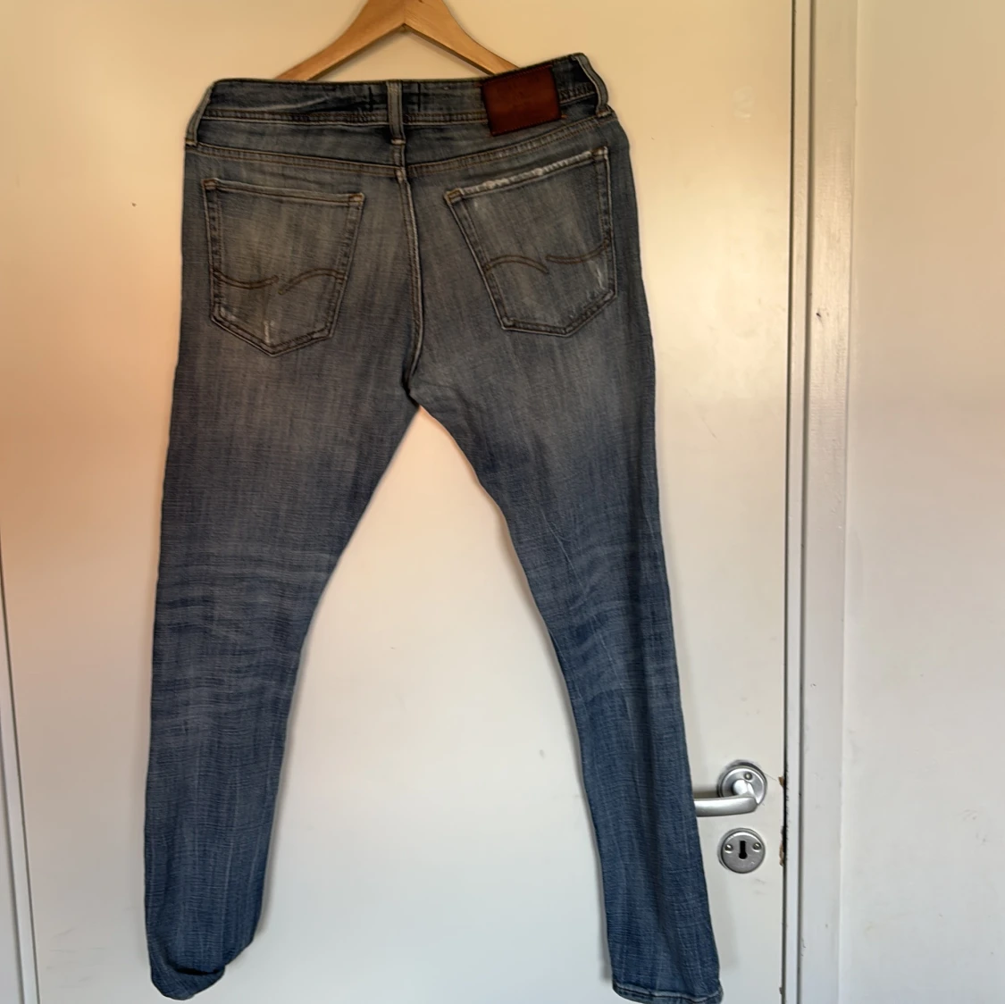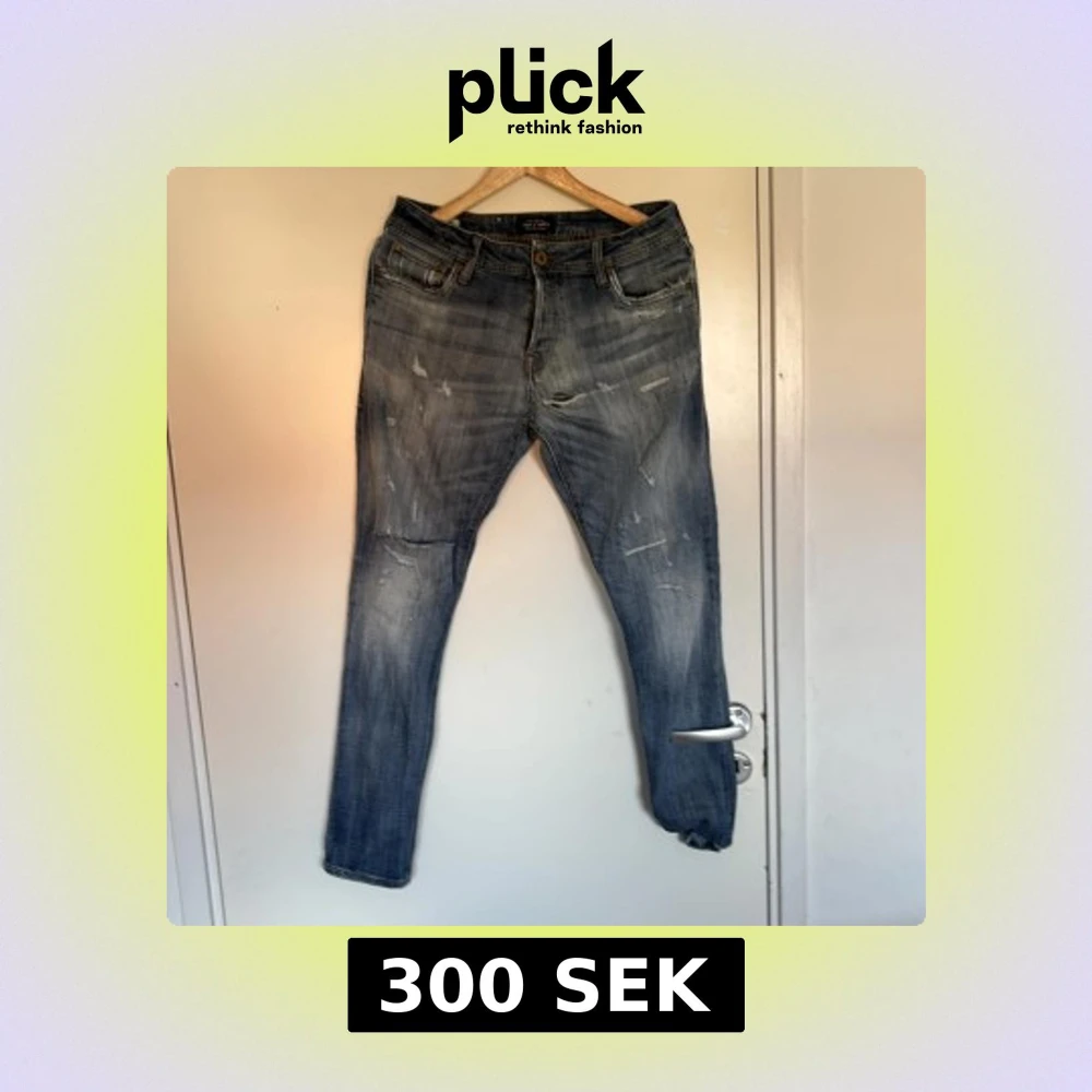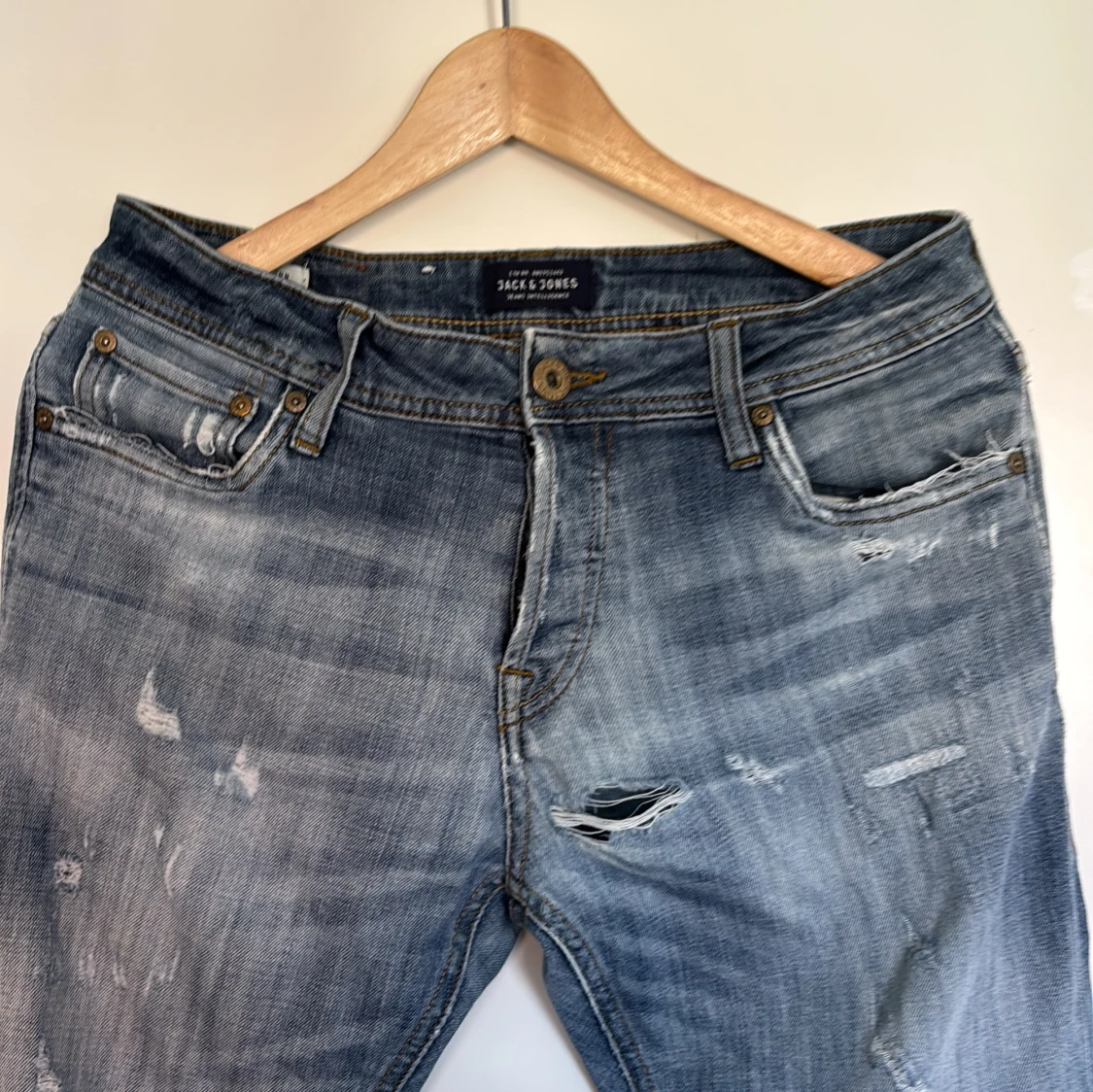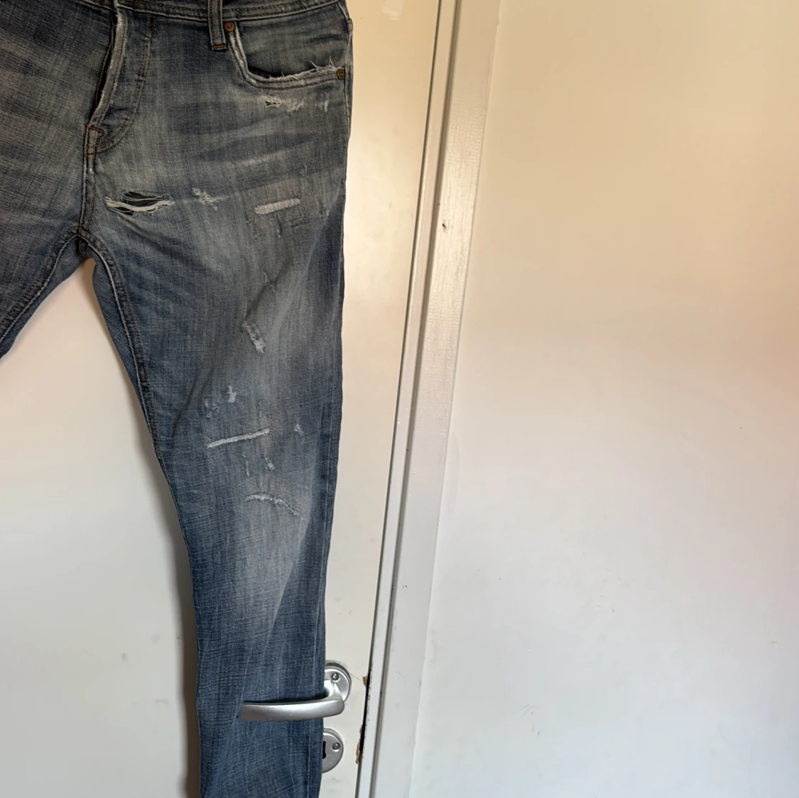 Säljer ett par blå jeans från Jack & Jones med snygga slitningar och distressed detaljer. Modellen har klassisk femficksdesign, normal passform och raka ben. Jeansen är tillverkade i jeansmaterial med ljus tvätt och coola slitningar på låren och knäna.