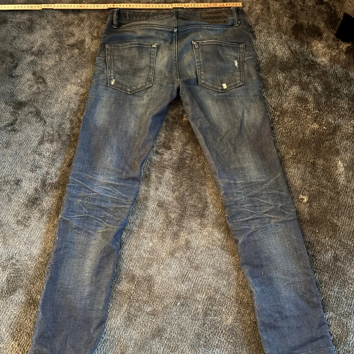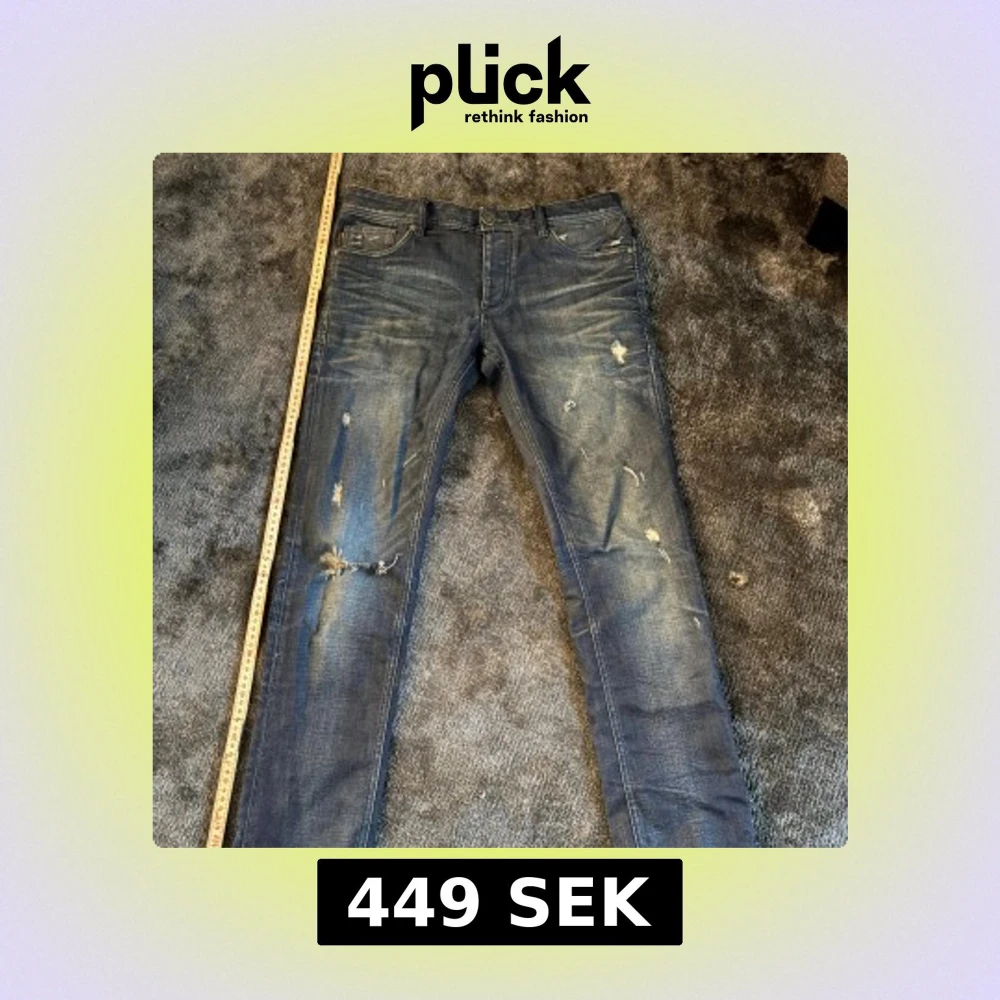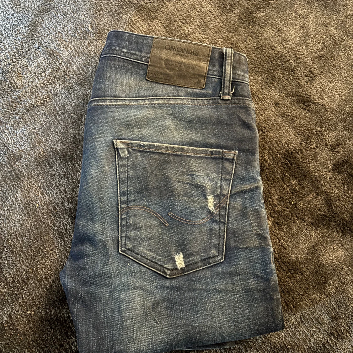 Säljer ett par blå jeans från Jack & Jones Originals med snygga slitningar och distressed detaljer. Jeansen har klassisk femficksdesign, normal midja och raka ben. Materialet är jeans i bomull och de har en cool, använd look som passar perfekt till streetwear. Pris kan diskuteras🙌🏻