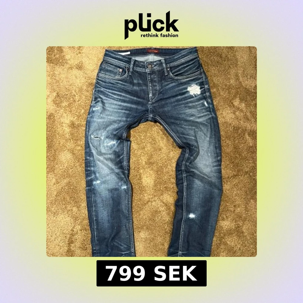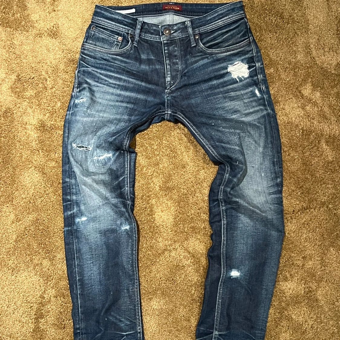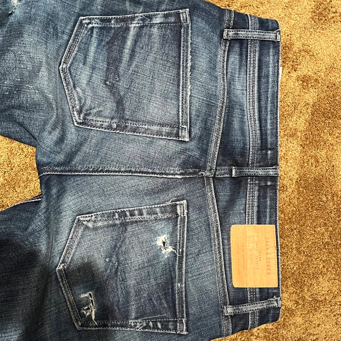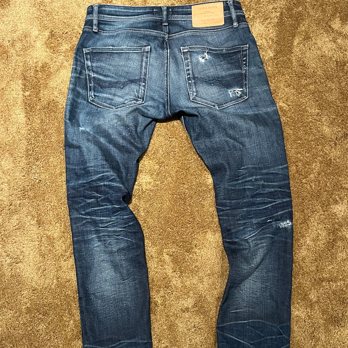 Säljer ett par blå jeans från Jack & Jones med snygga slitningar och tvättade detaljer. Modellen har klassisk femficksdesign, raka ben och normal passform. Jeansen är tillverkade i bomull och har en mörkblå ton med ljusare partier och slitna effekter på både fram- och baksida.