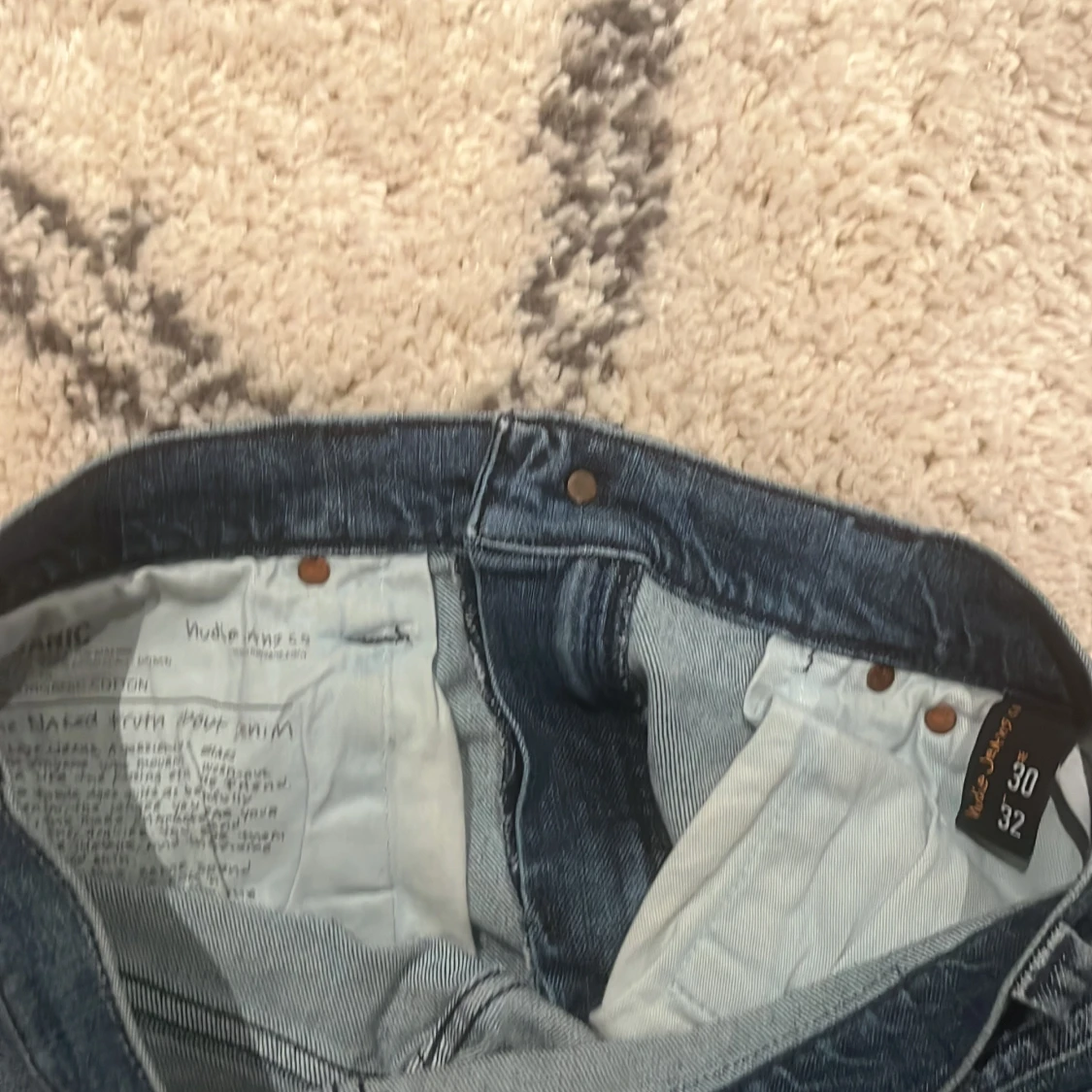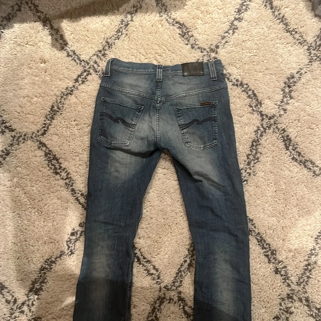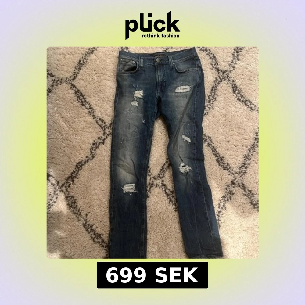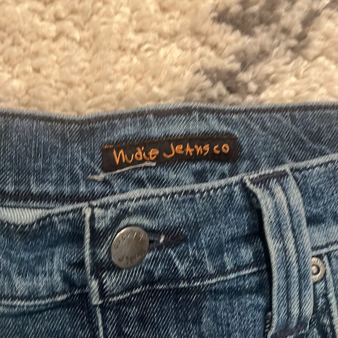 Säljer ett par blå jeans från Nudie Jeans med flera slitningar och lagade detaljer framtill. Klassisk femficksmodell med raka ben och normal passform. Perfekta för dig som gillar en lite ruffare stil. Skick 9/10