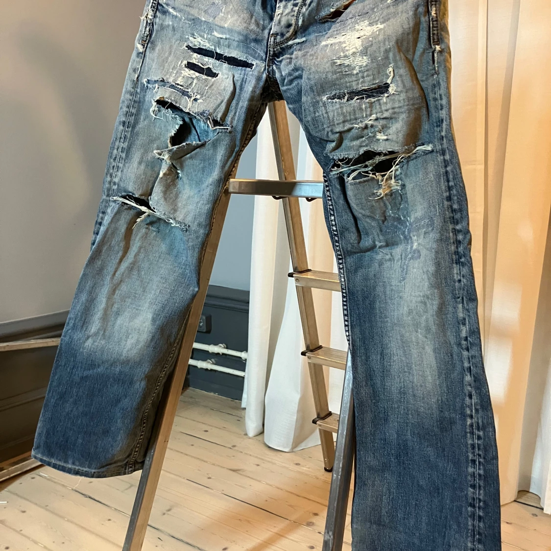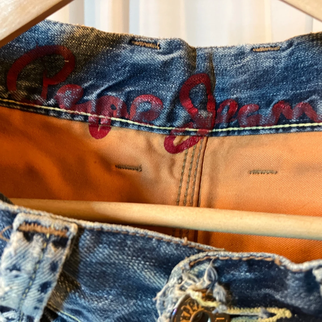 Säljer ett par coola blå jeans från Pepe Jeans med slitna detaljer och en avslappnad look. Perfekta för en trendig och avslappnad stil. De har en klassisk femficksdesign och knappgylf. 31 midja 32 längd.