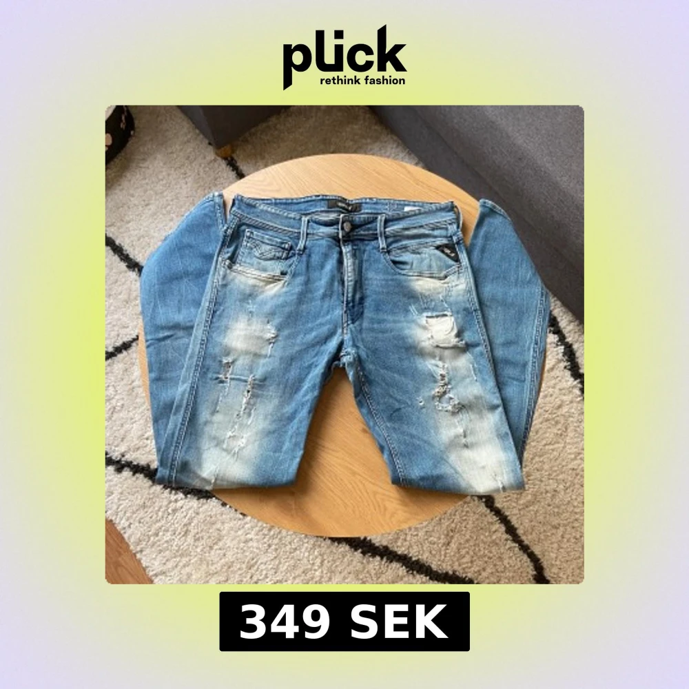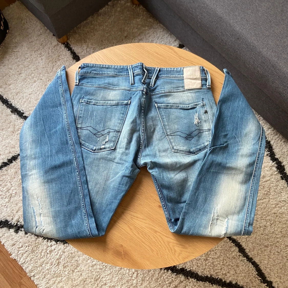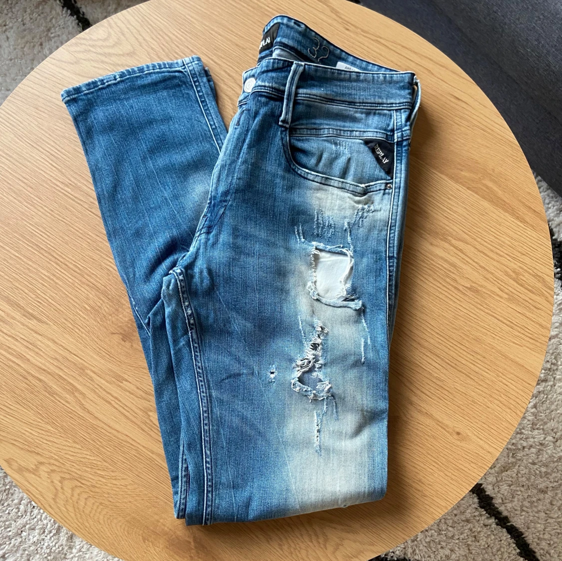 Hejsan👋 Säljer ett par blå jeans från Replay med slitningar och ljusa partier framtill i Anbass modell.👖 Klassisk femficksmodell med dragkedja och knapp. Snygga detaljer på bakfickorna och patch med Replay-logga i midjan🤩 Storleken är W32 L32!📐 Pris kan diskuteras vid snabb affär!💸 Vid frågor: Meddela📩
