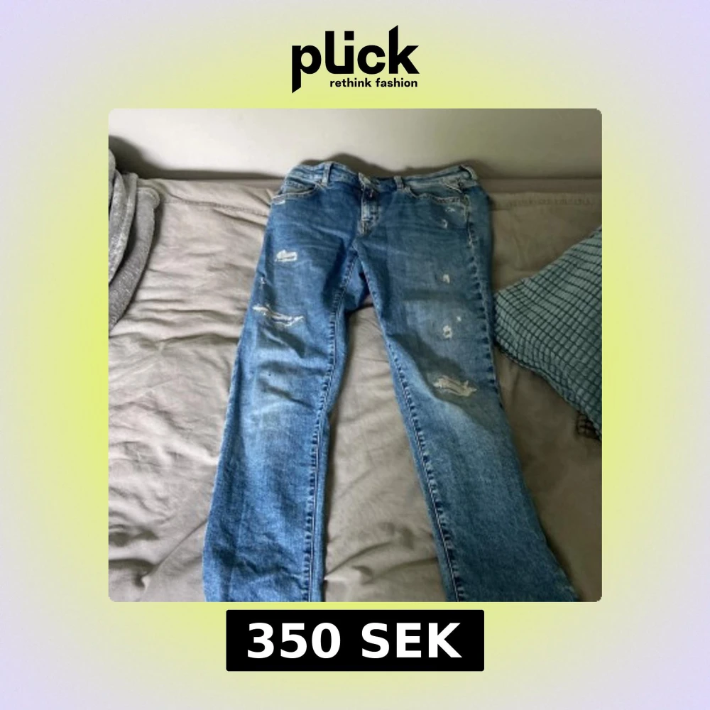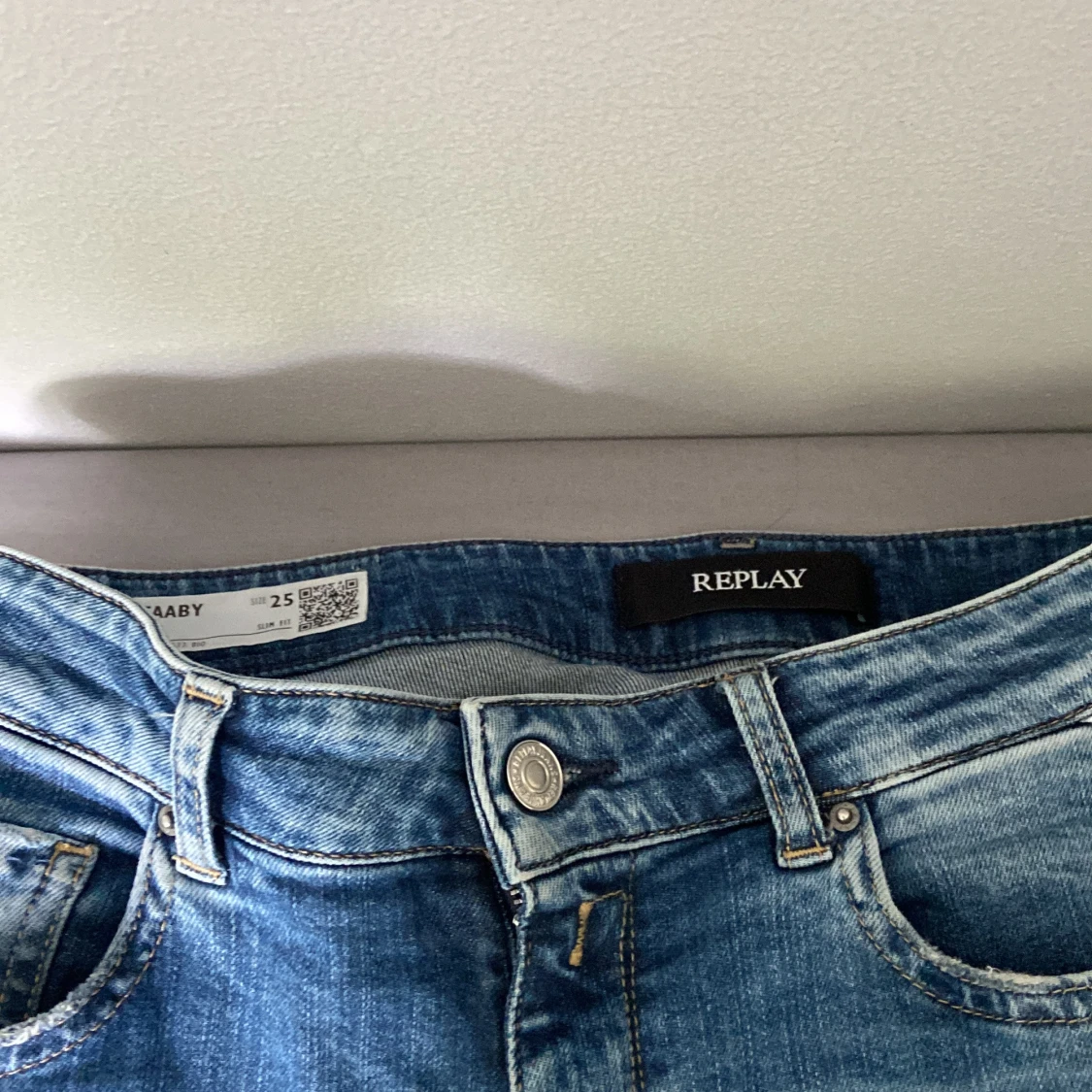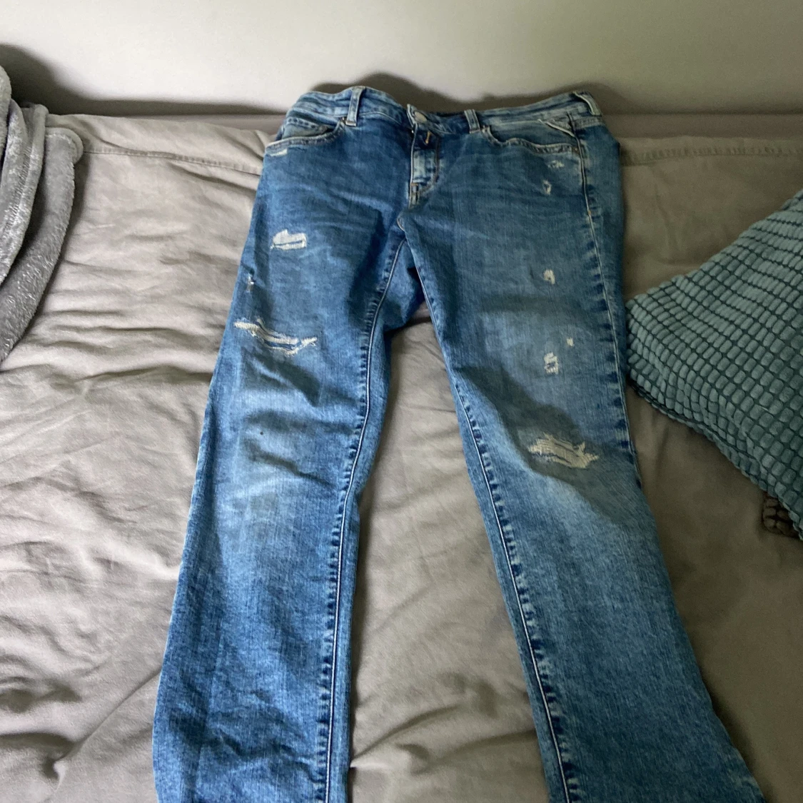 Säljer ett par blå jeans från Replay med slitna detaljer och klassisk femficksmodell. Jeansen har normal passform och raka ben. Perfekta för en avslappnad stil och passar till det mesta.