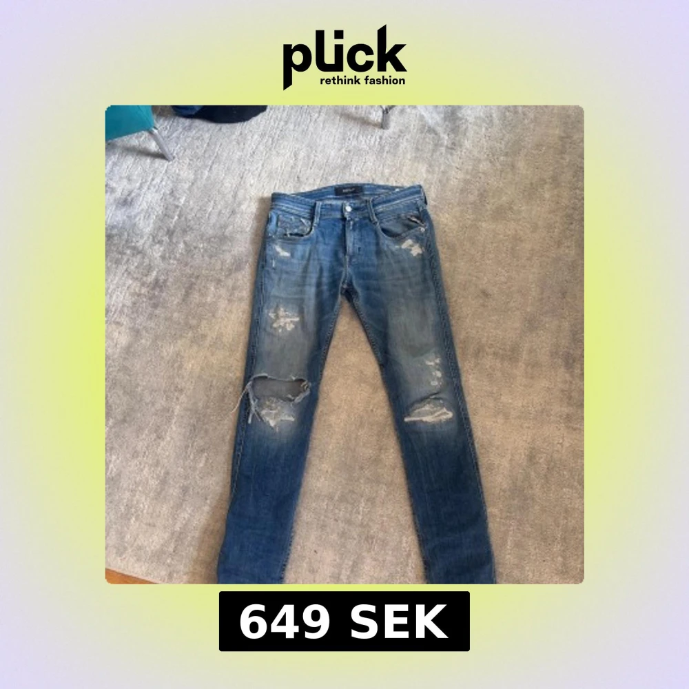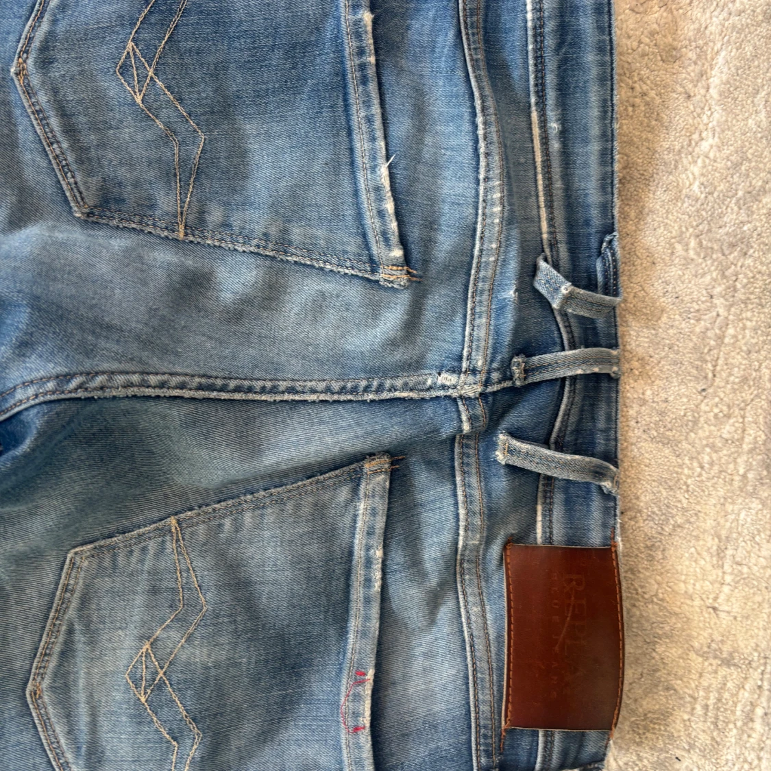 Säljer ett par blå skinny jeans från Replay med snygga slitningar och hål på benen. Jeansen har klassisk femficksdesign, låg midja och är tillverkade i mjukt denimtyg. Perfekta för dig som gillar en avslappnad och trendig look.