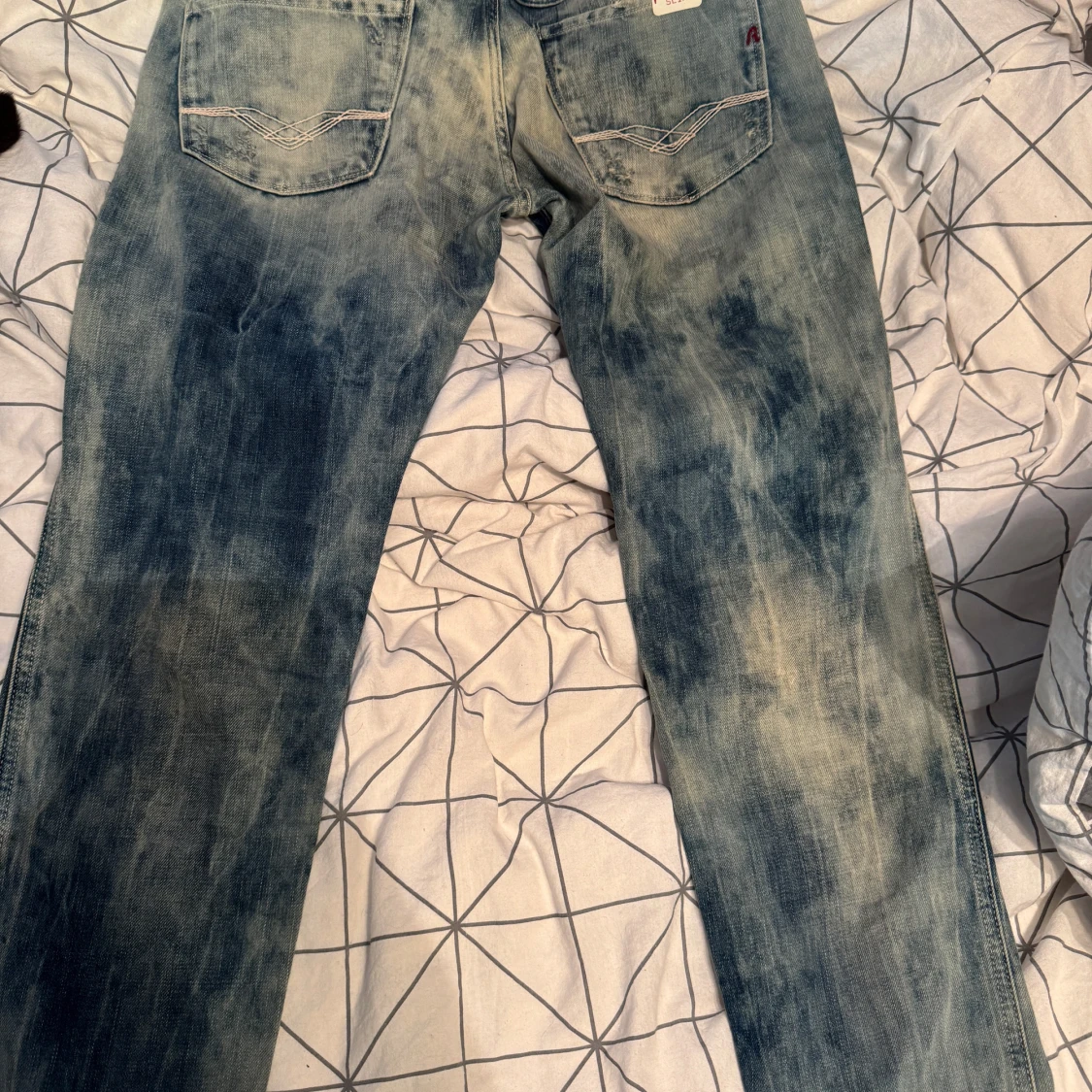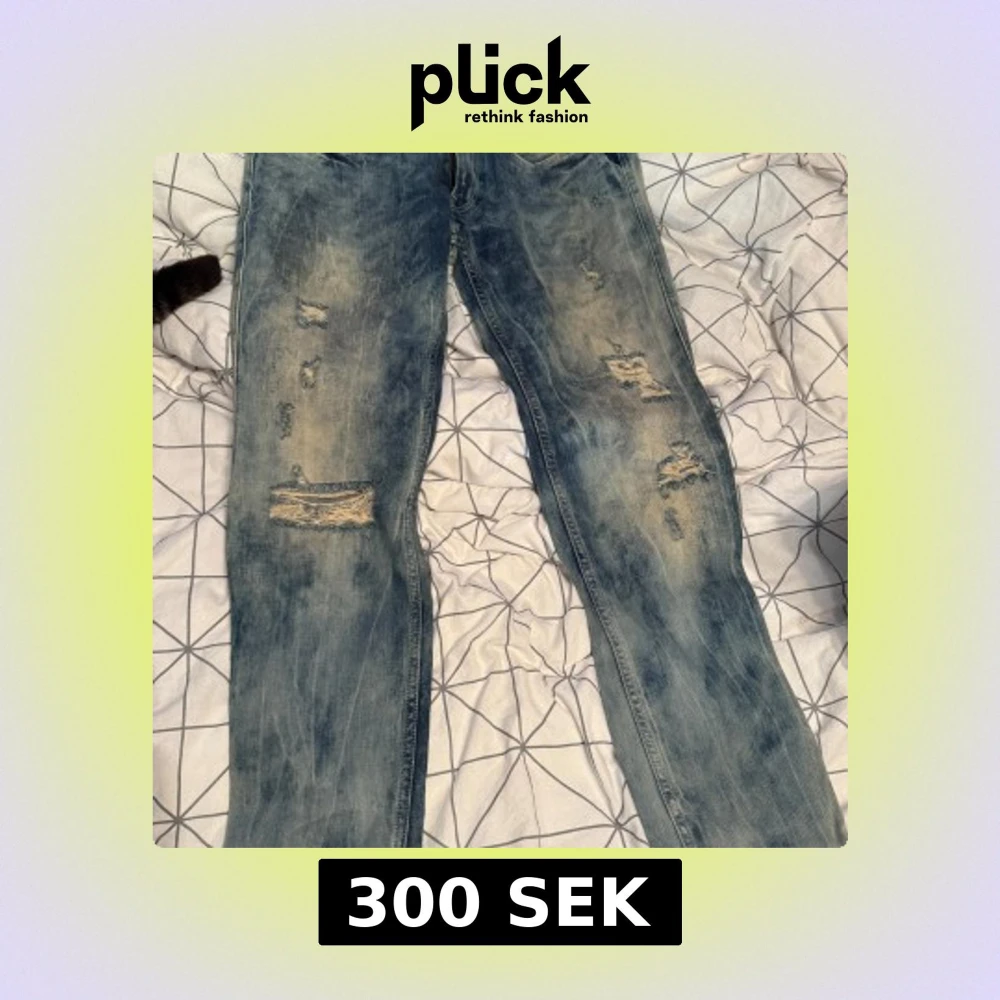 Säljer ett par blå jeans från Replay med slitna detaljer och hål framtill. Jeansen har en tvättad look med ljusa partier och raka ben. Klassisk femficksmodell och tydliga sömmar på bakfickorna. Perfekta för en avslappnad streetstil. S