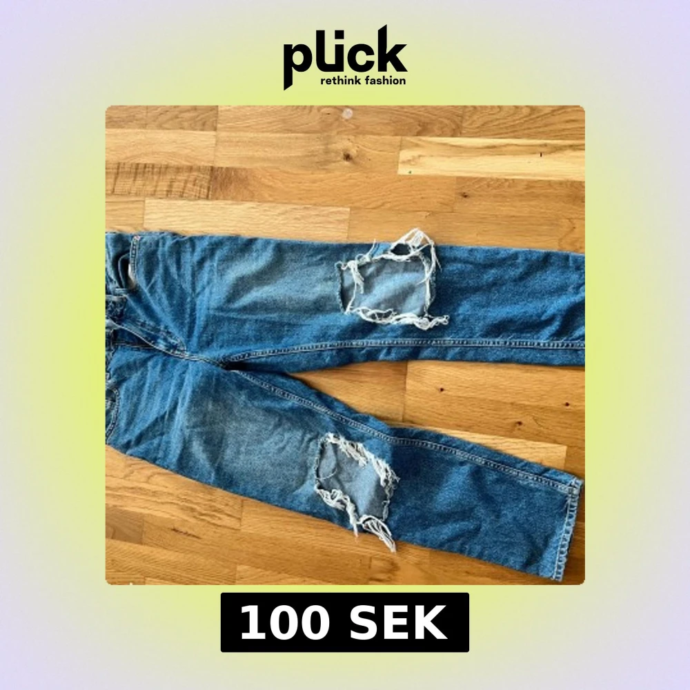 Säljer ett par blå jeans från River Island med stora slitningar på båda benen. Jeansen har klassisk femficksdesign och raka ben. Perfekta för en avslappnad look.